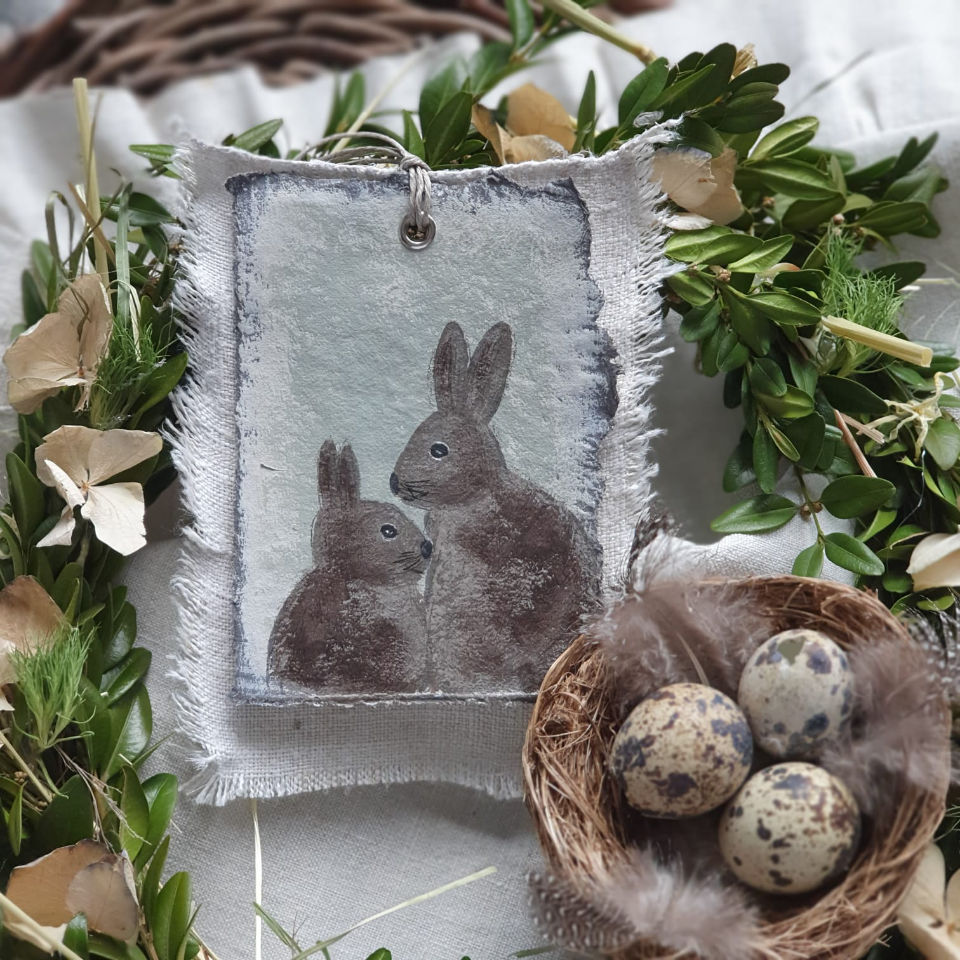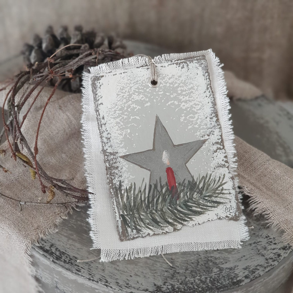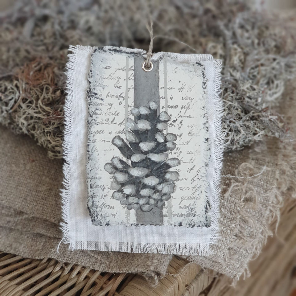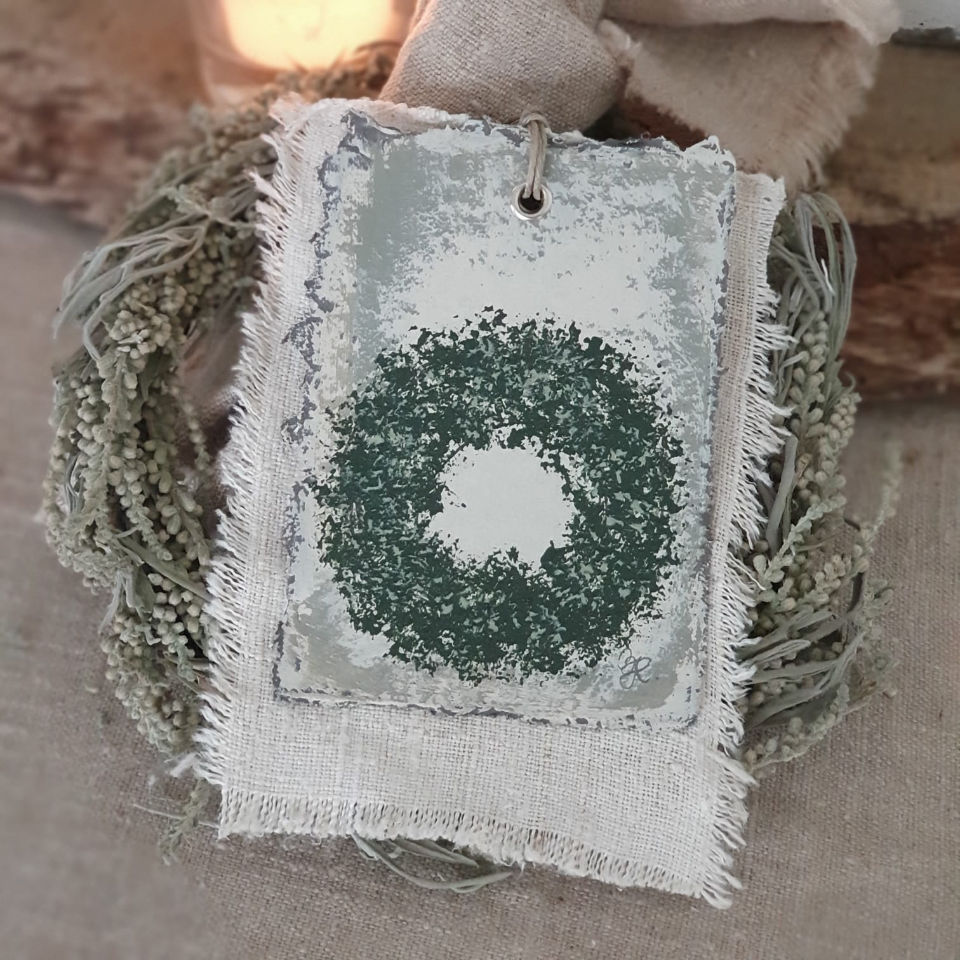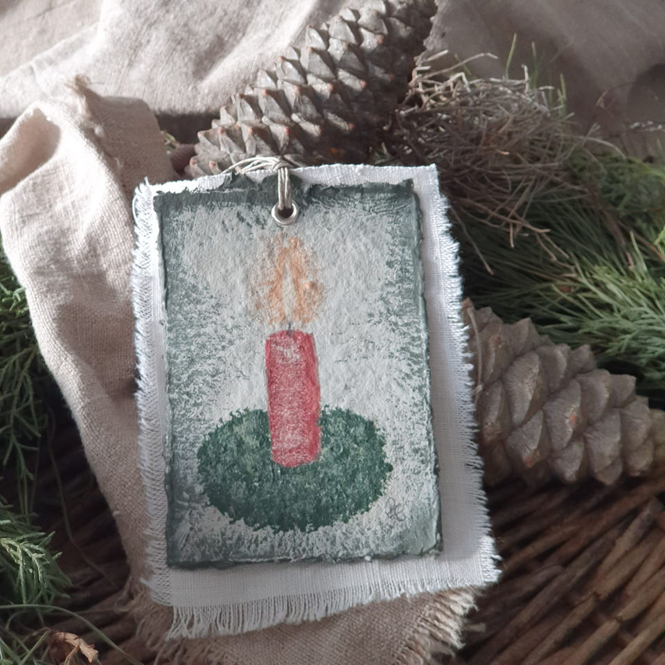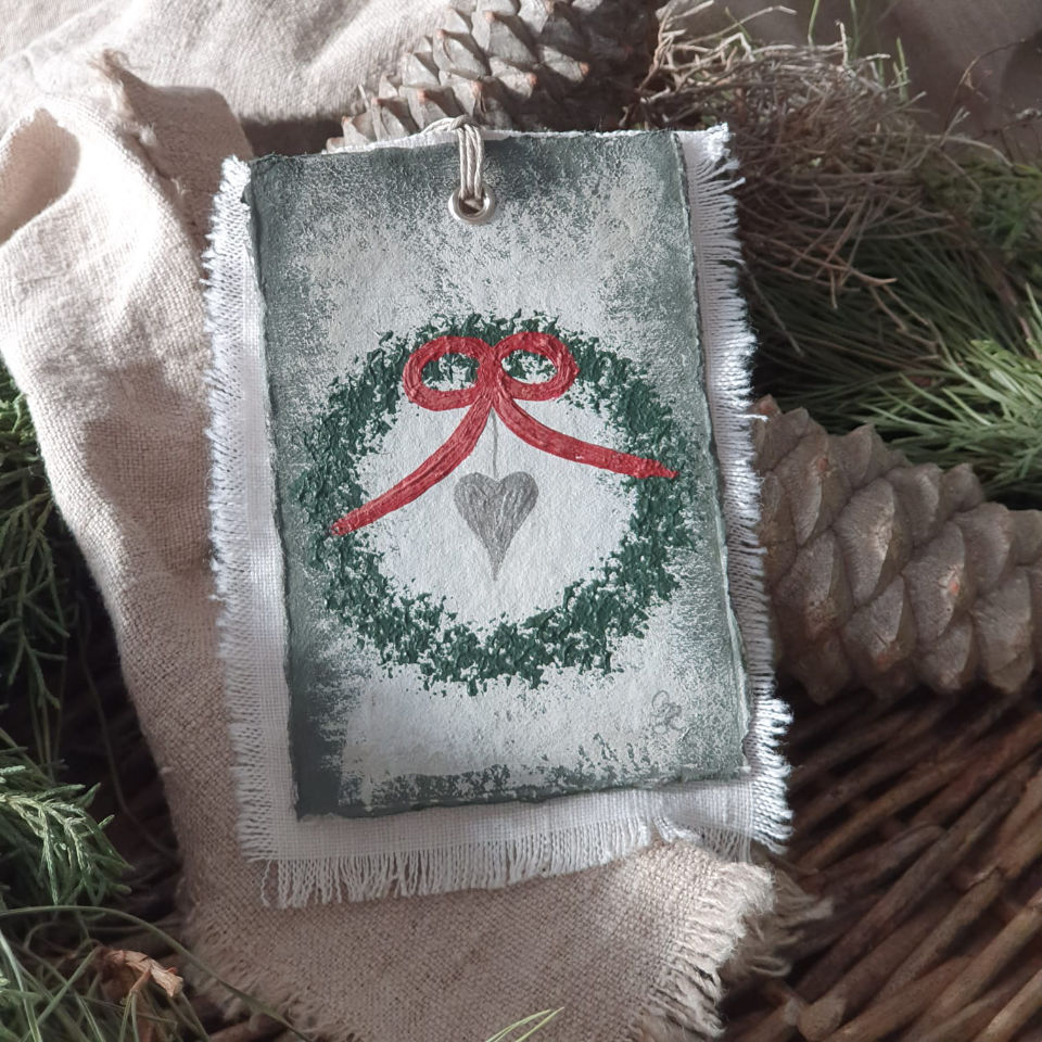 Handgemalte Leinenanhänger auf handgeschöpftem Büttenpapier sind von meinen Holzbildern inspiriert.