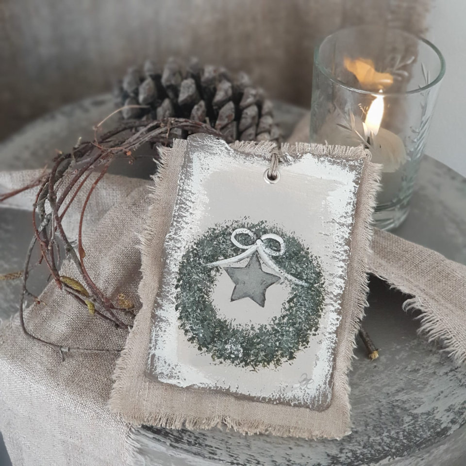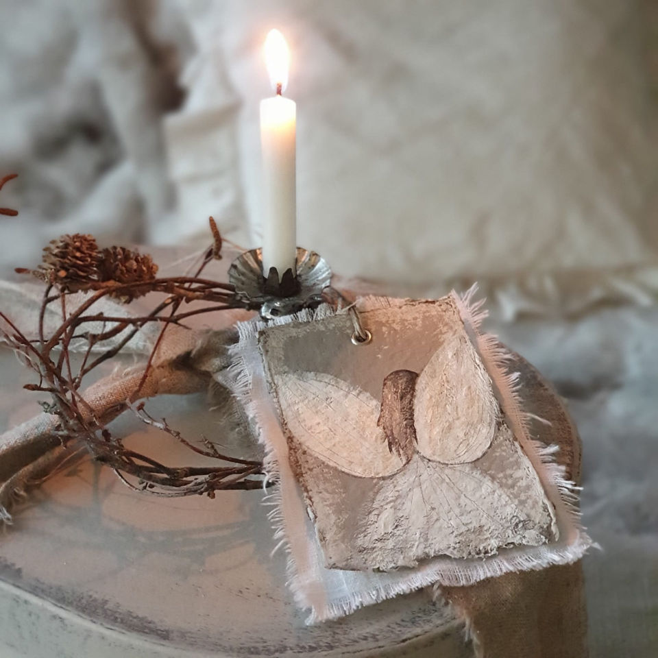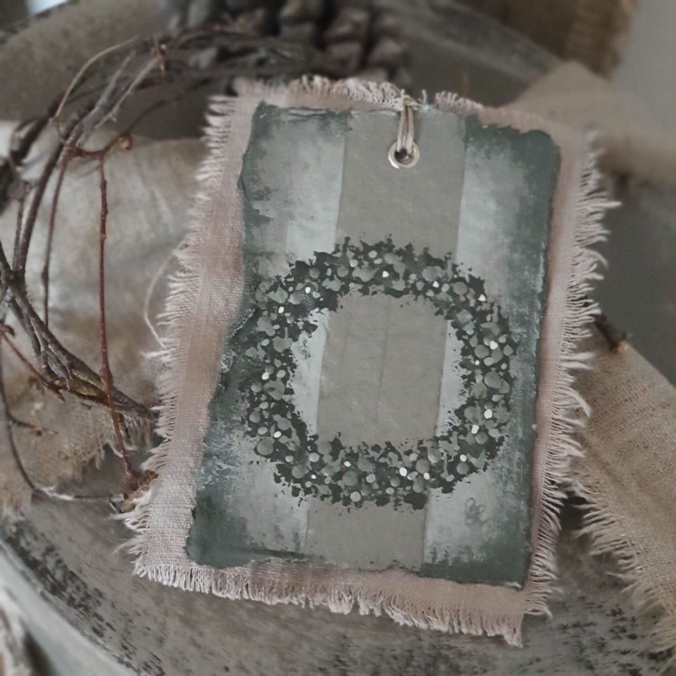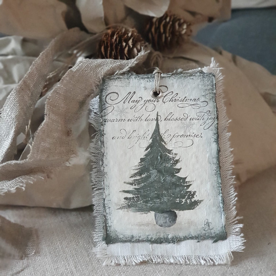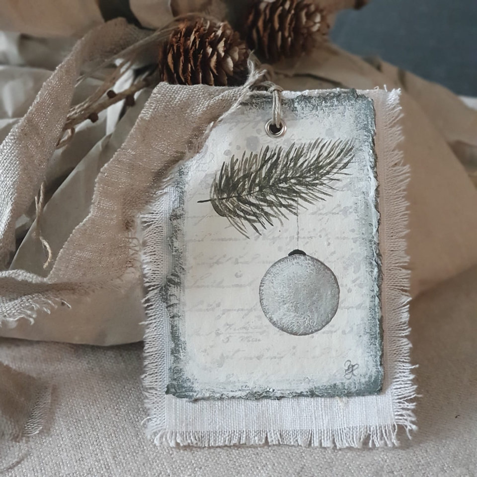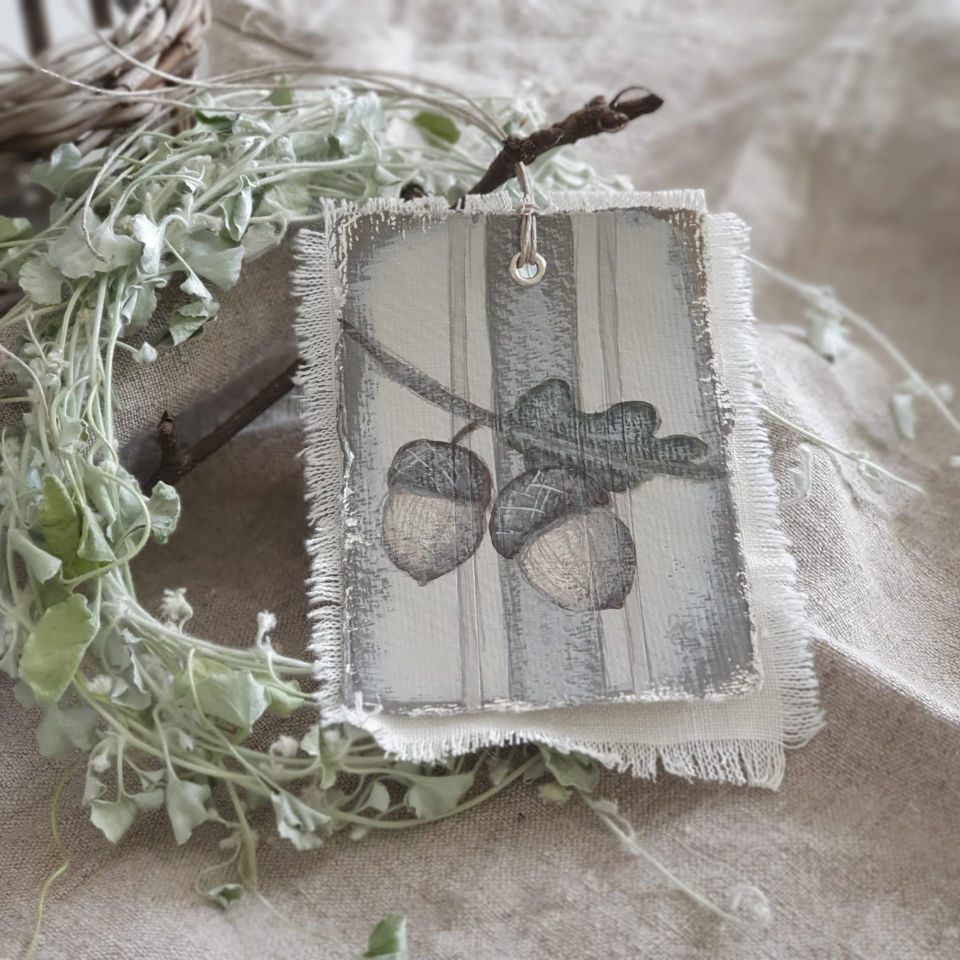 Handgemalte Leinenanhänger auf handgeschöpftem Büttenpapier sind von meinen Holzbildern inspiriert.