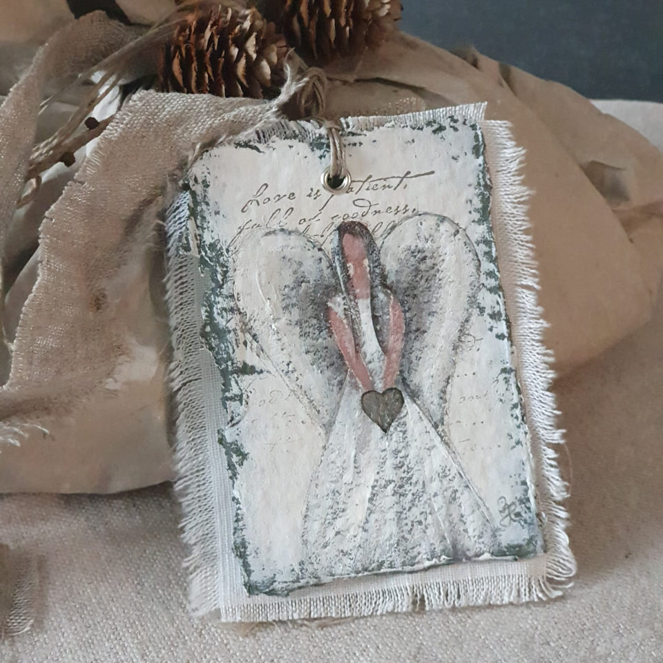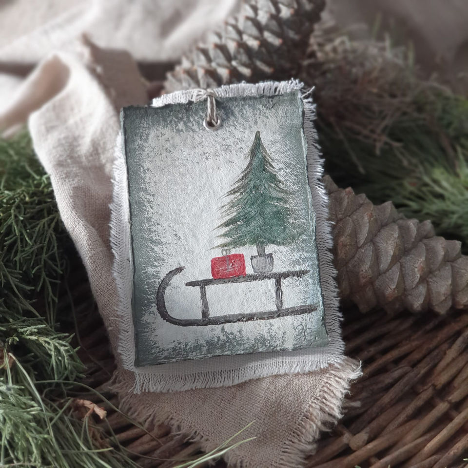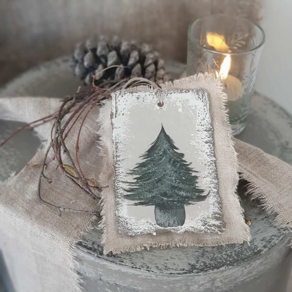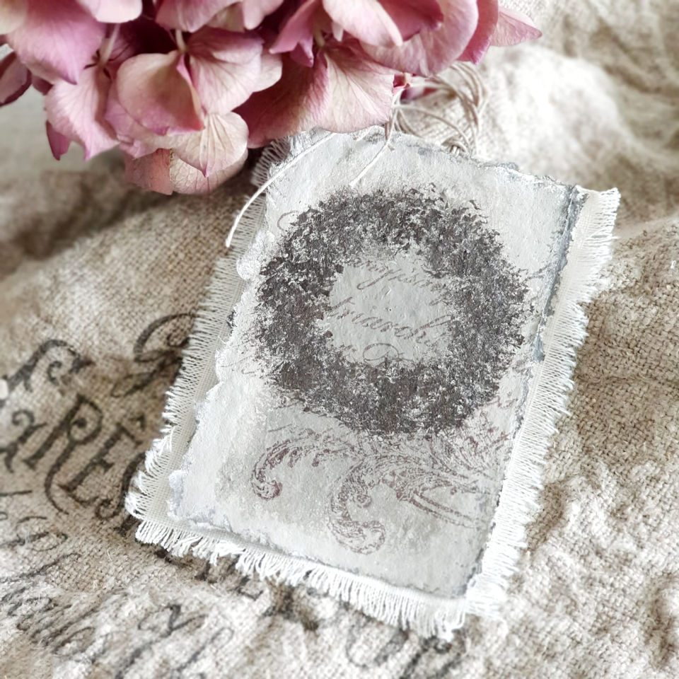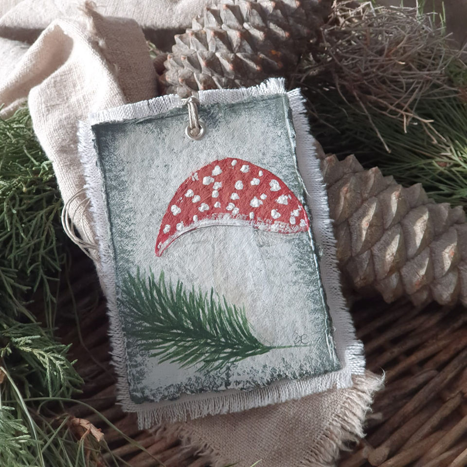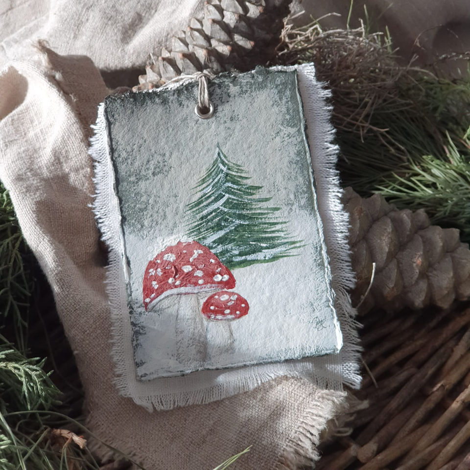 Handgemalte Leinenanhänger auf handgeschöpftem Büttenpapier sind von meinen Holzbildern inspiriert.