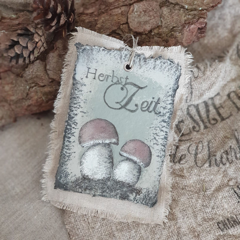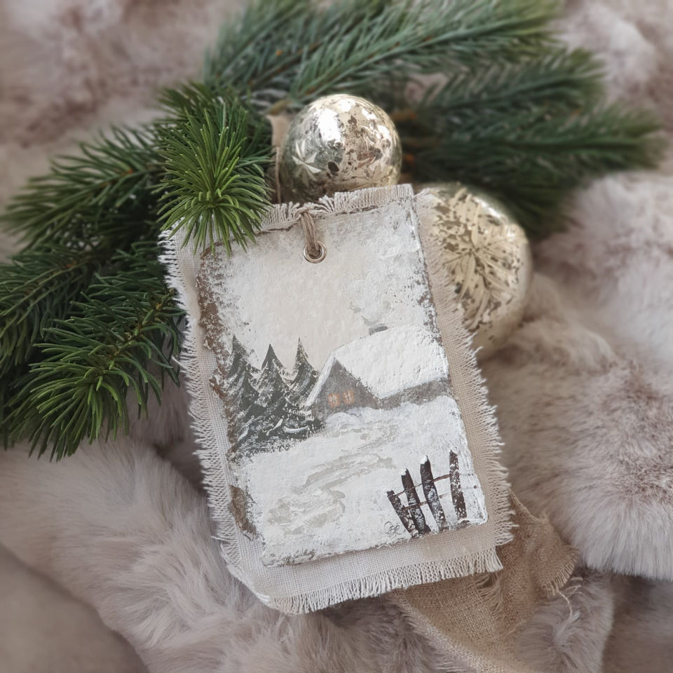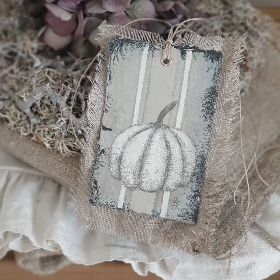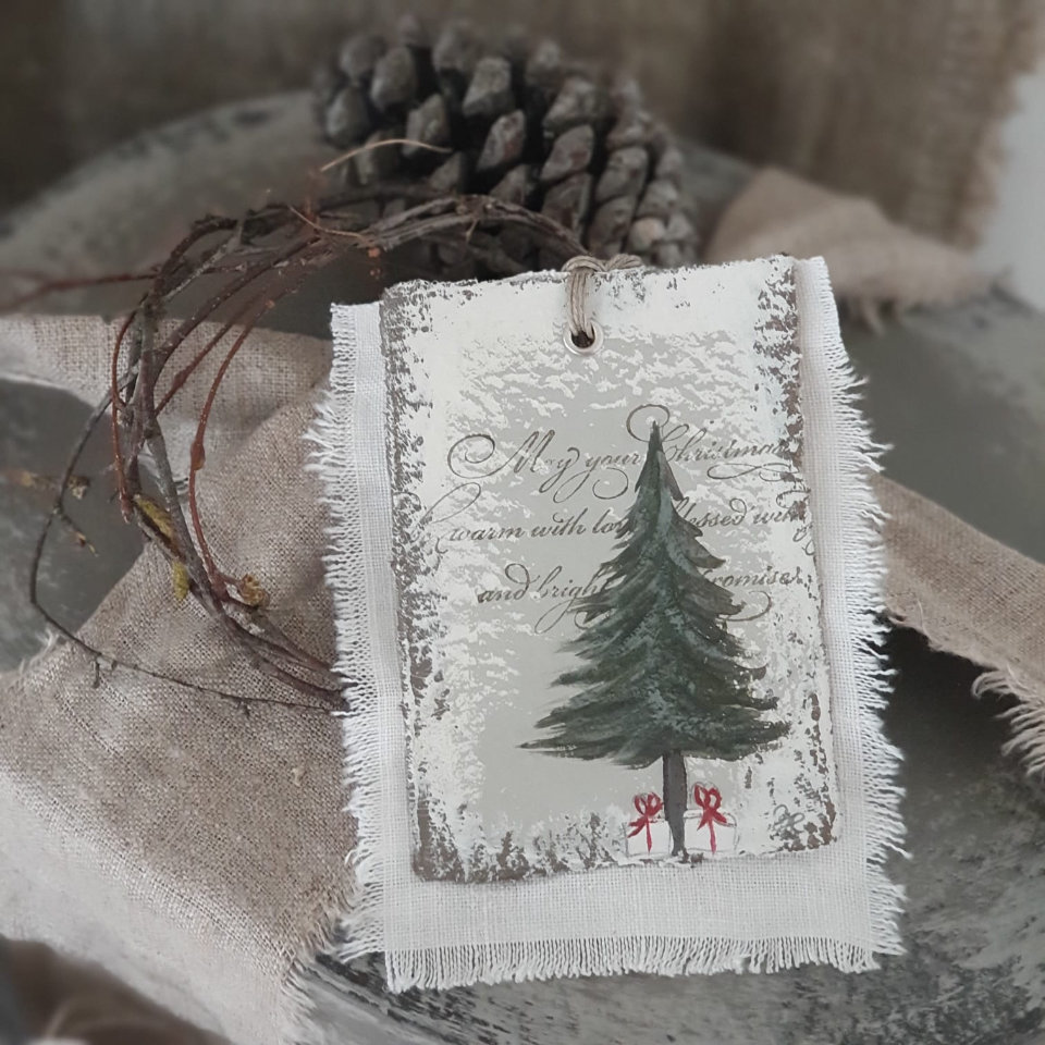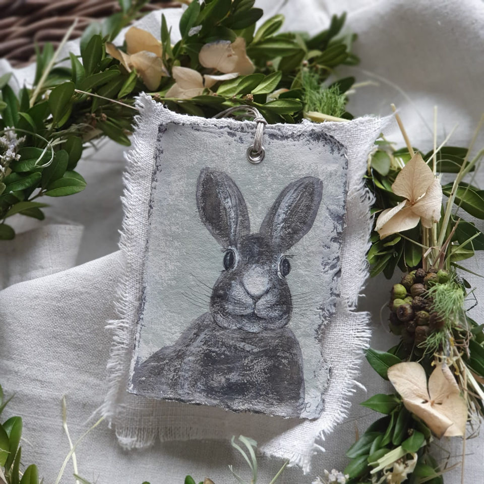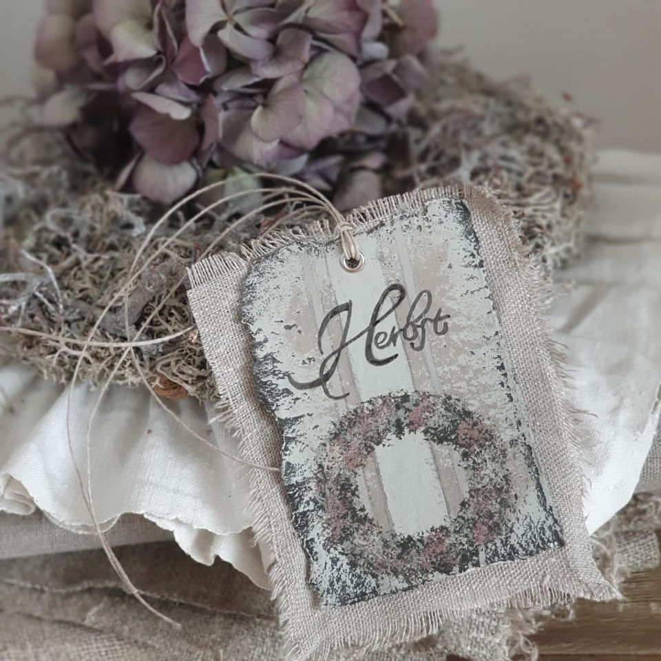 Handgemalte Leinenanhänger auf handgeschöpftem Büttenpapier sind von meinen Holzbildern inspiriert.