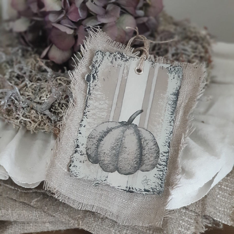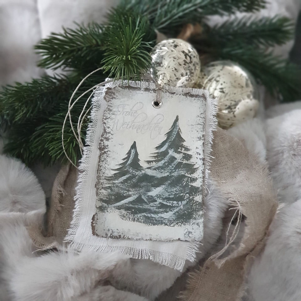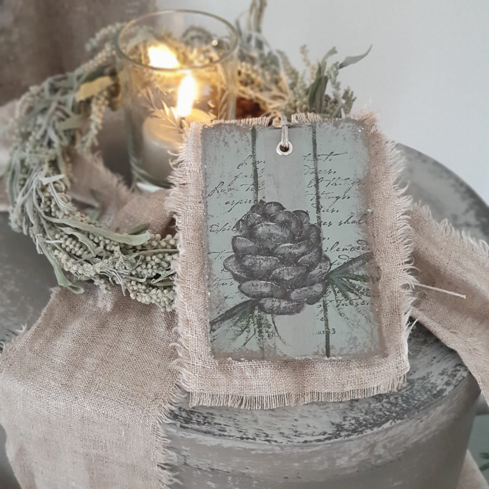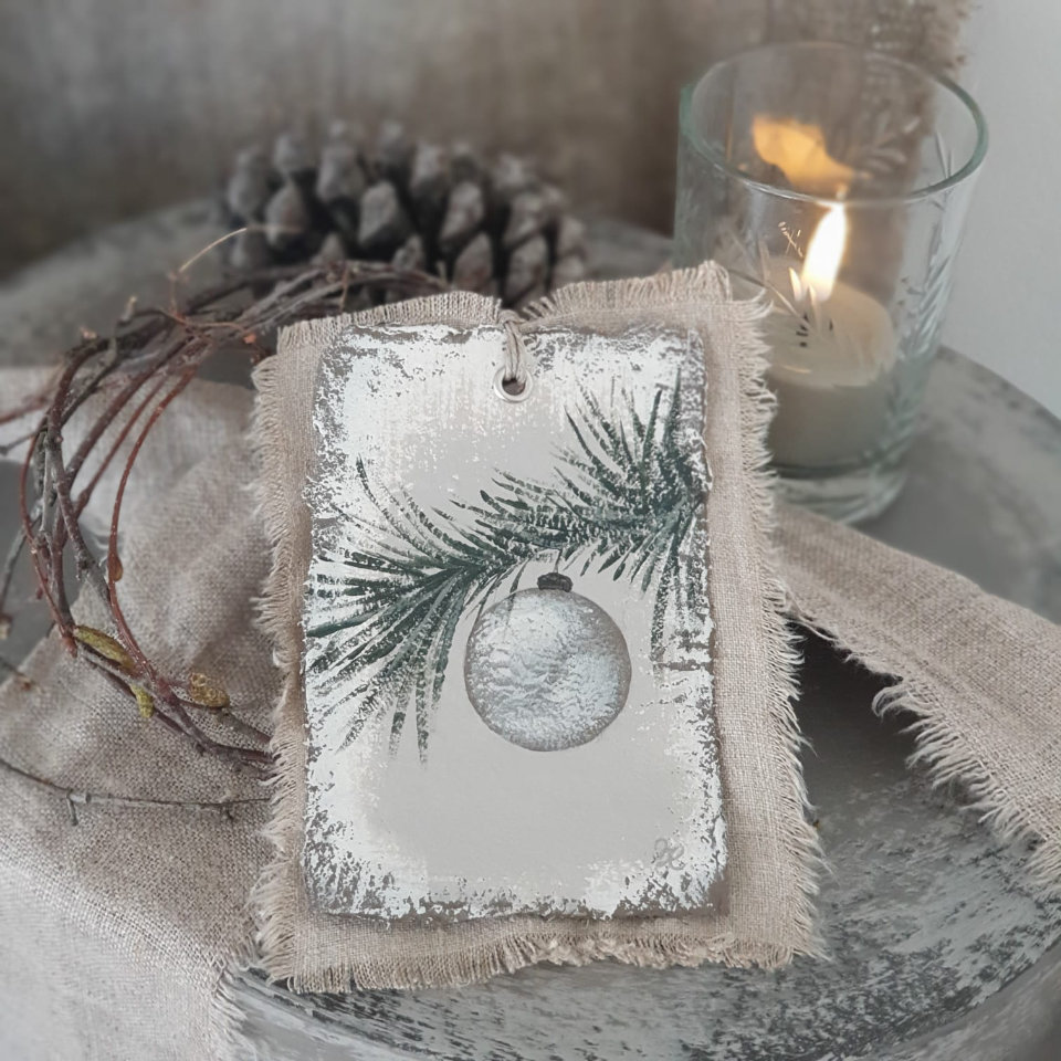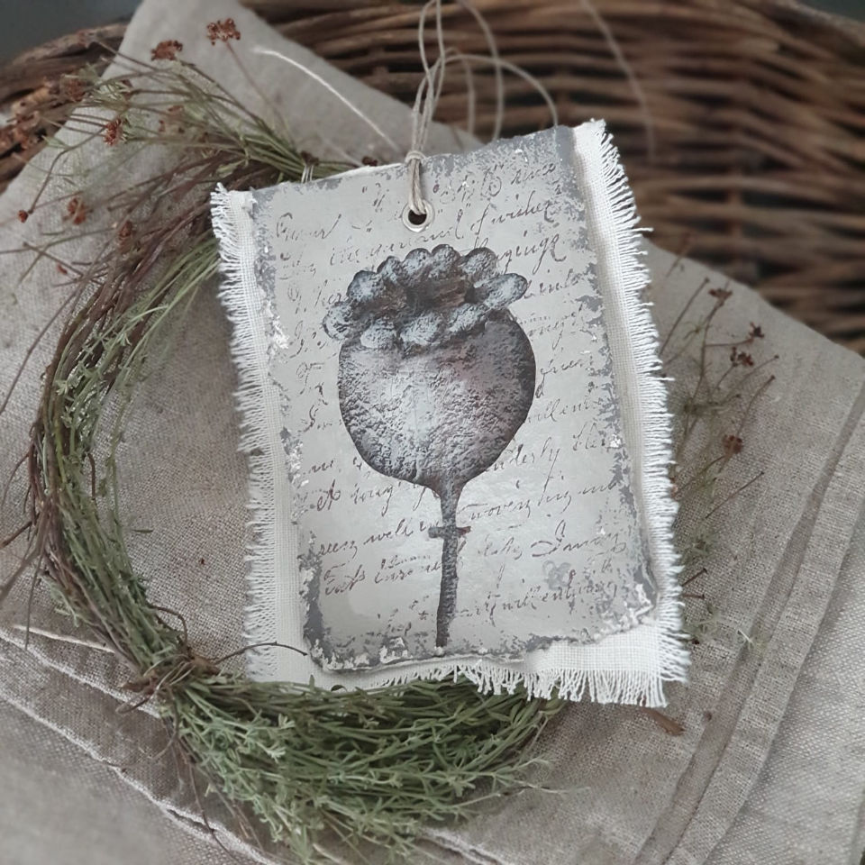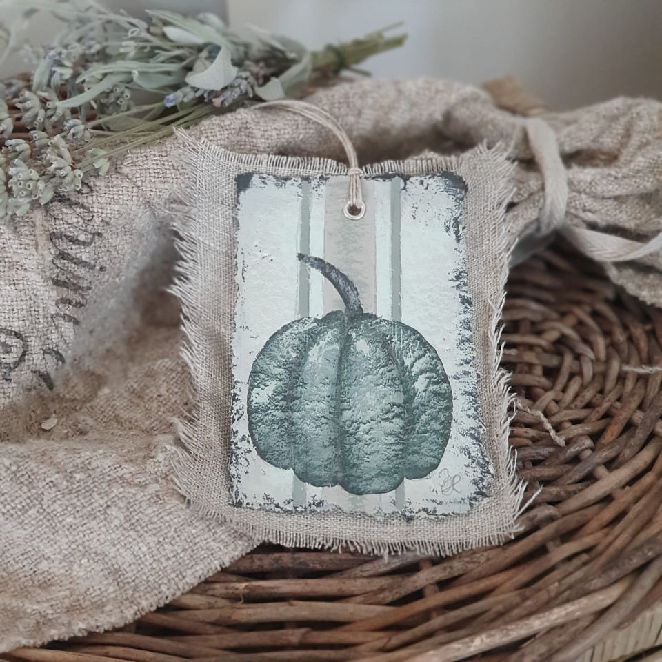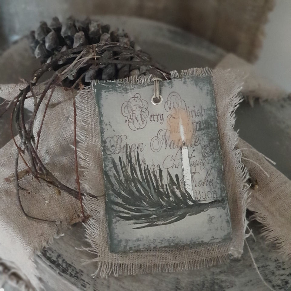 Handgemalte Leinenanhänger auf handgeschöpftem Büttenpapier sind von meinen Holzbildern inspiriert.