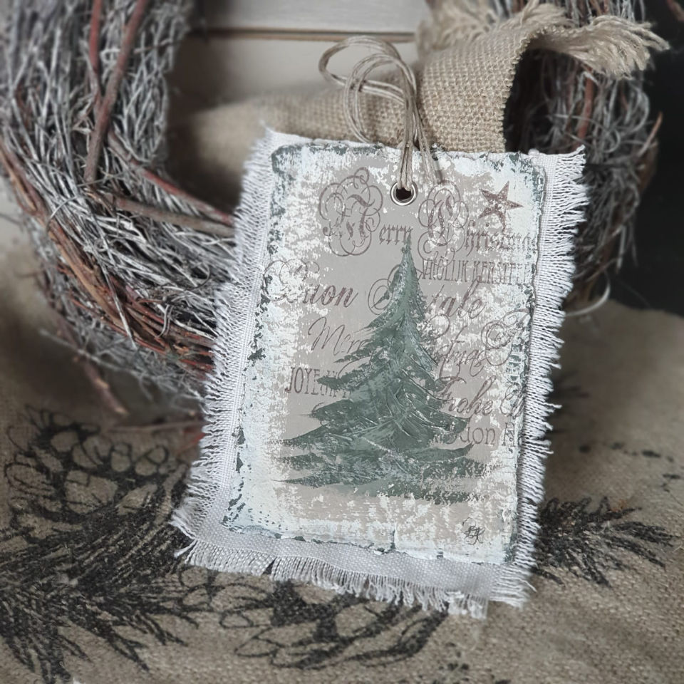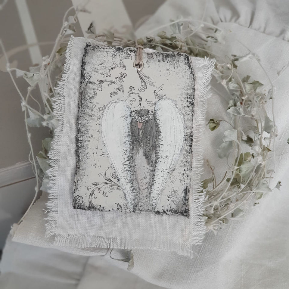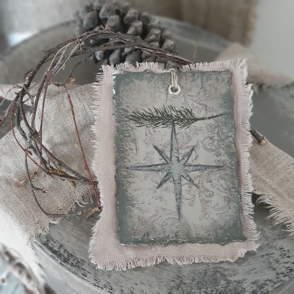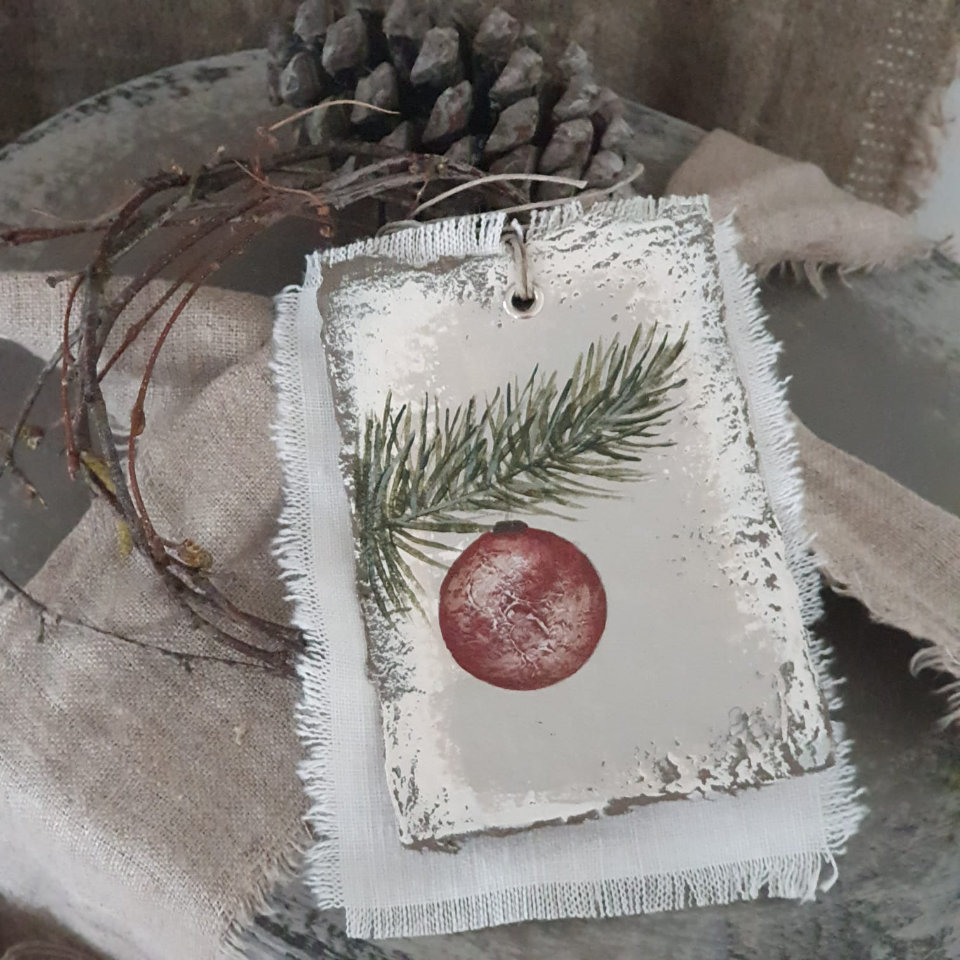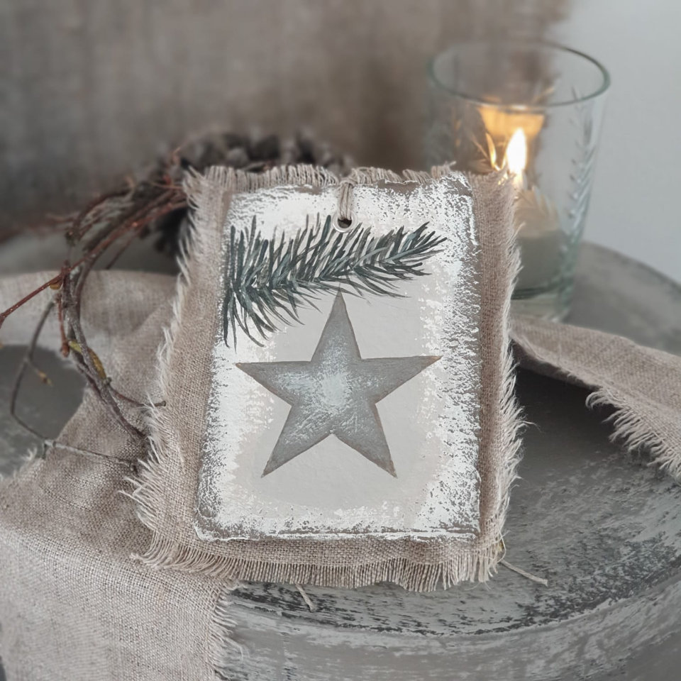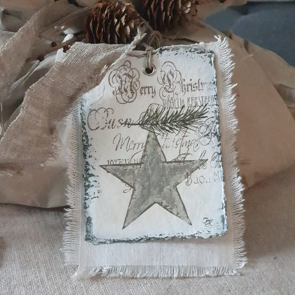 Handgemalte Leinenanhänger auf handgeschöpftem Büttenpapier sind von meinen Holzbildern inspiriert.