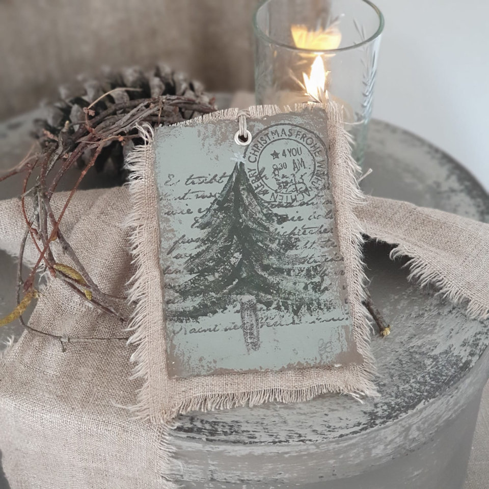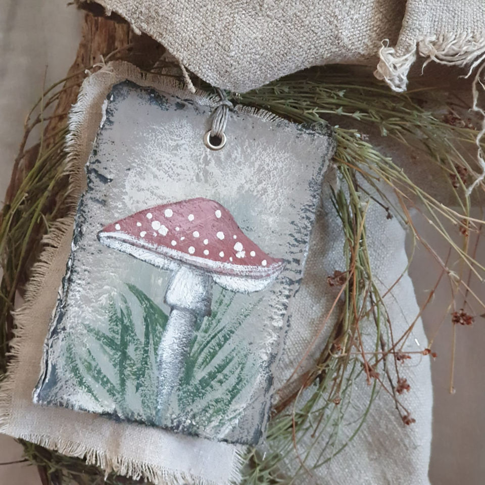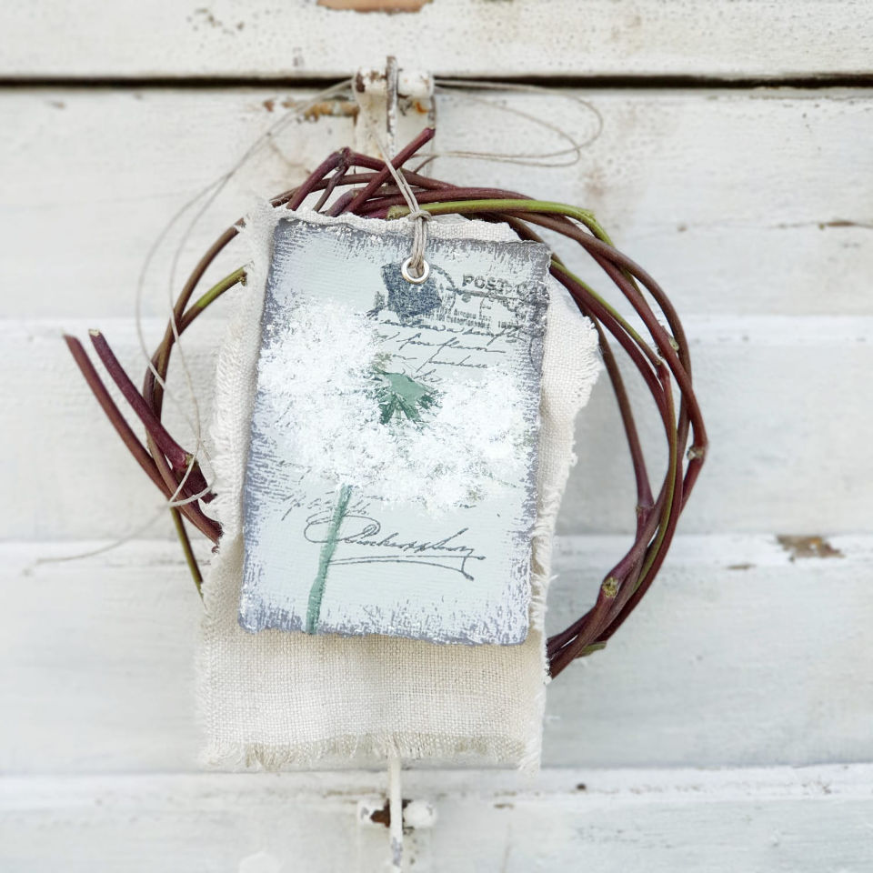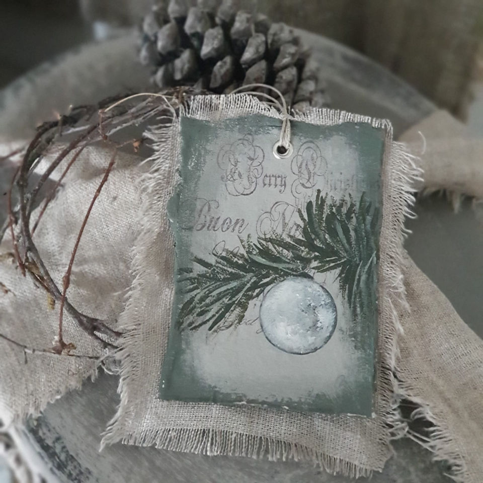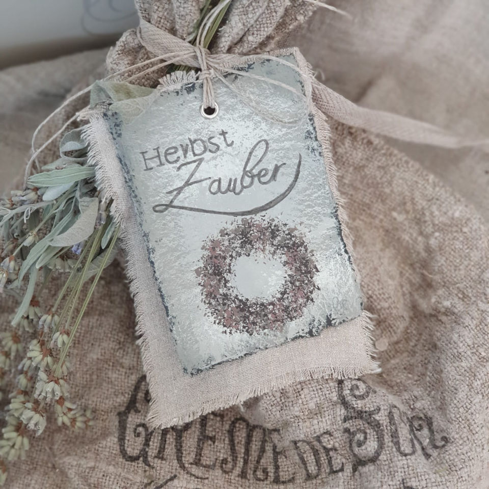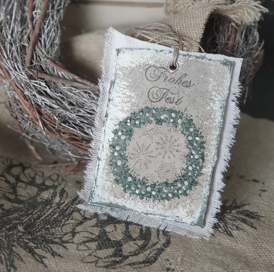 Handgemalte Leinenanhänger auf handgeschöpftem Büttenpapier sind von meinen Holzbildern inspiriert.