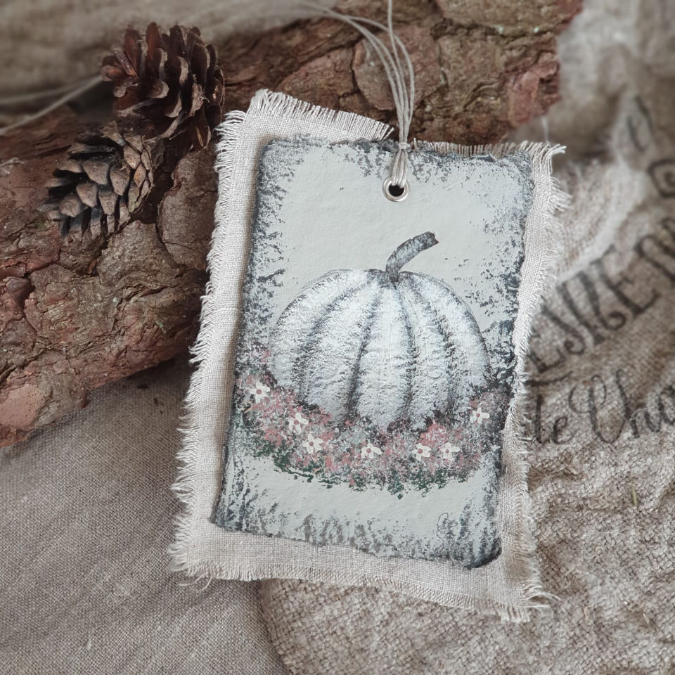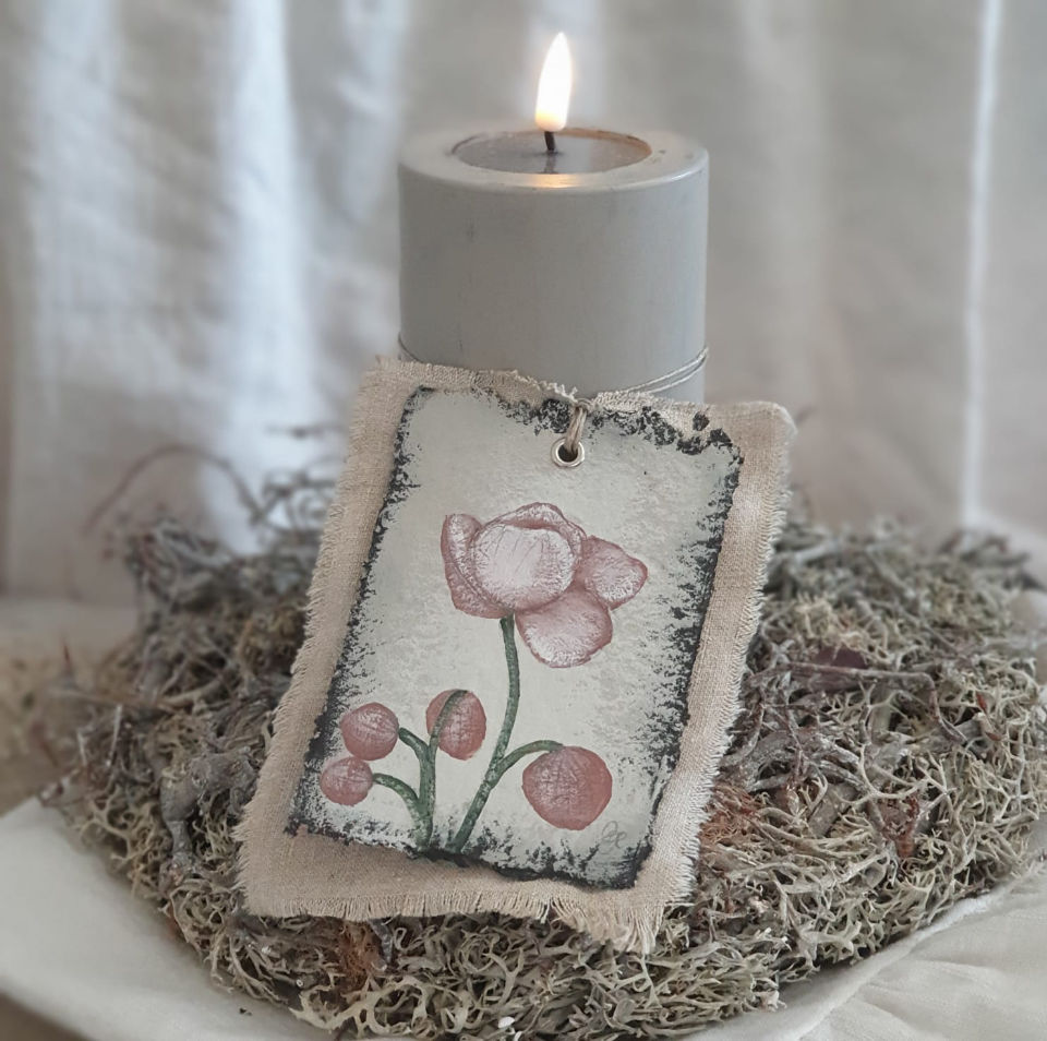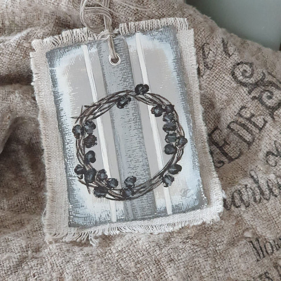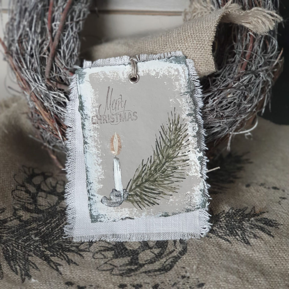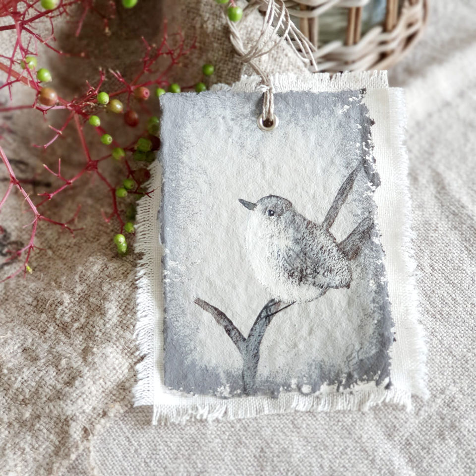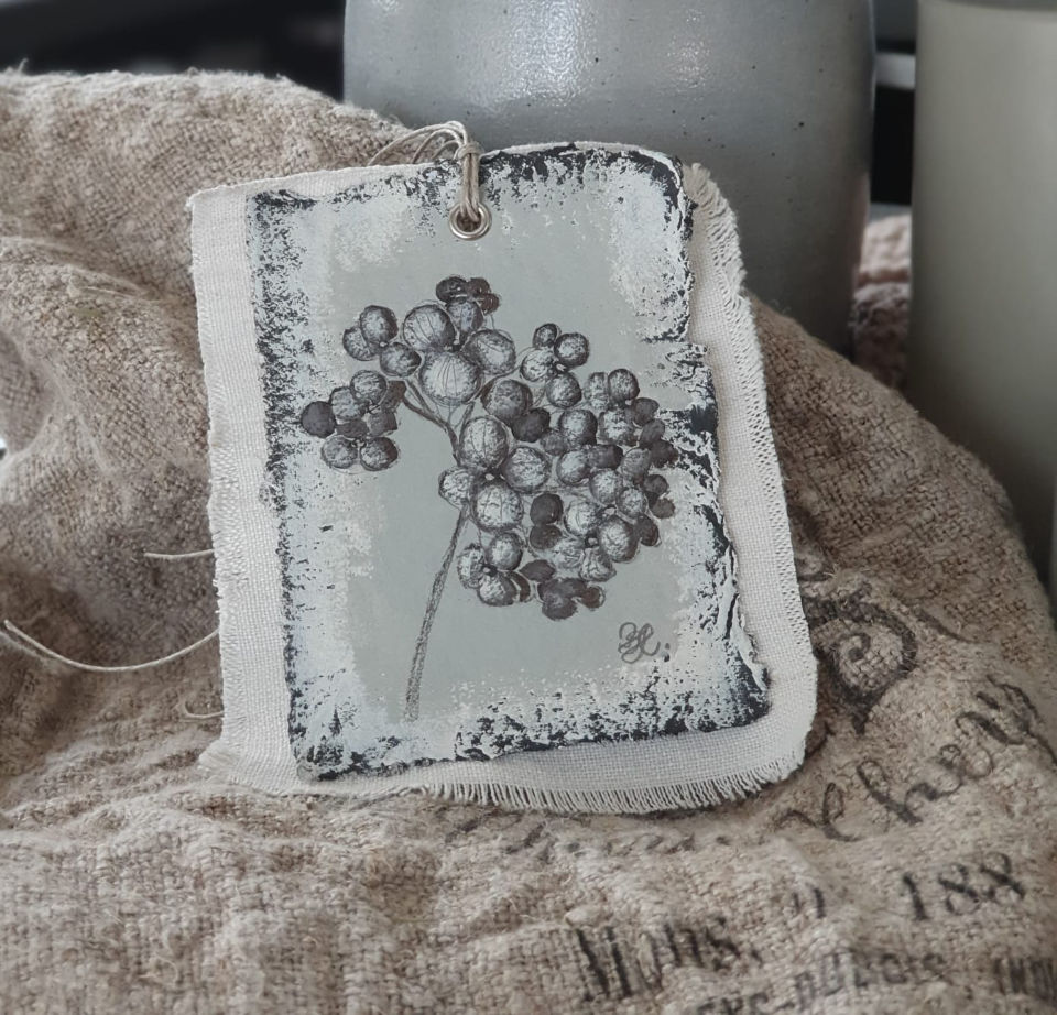 Kleine Leinenanhänger auf Büttenpapier gemalt.