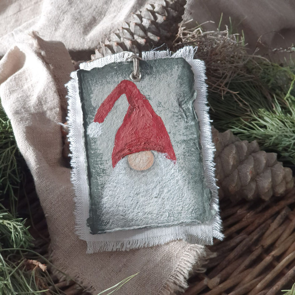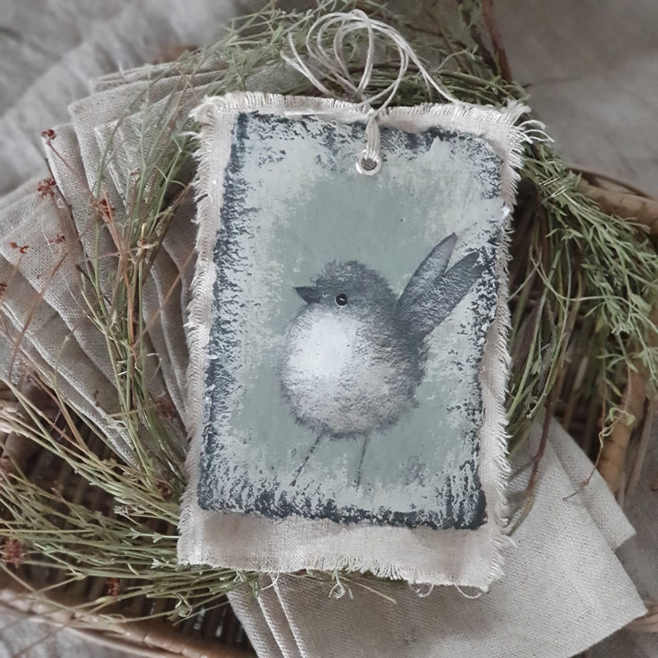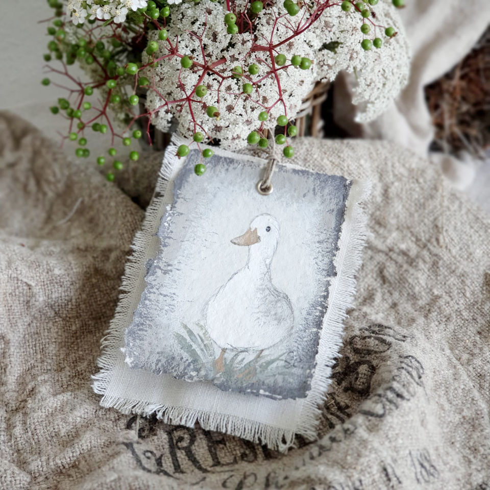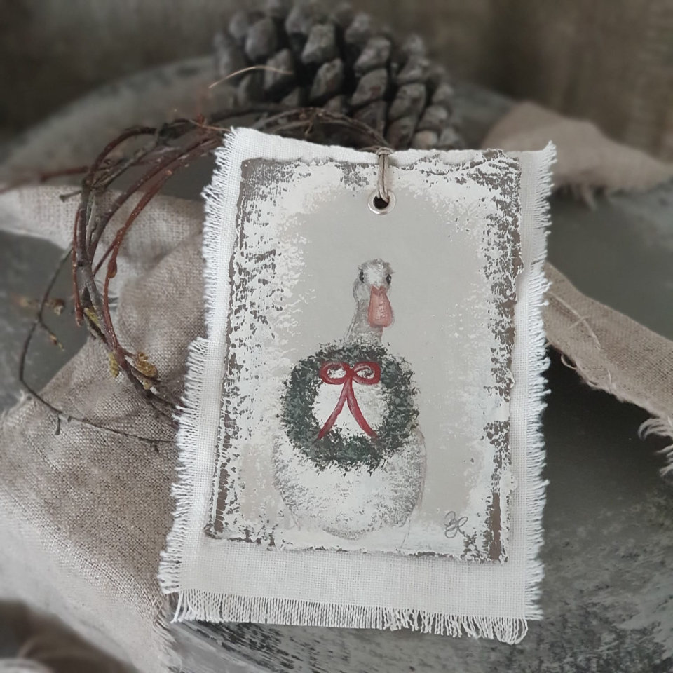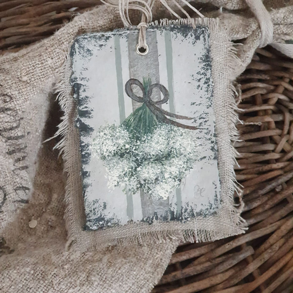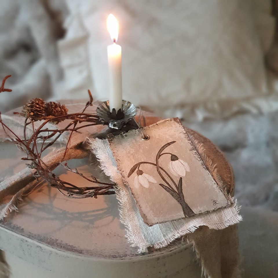Kleine Leinenanhänger auf Büttenpapier gemalt.