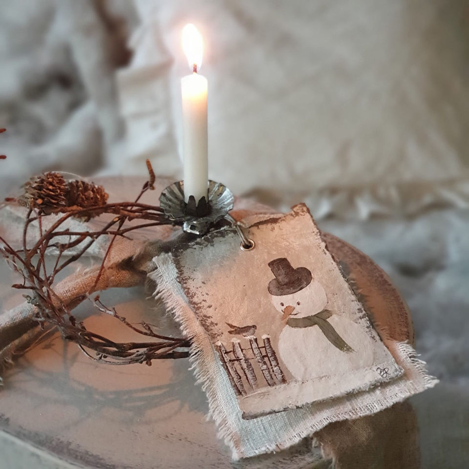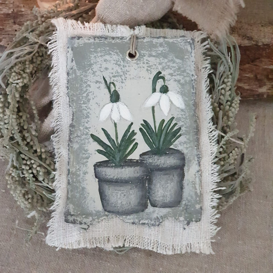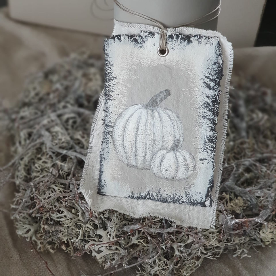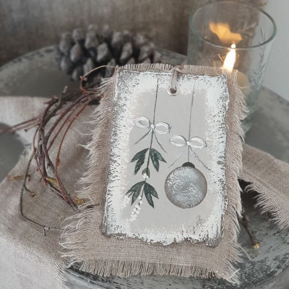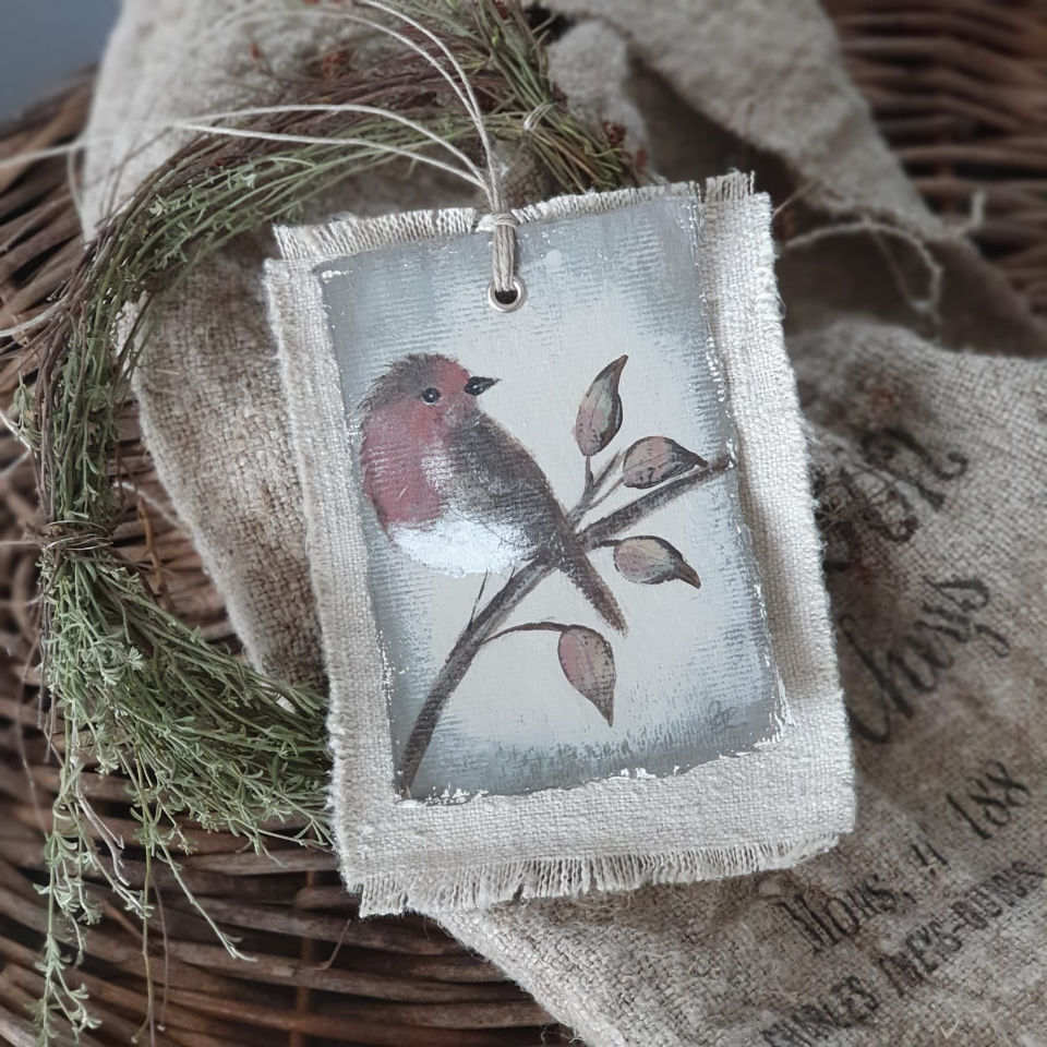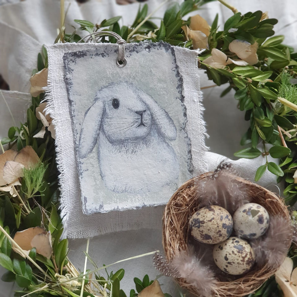 Kleine Leinenanhänger auf Büttenpapier gemalt.
