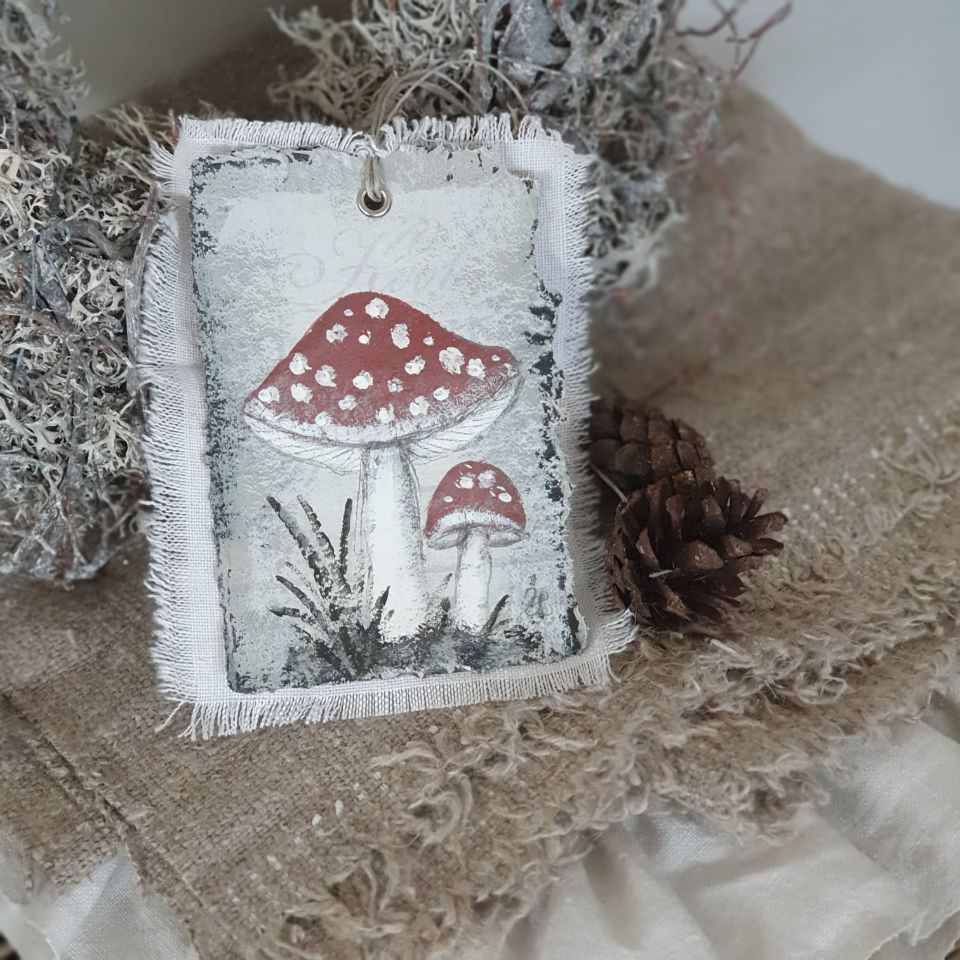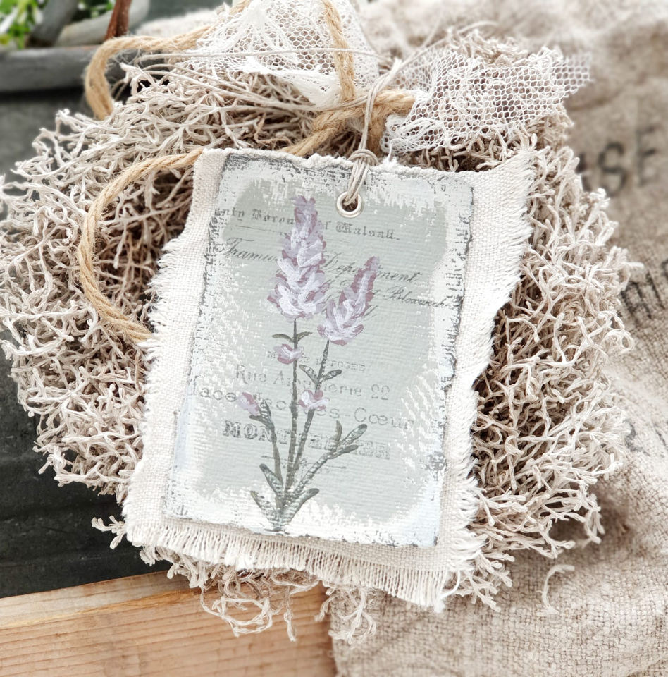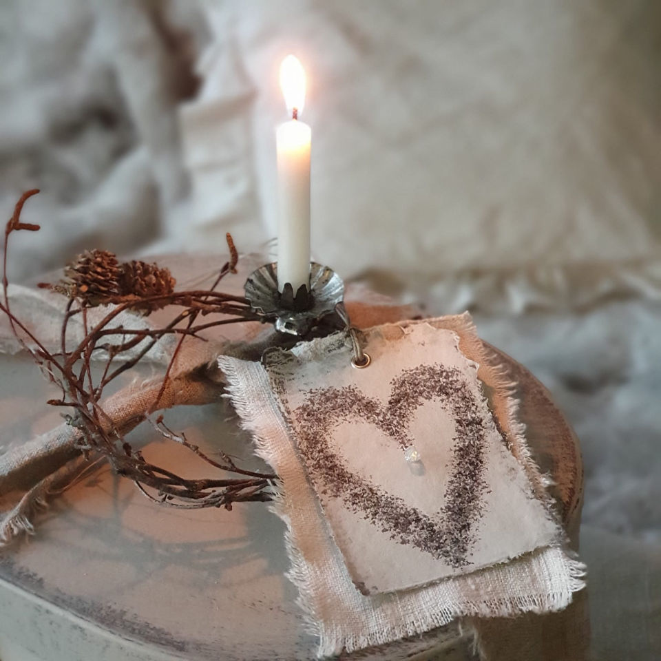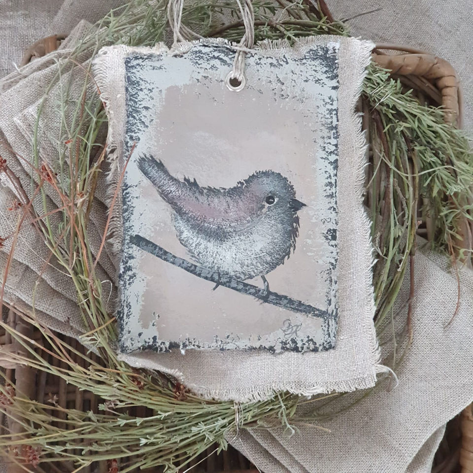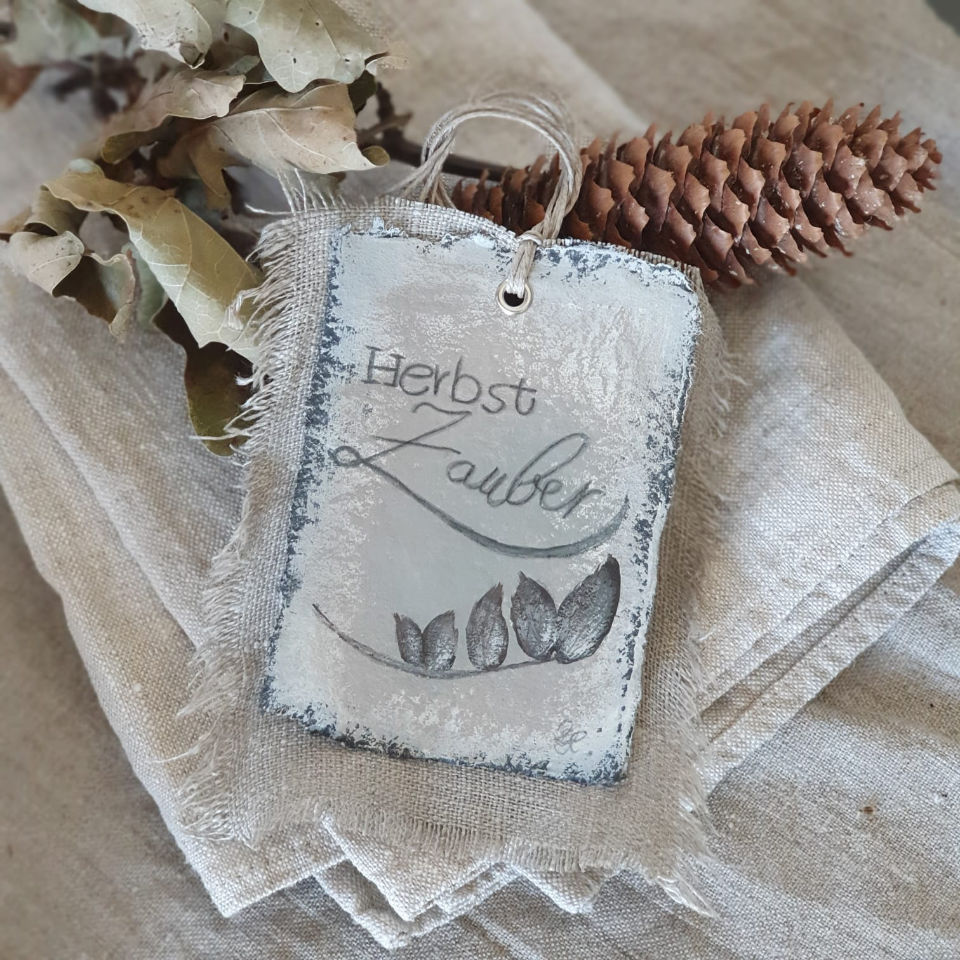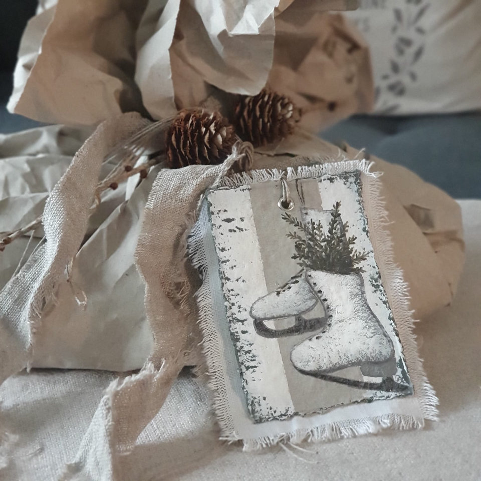Kleine Leinenanhänger auf Büttenpapier gemalt.