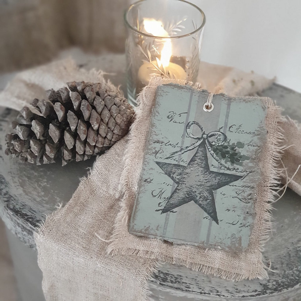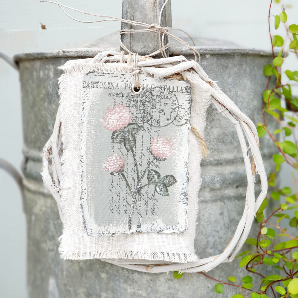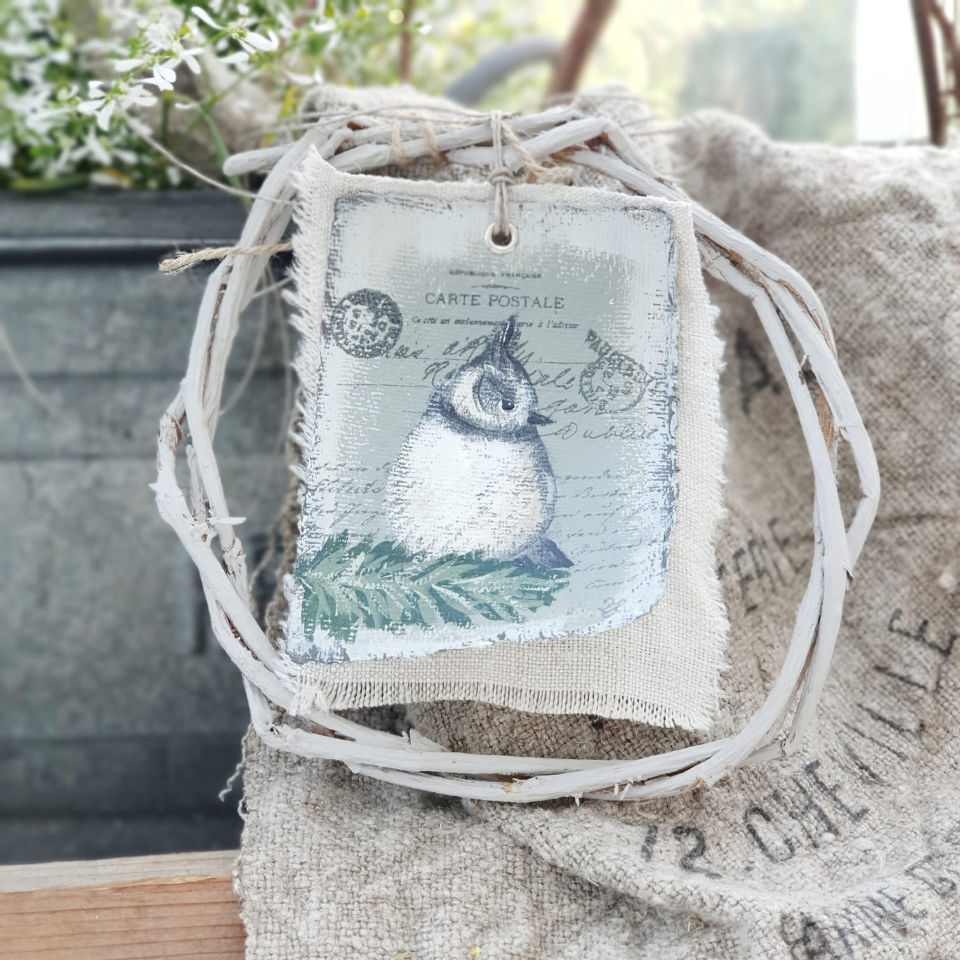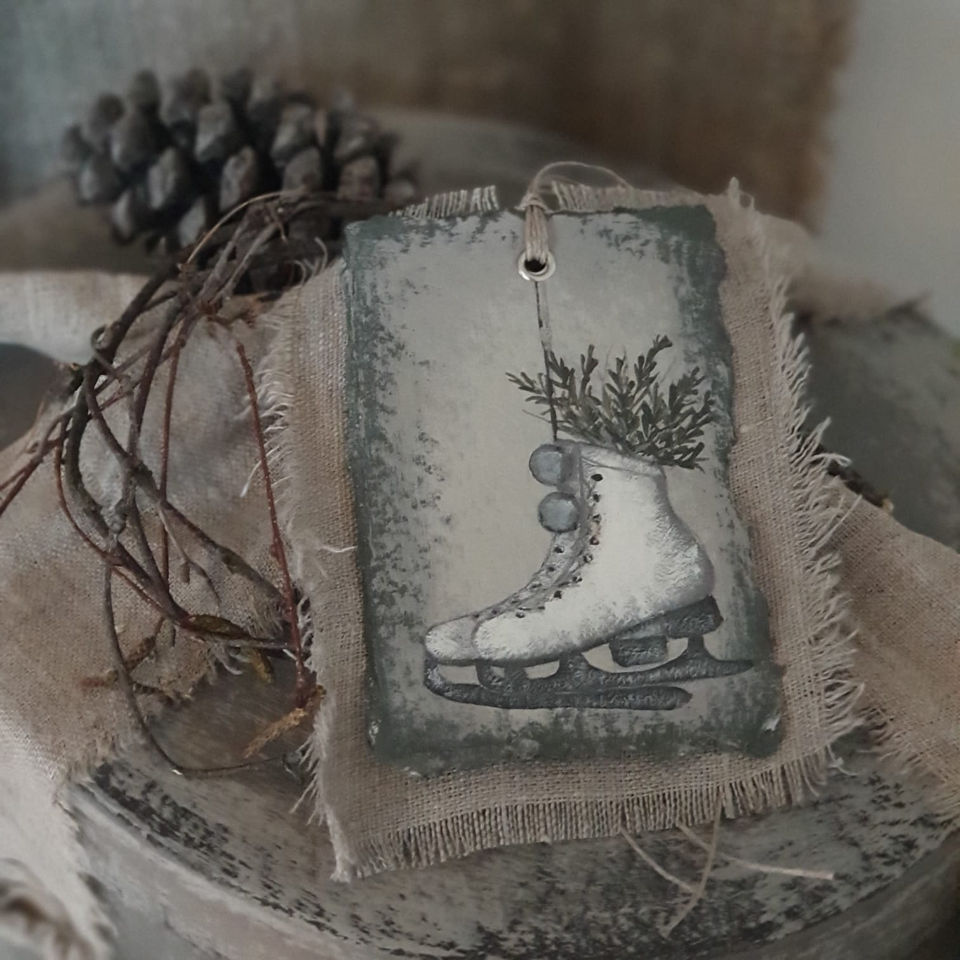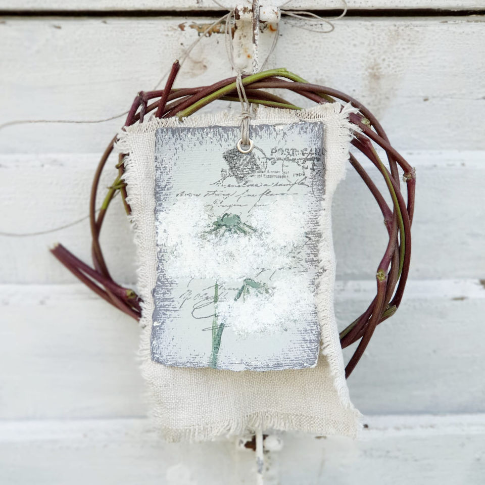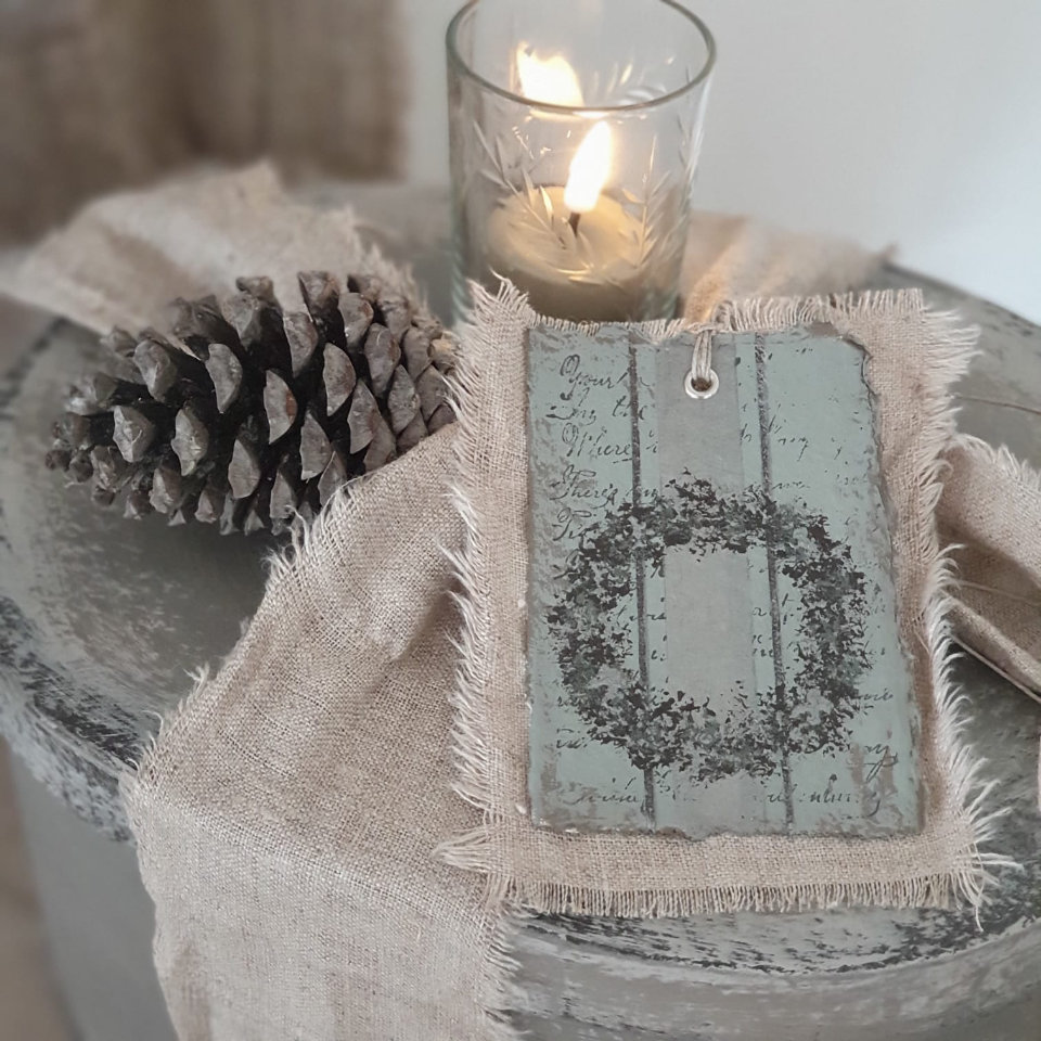 Kleine Leinenanhänger auf Büttenpapier gemalt.