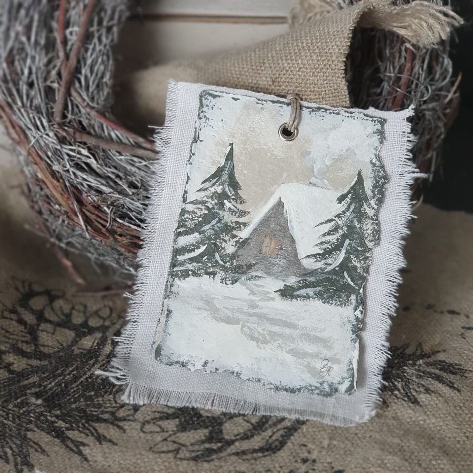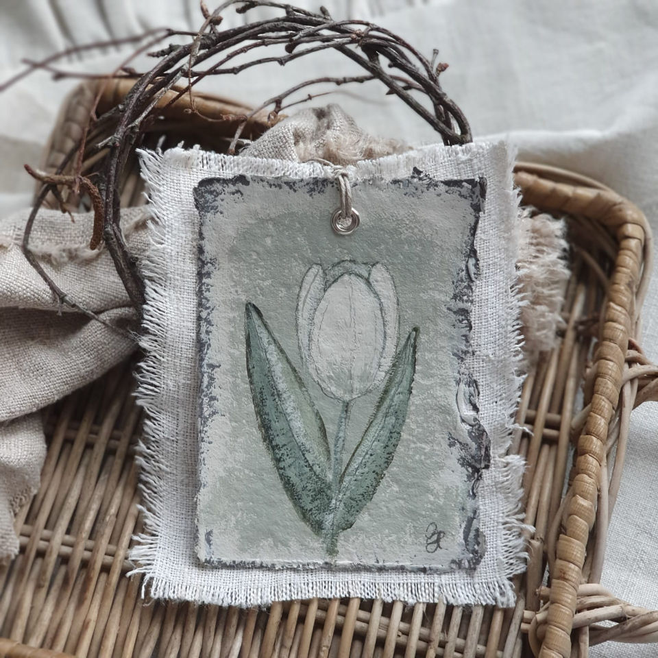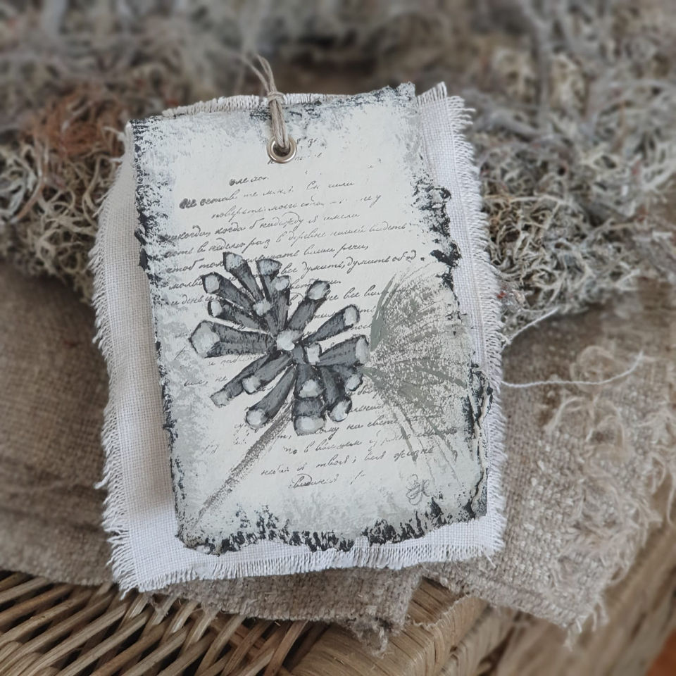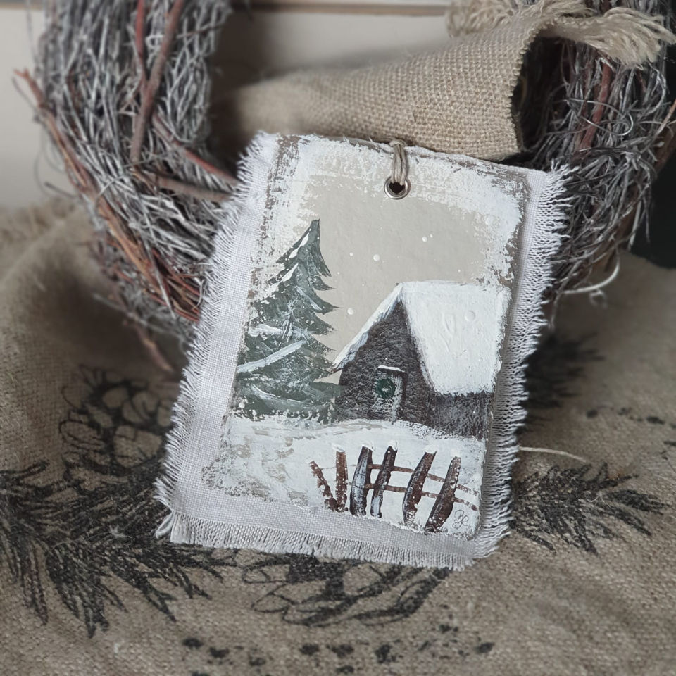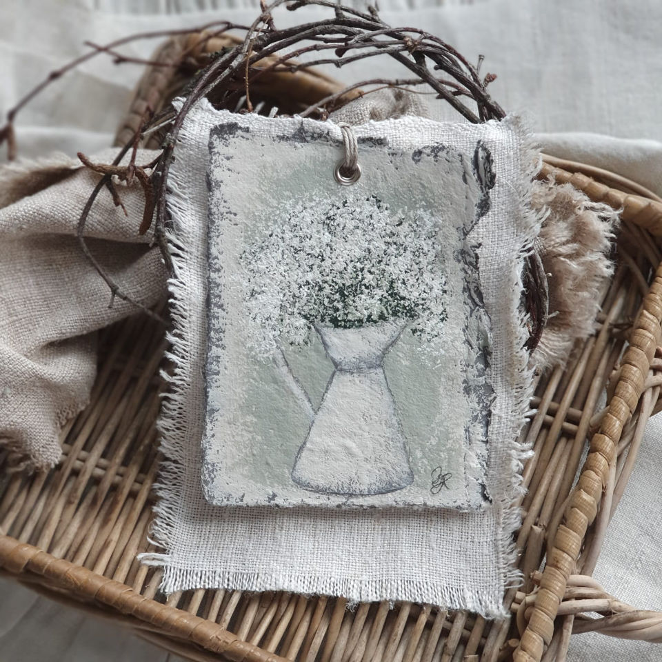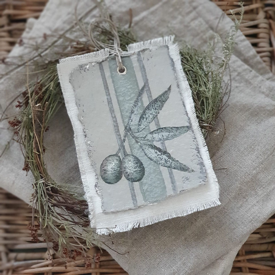 Hand-painted linen tags on handmade paper are inspired by my wooden pictures.