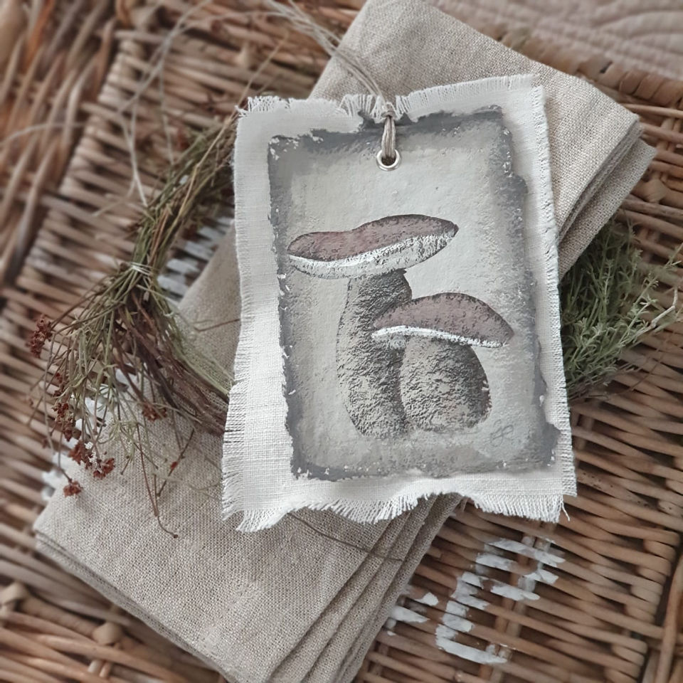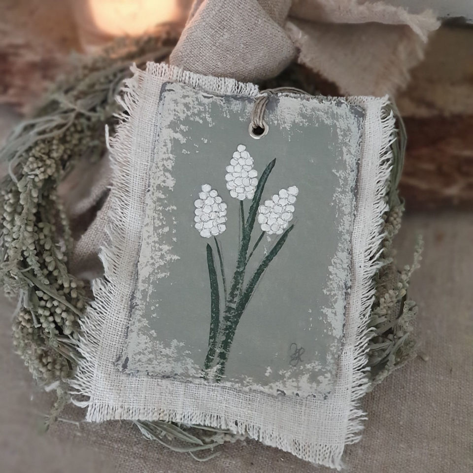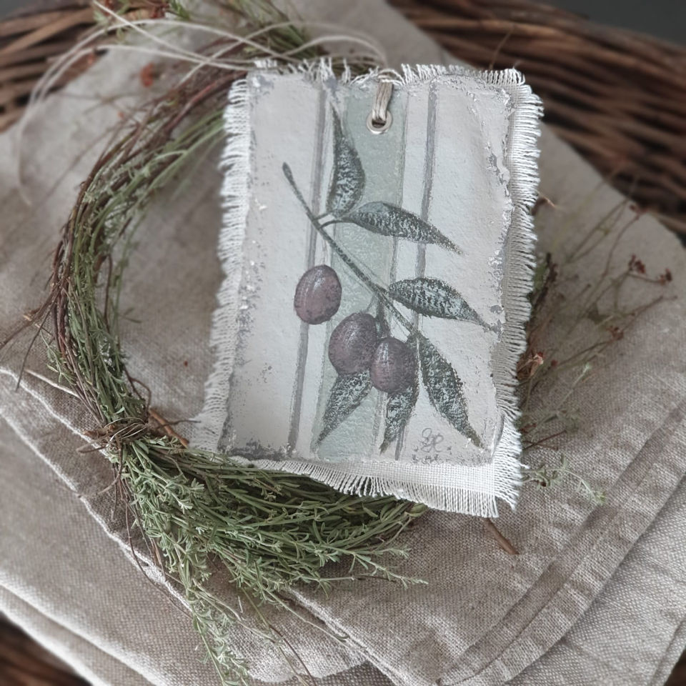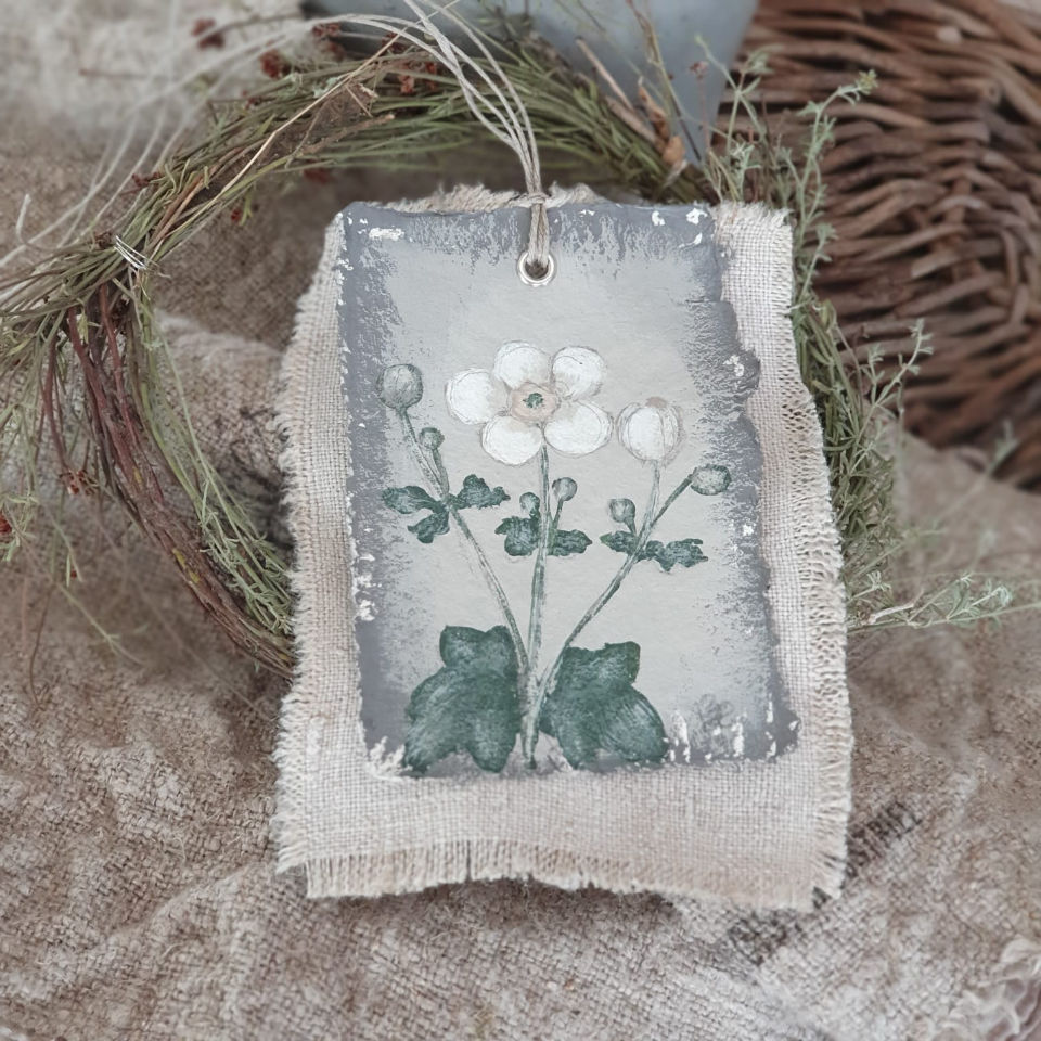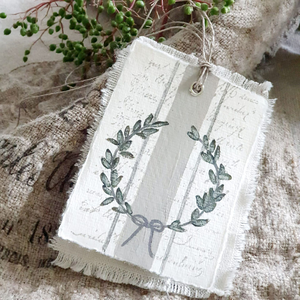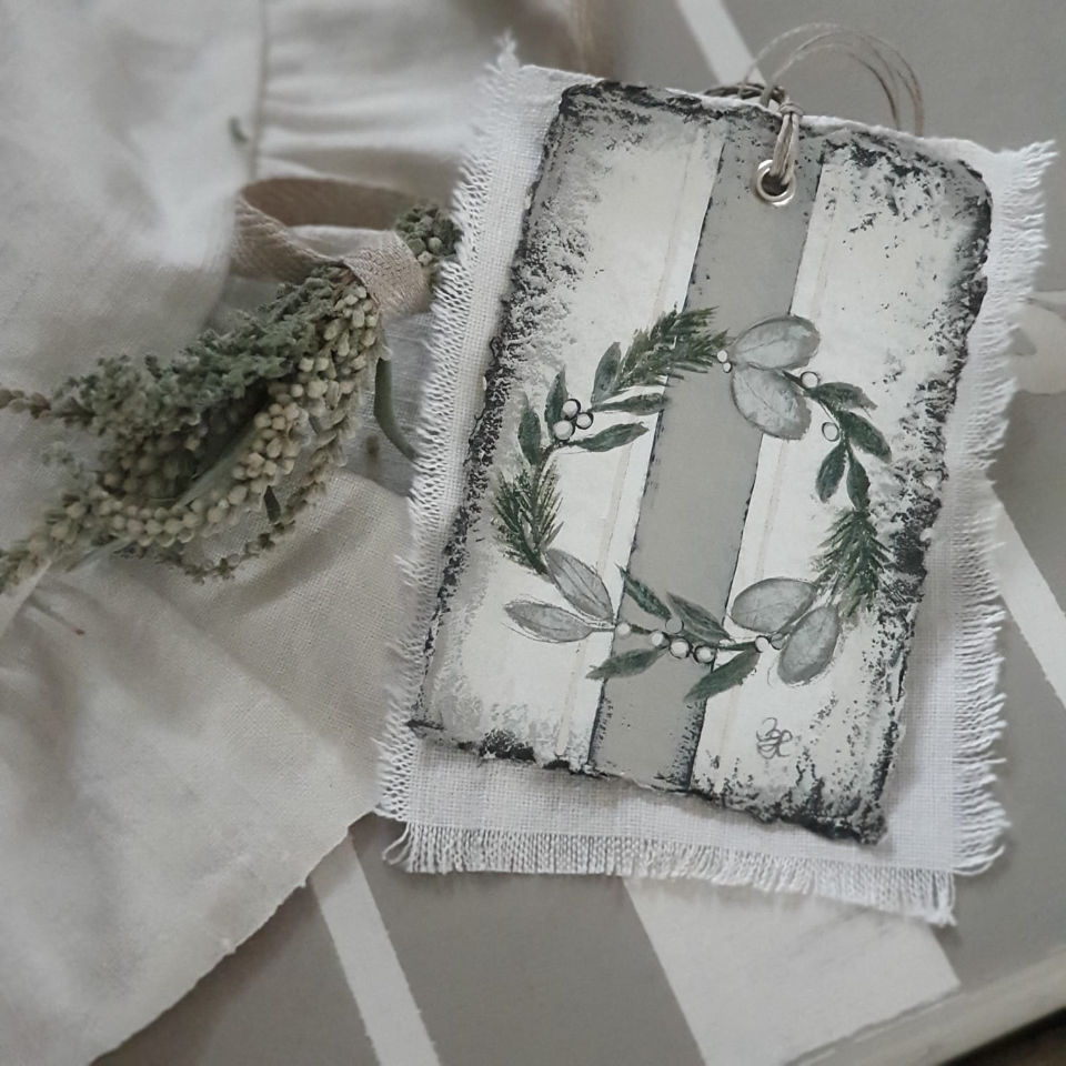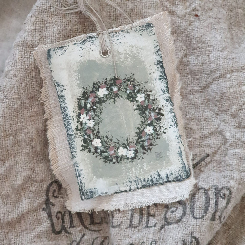 Hand-painted linen tags on handmade paper are inspired by my wooden pictures.