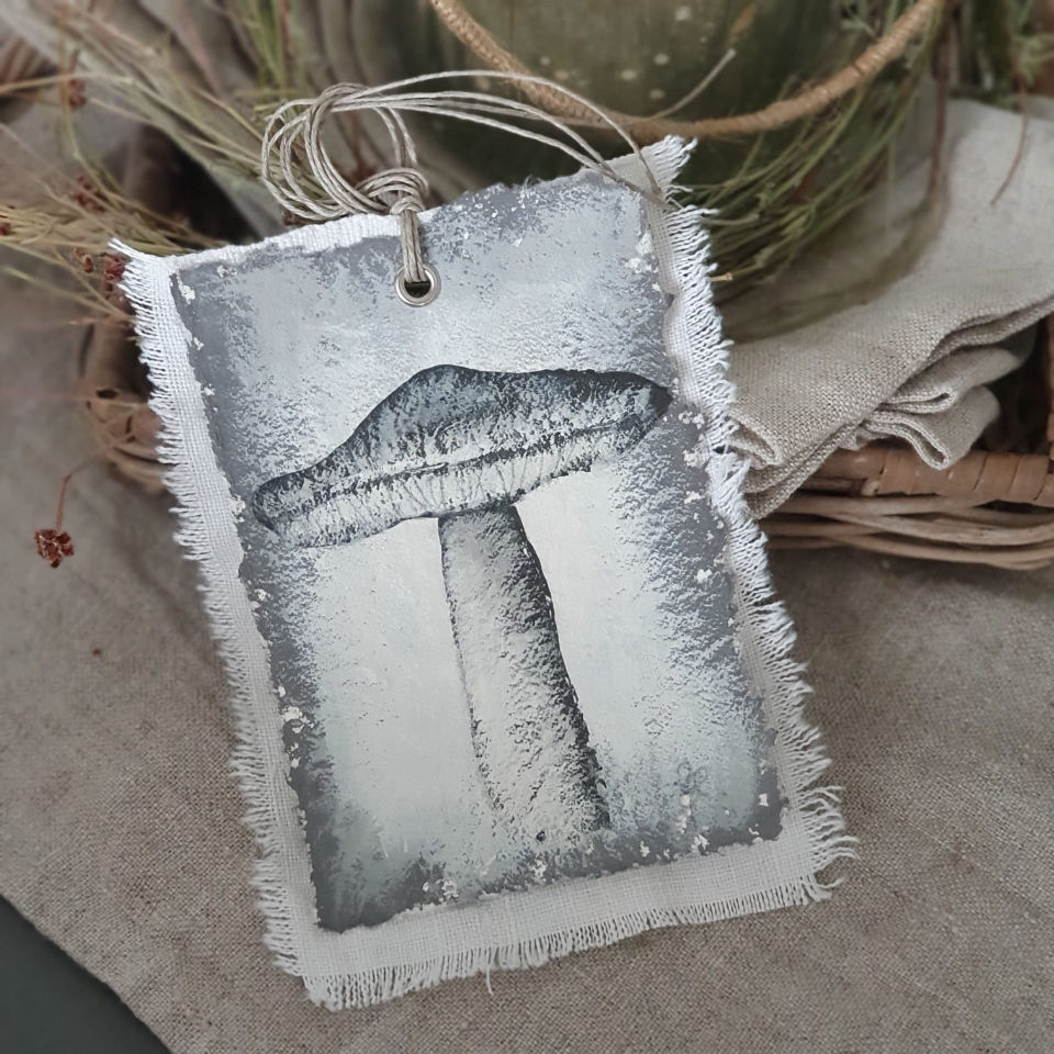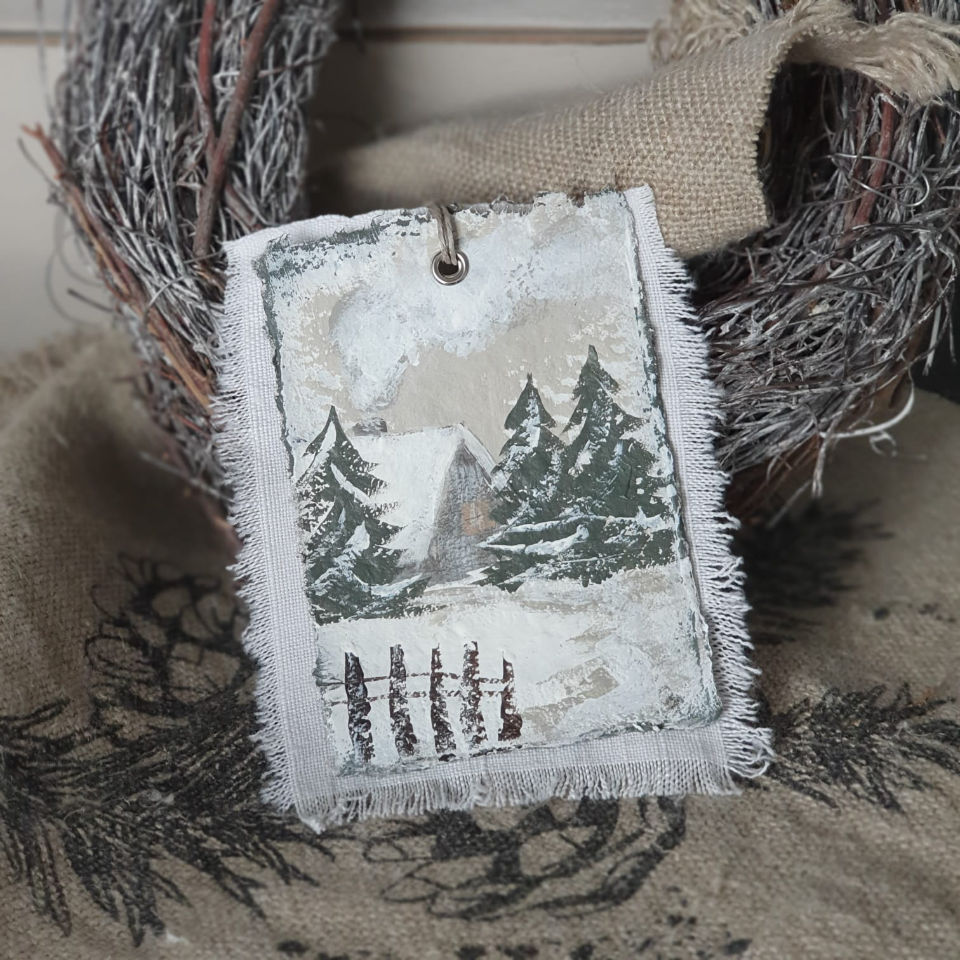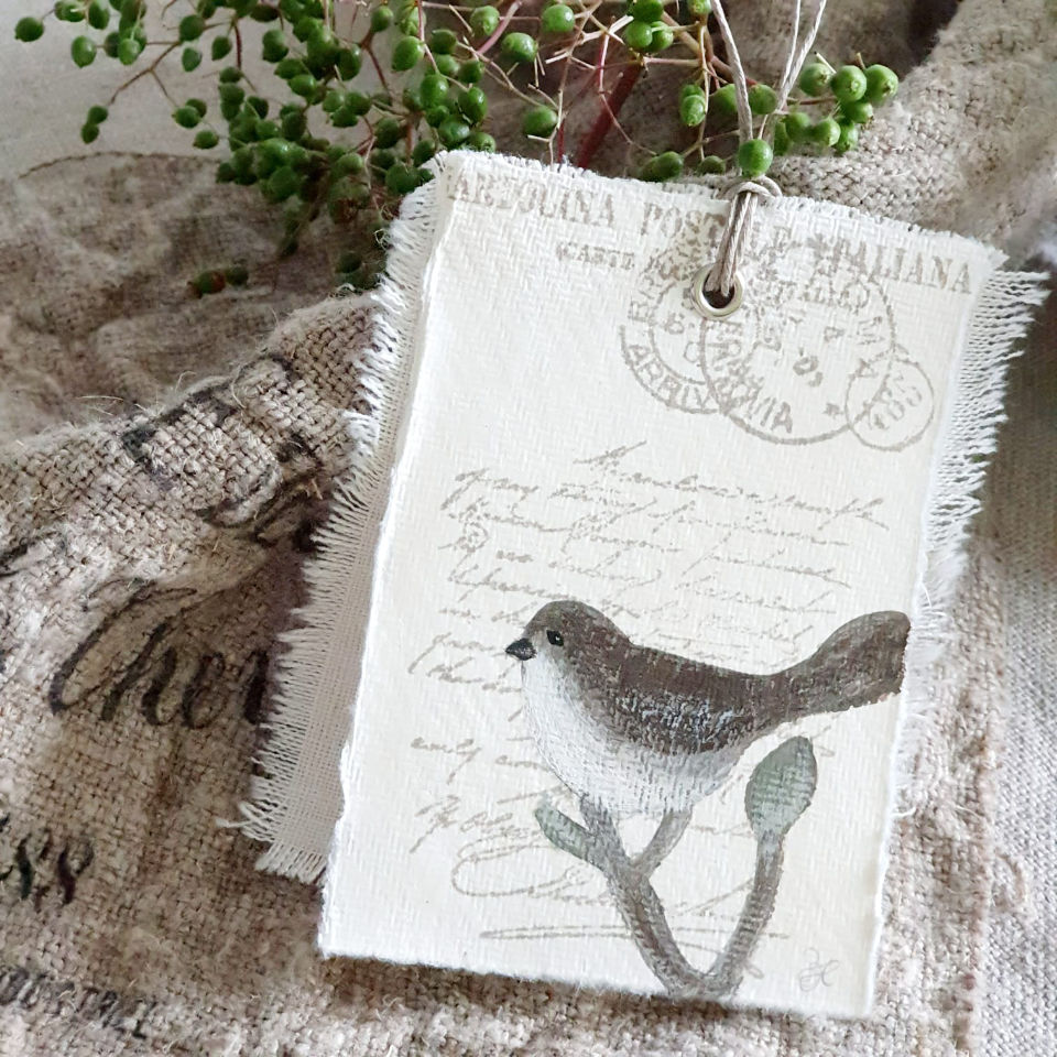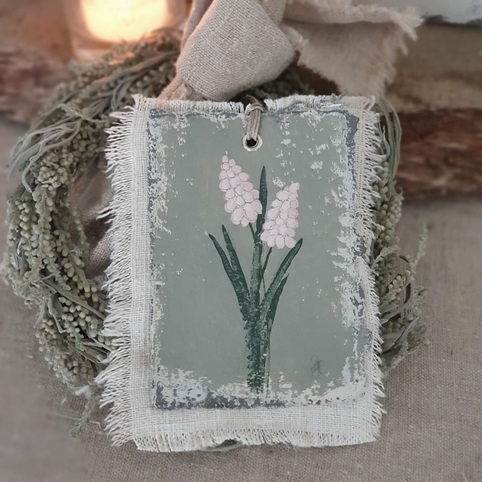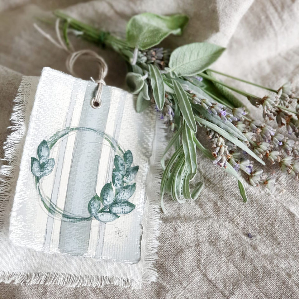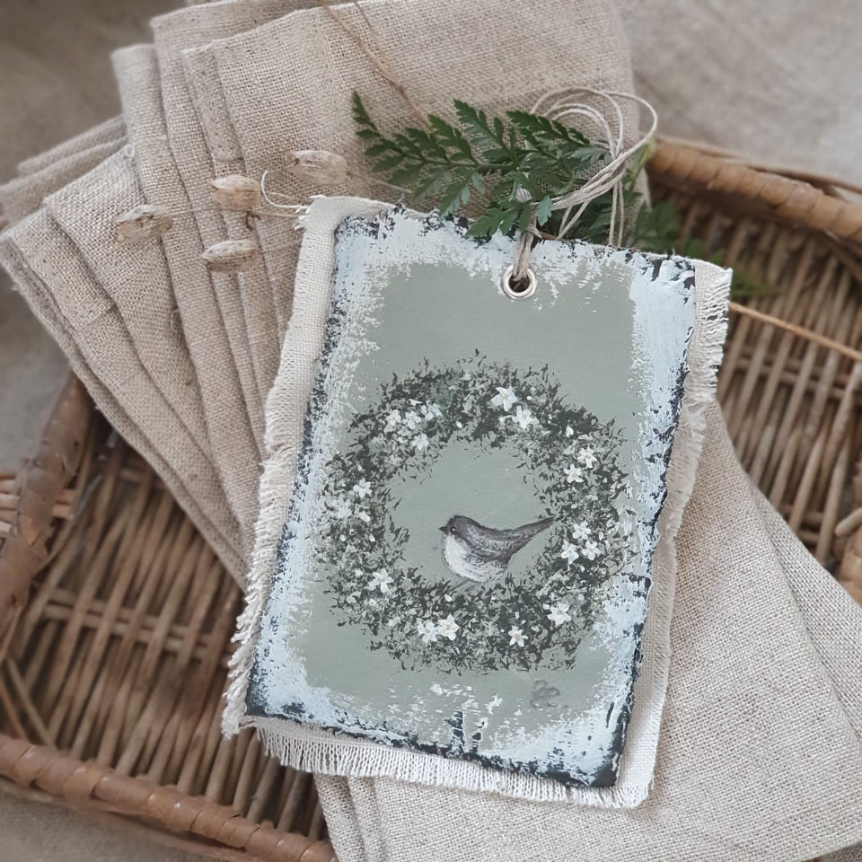 Hand-painted linen tags on handmade paper are inspired by my wooden pictures.