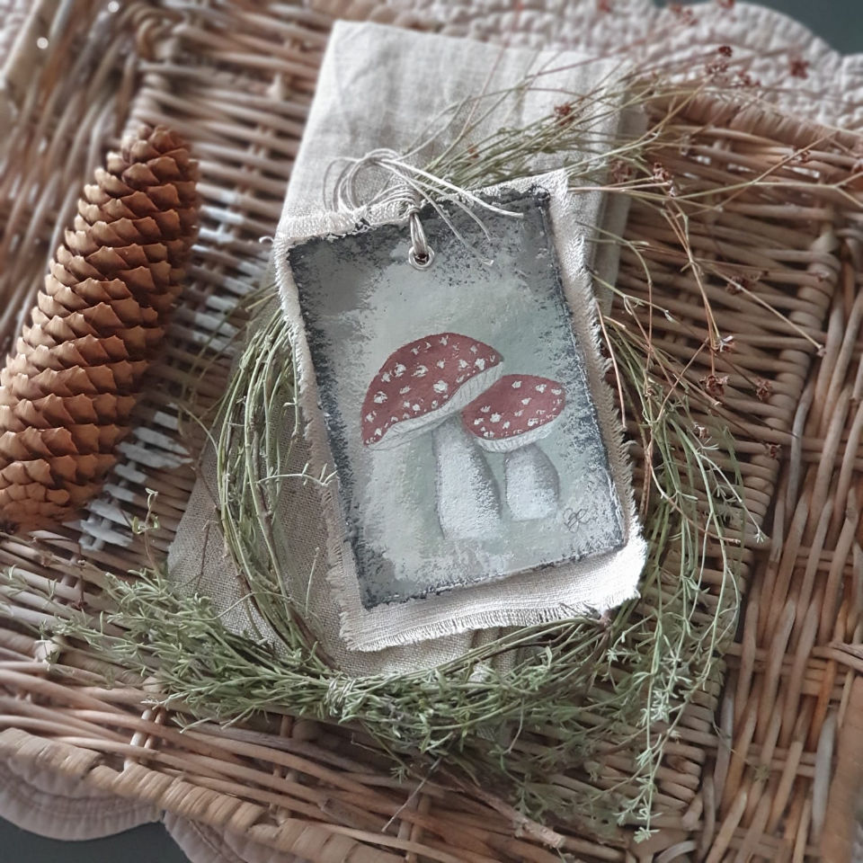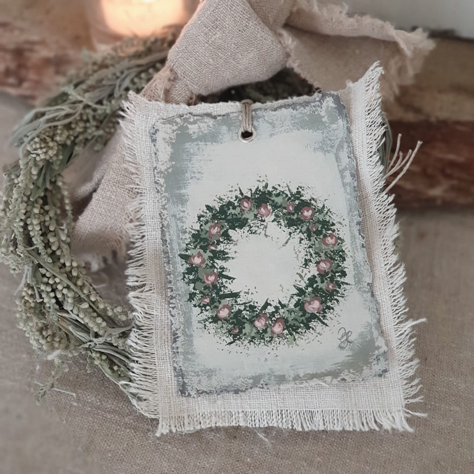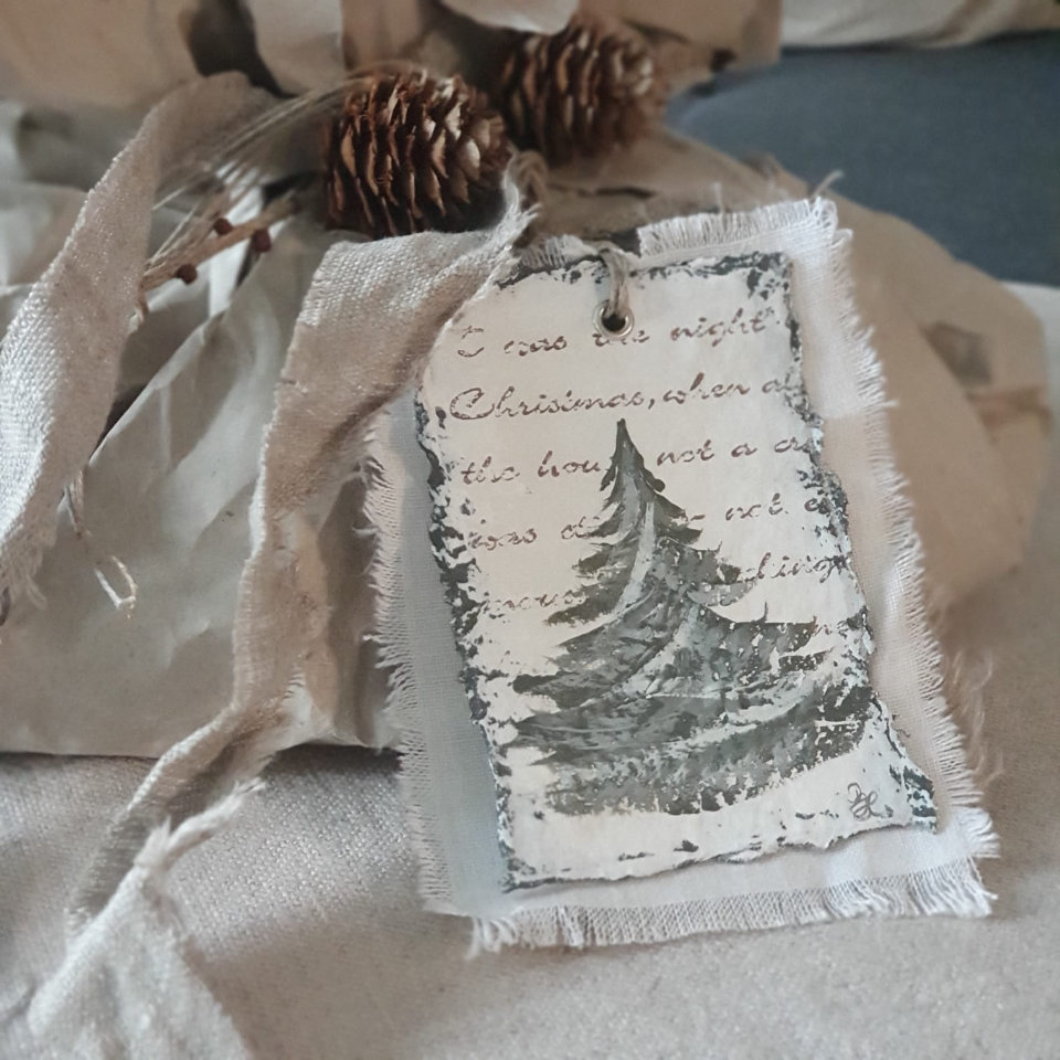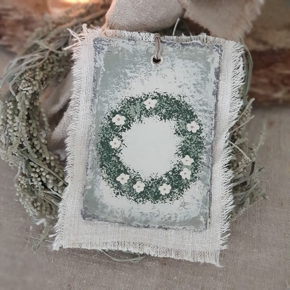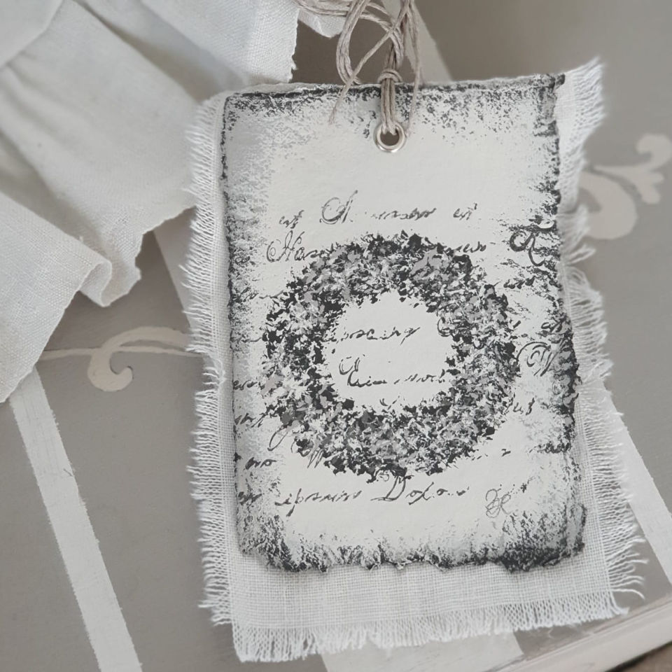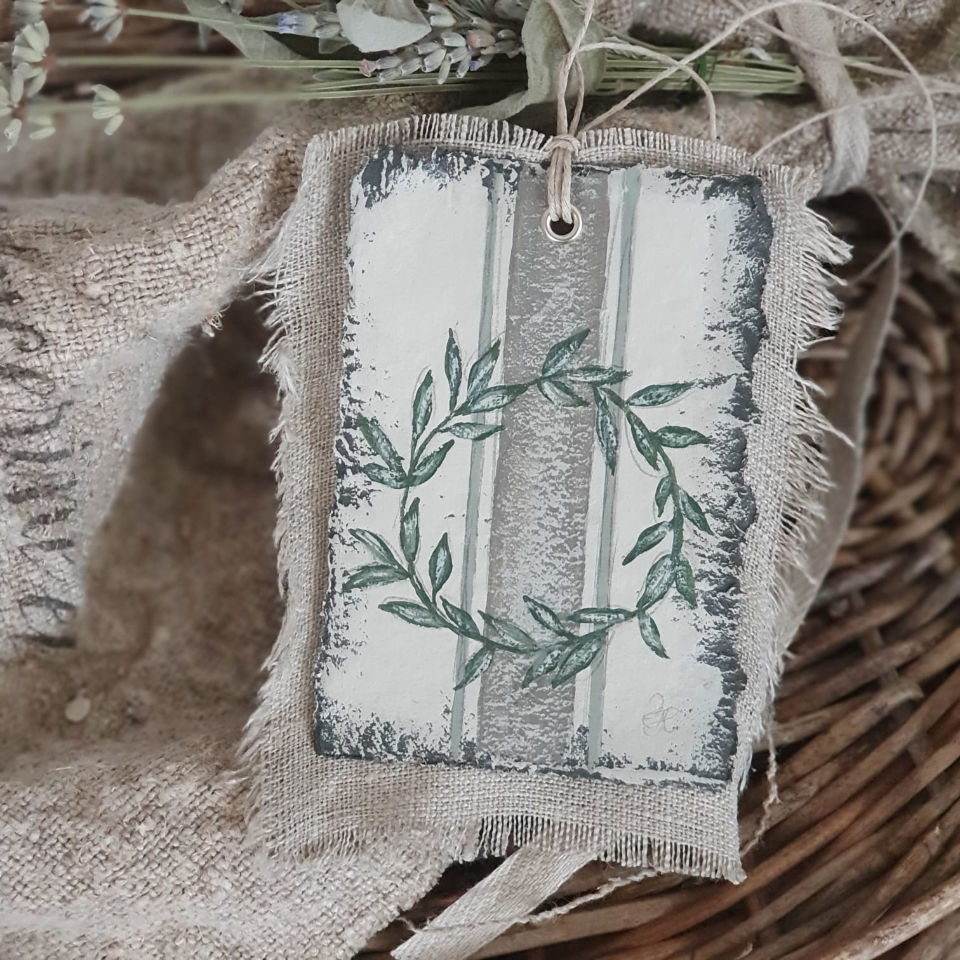 Hand-painted linen tags on handmade paper are inspired by my wooden pictures.
