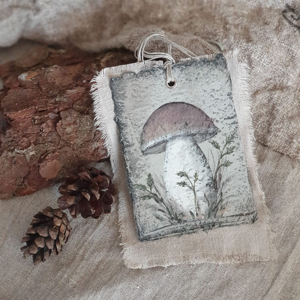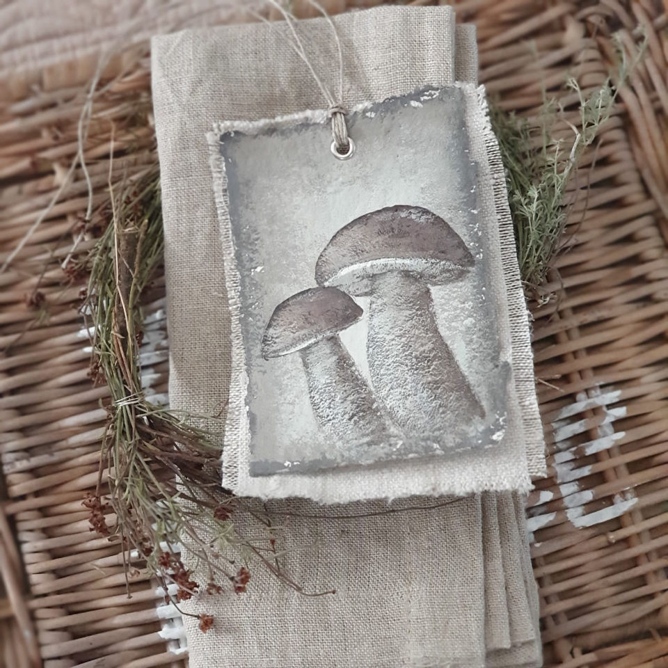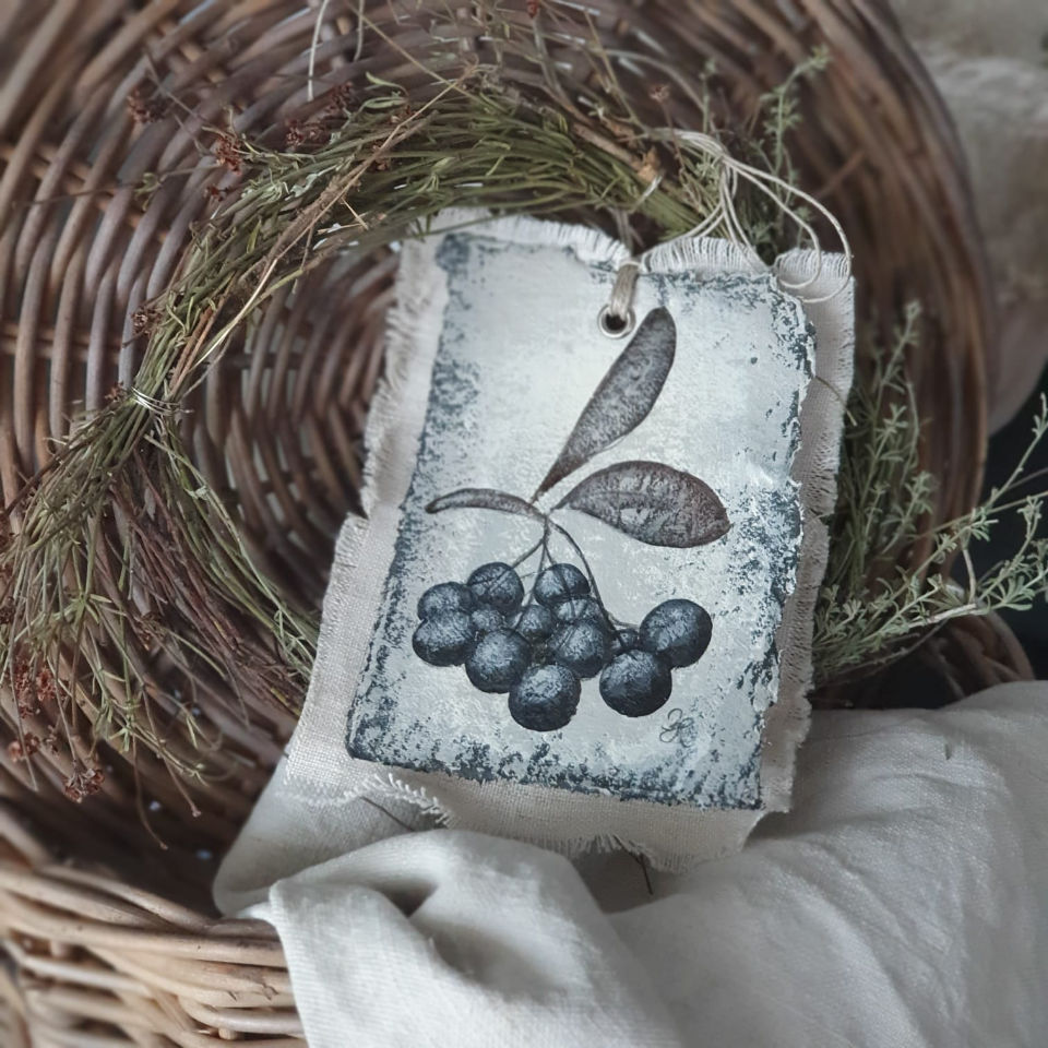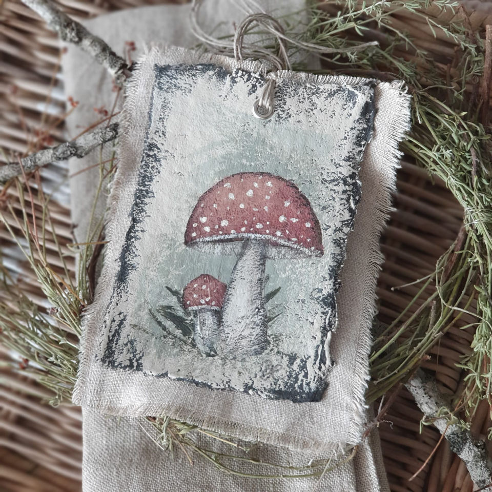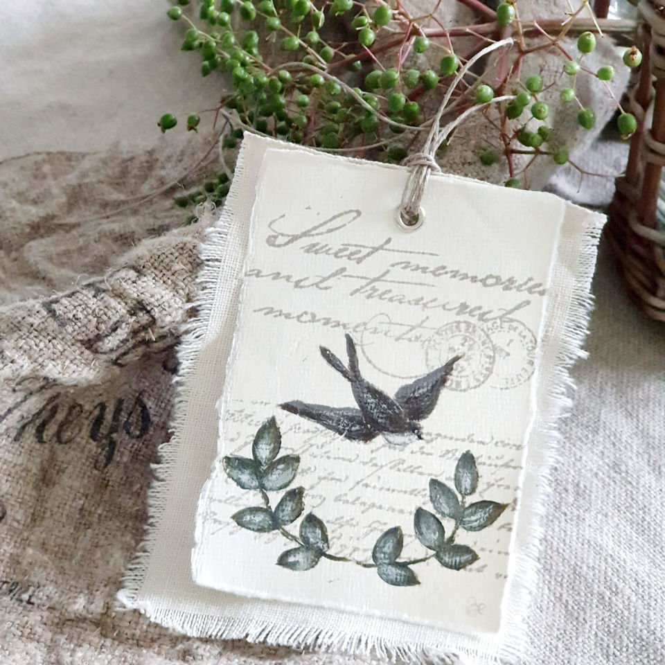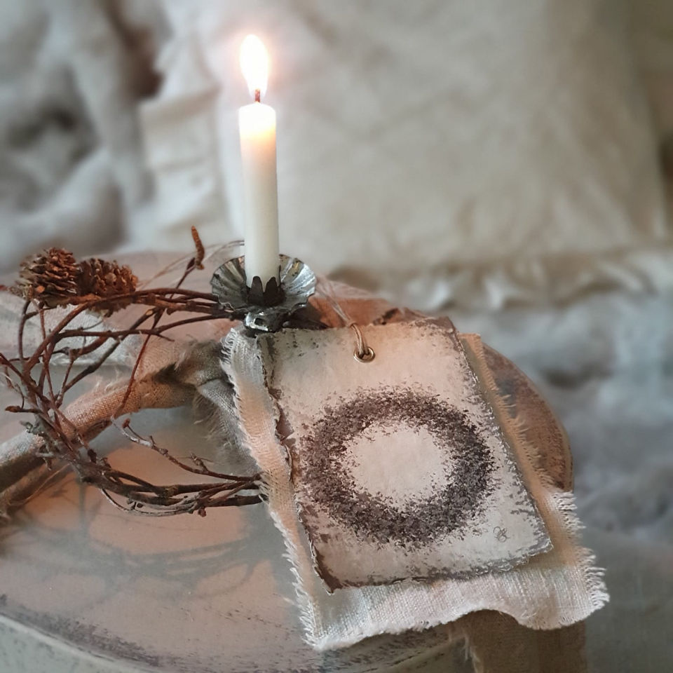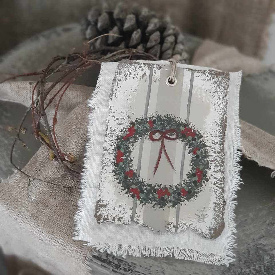 Hand-painted linen tags on handmade paper are inspired by my wooden pictures.