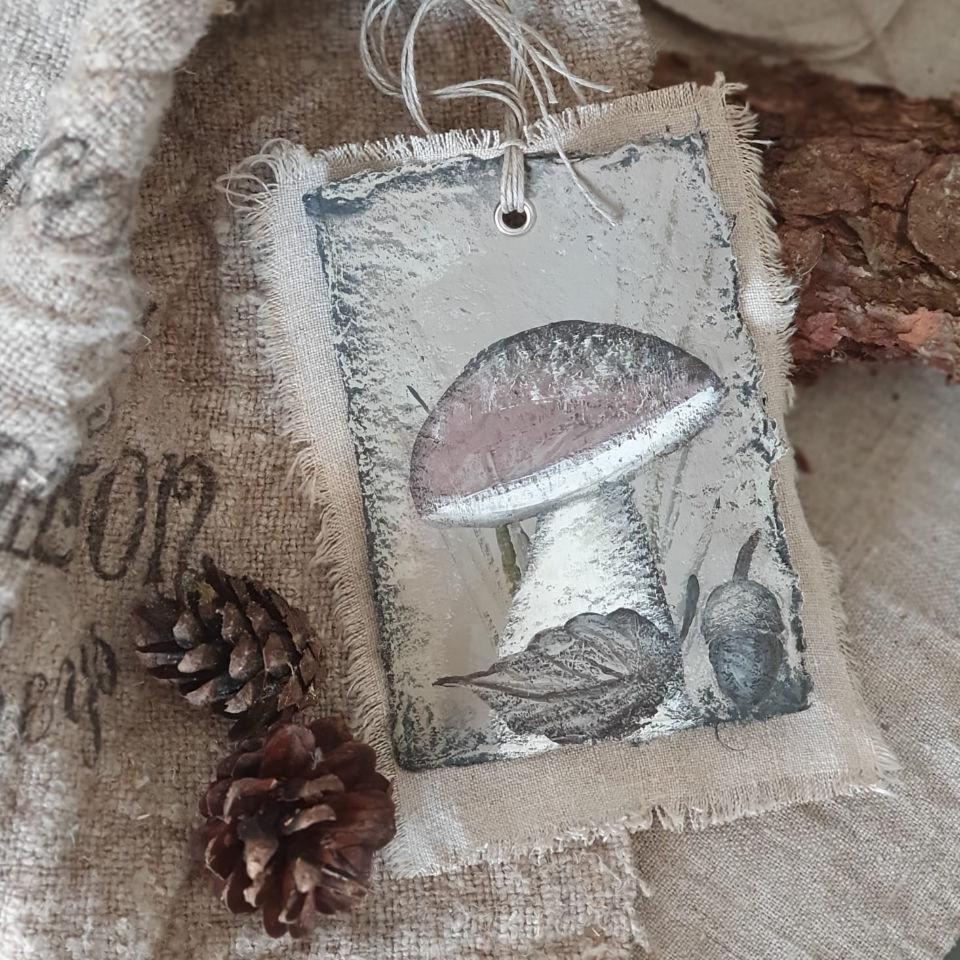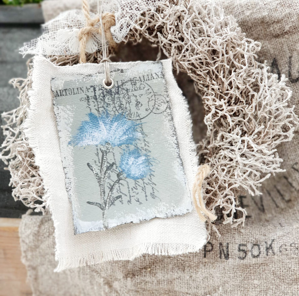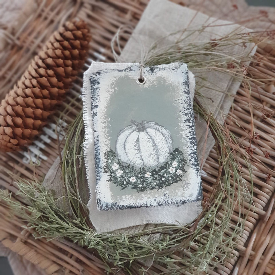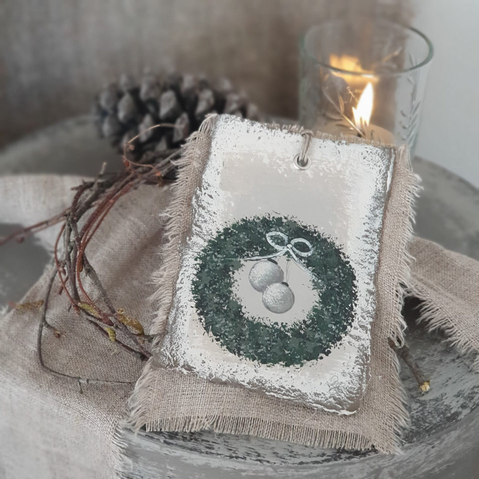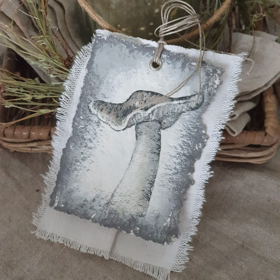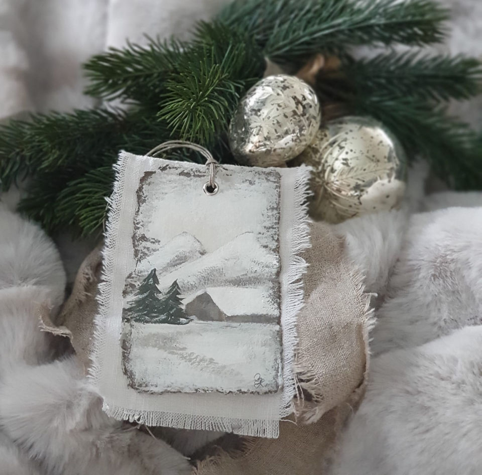 Hand-painted linen tags on handmade paper are inspired by my wooden pictures.