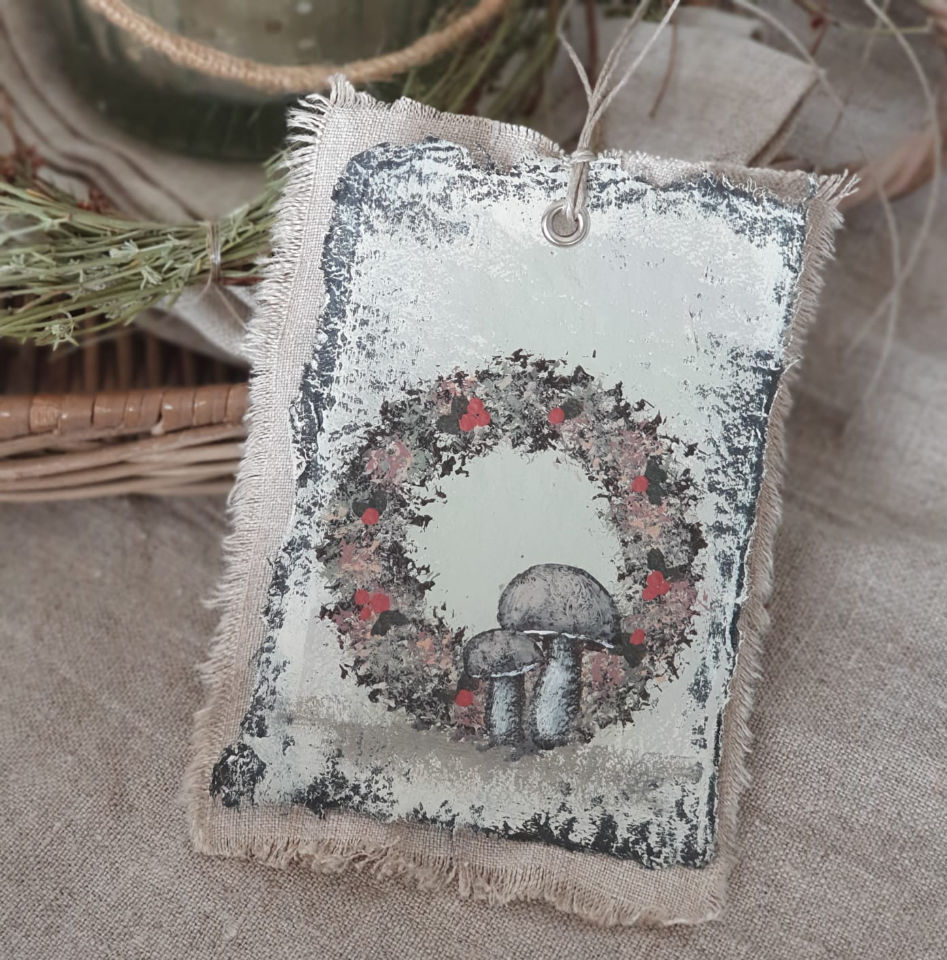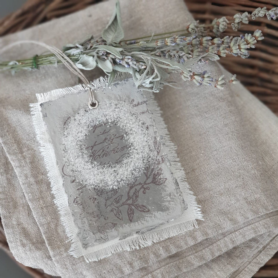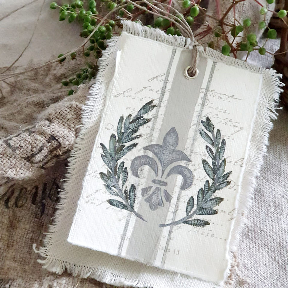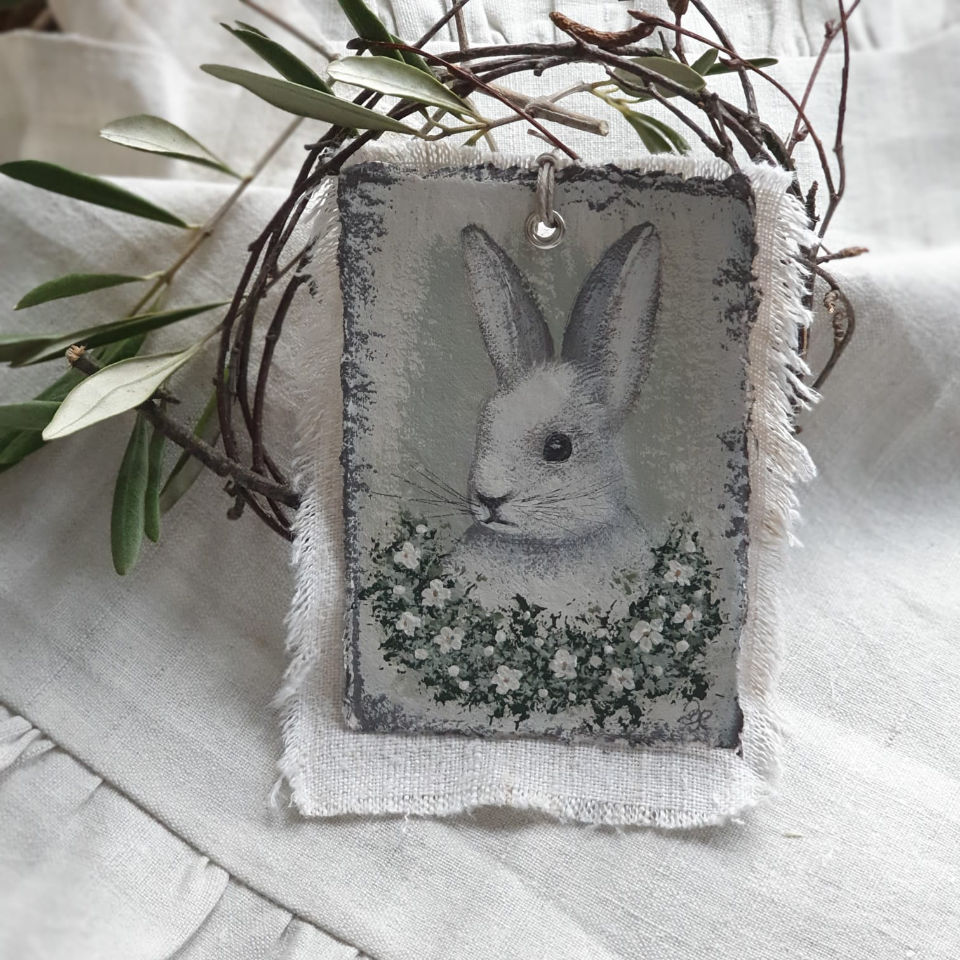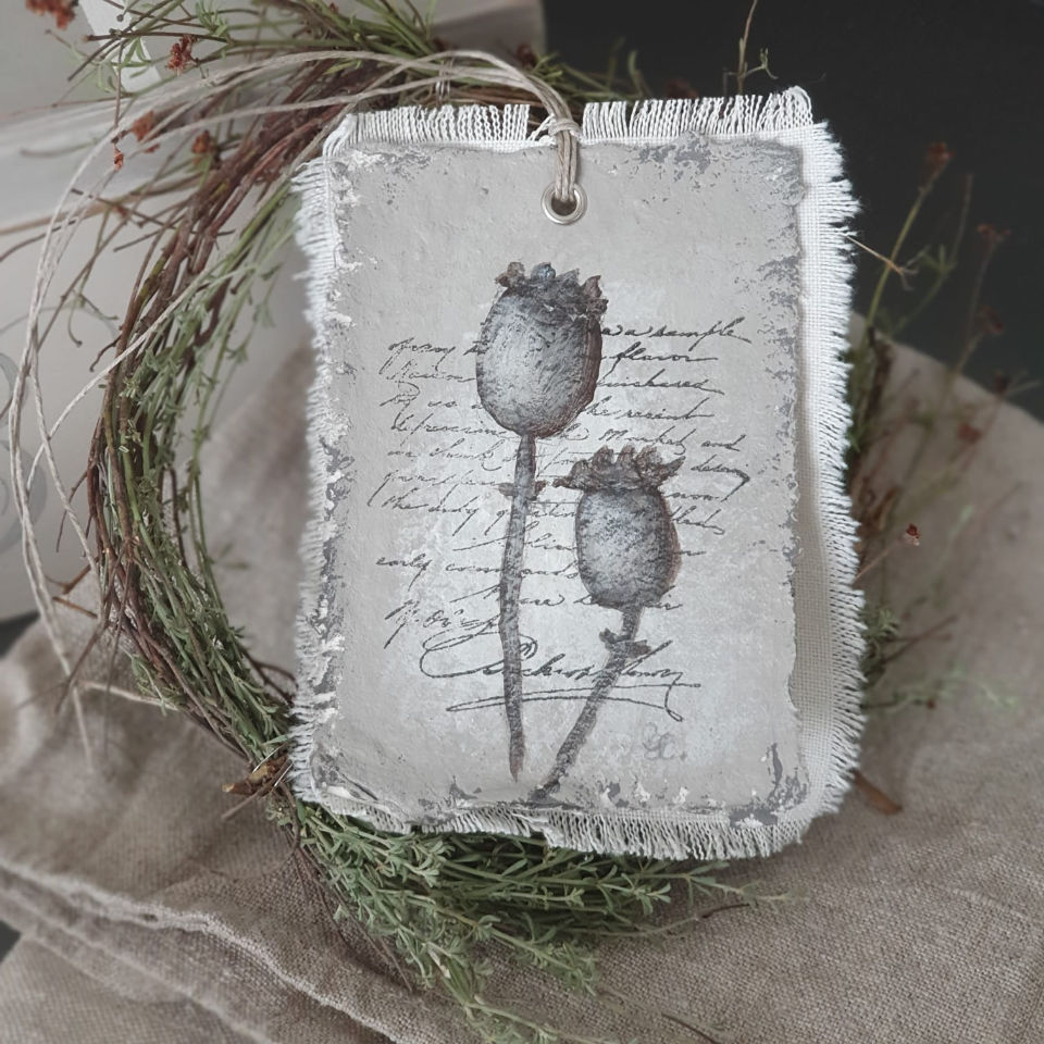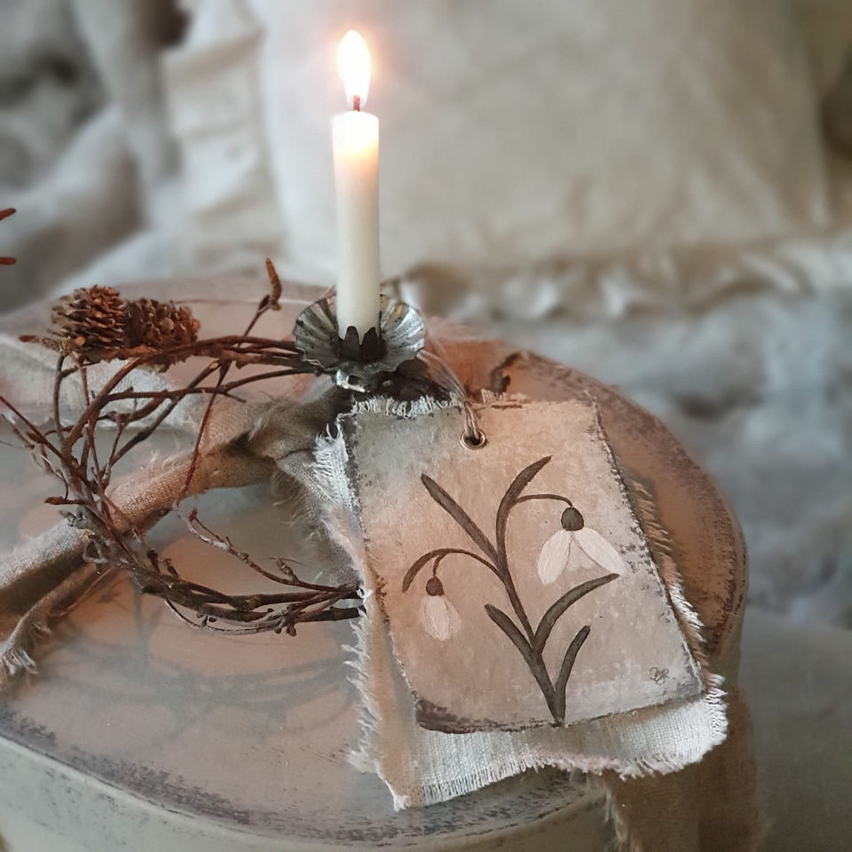Hand-painted linen tags on handmade paper are inspired by my wooden pictures.