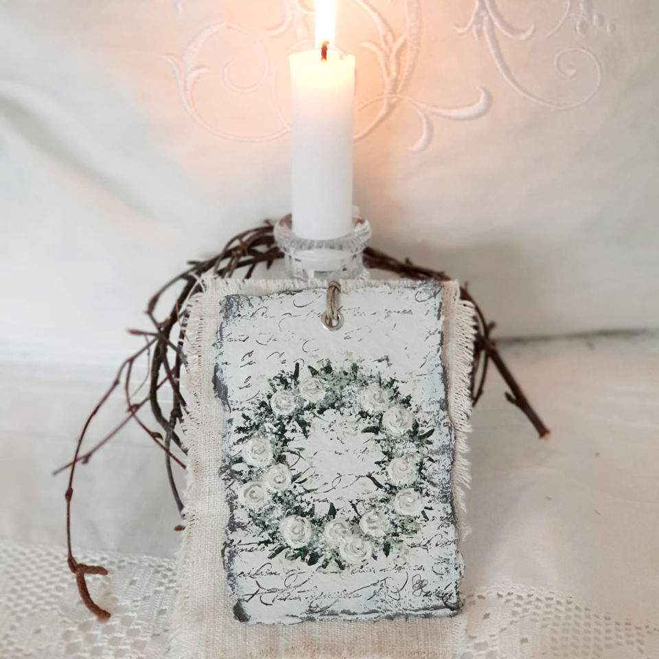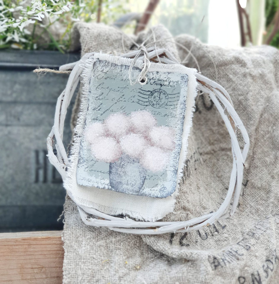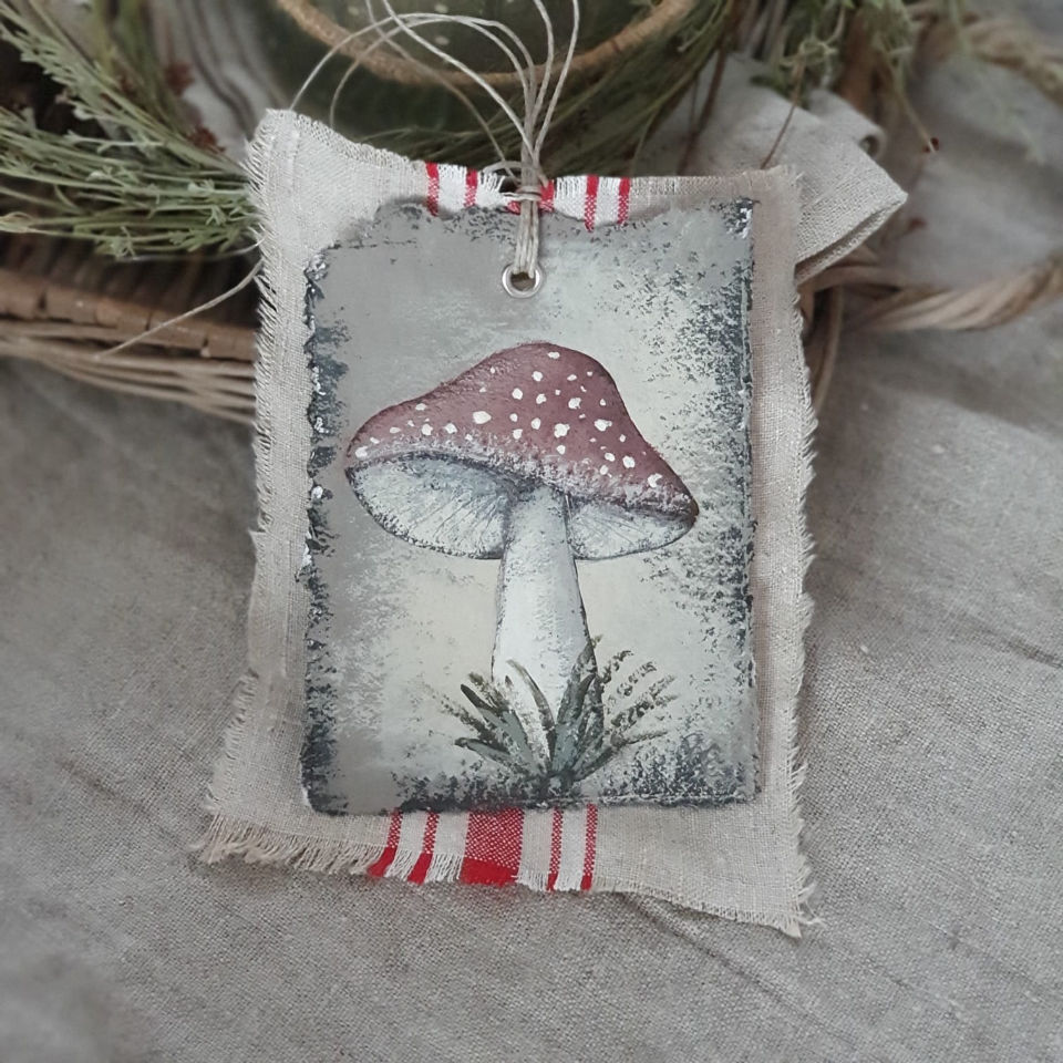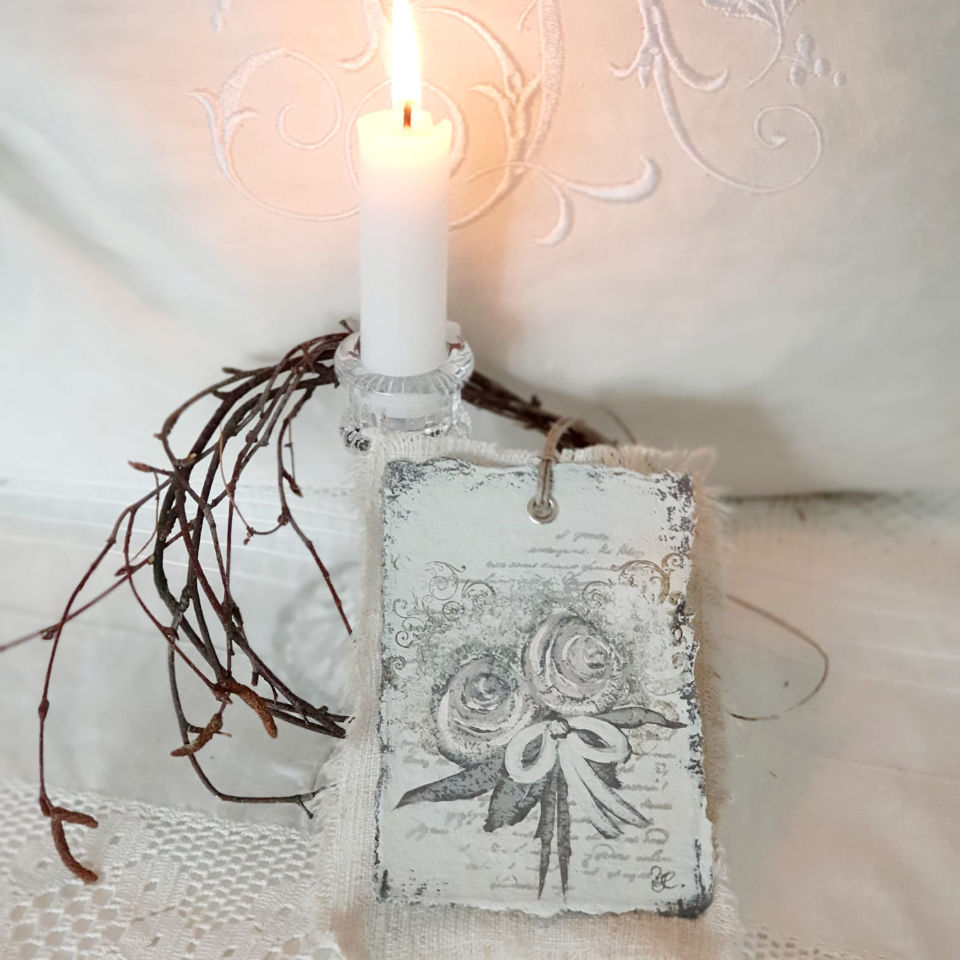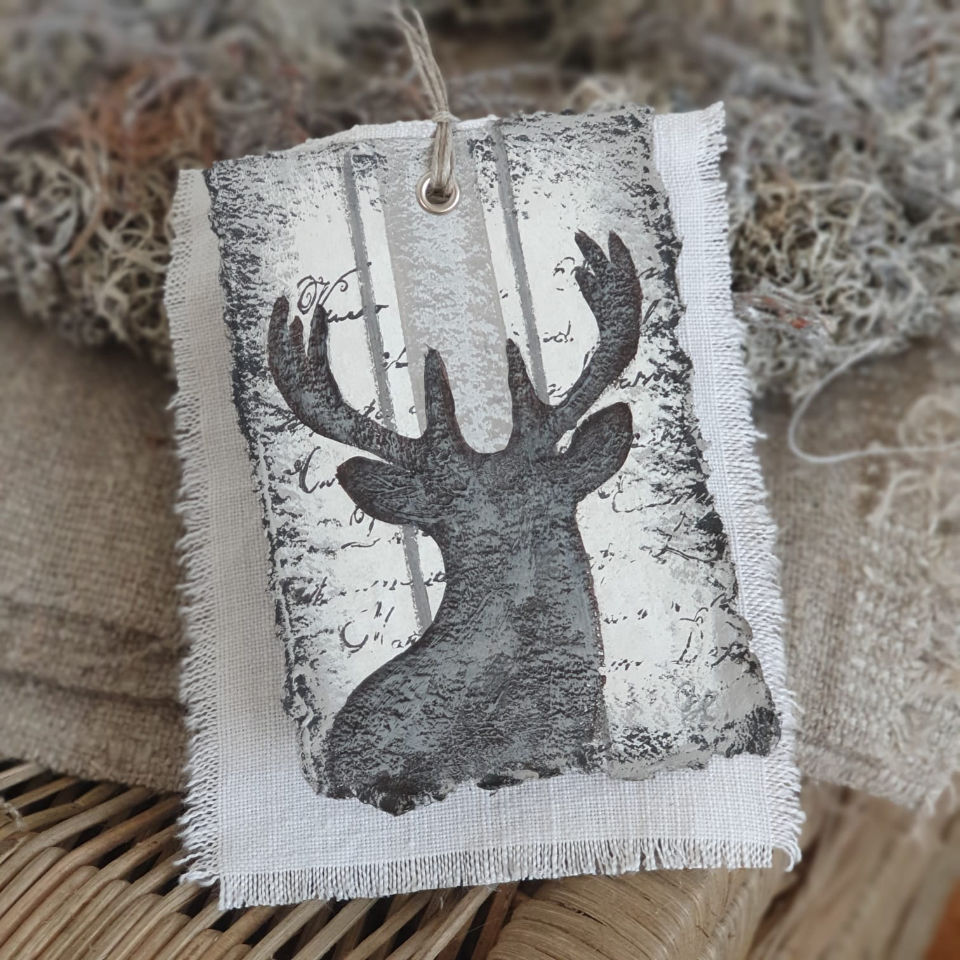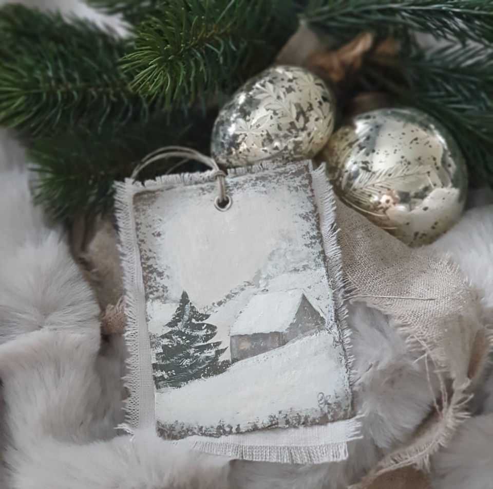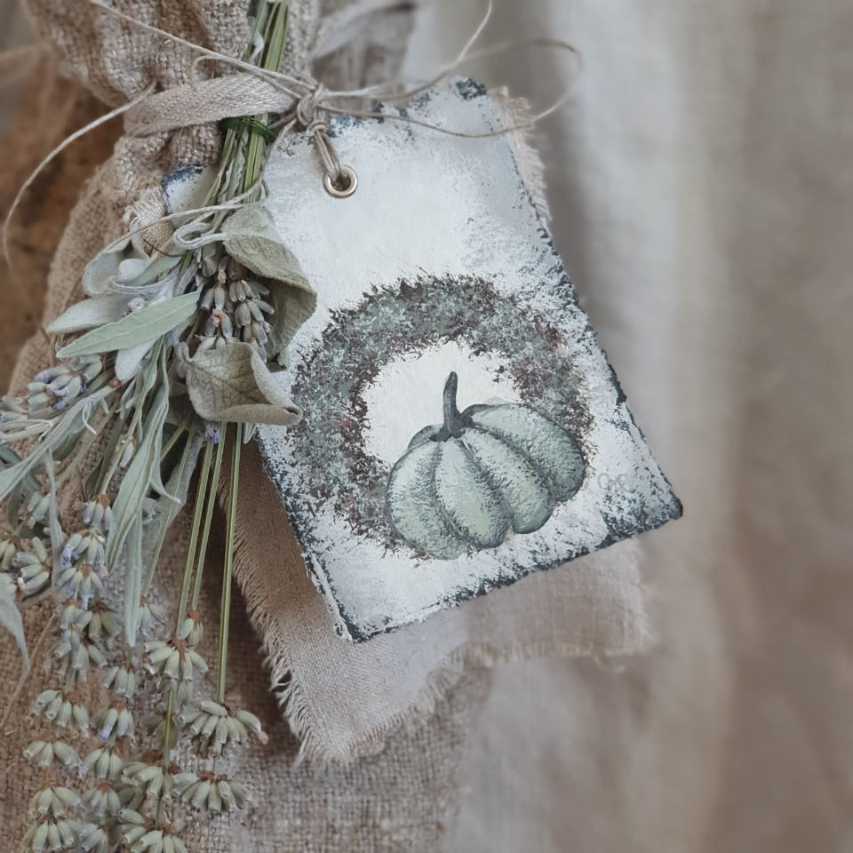 Hand-painted linen tags on handmade paper are inspired by my wooden pictures.
