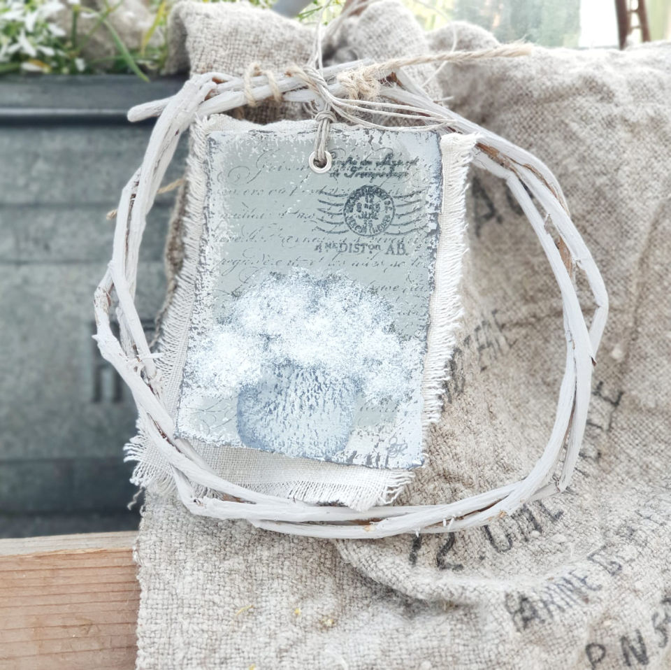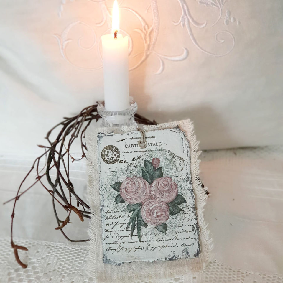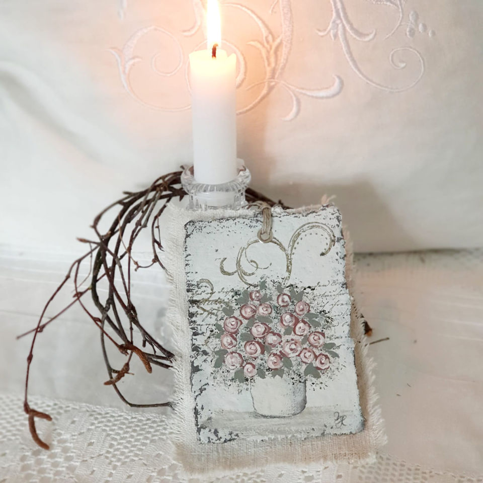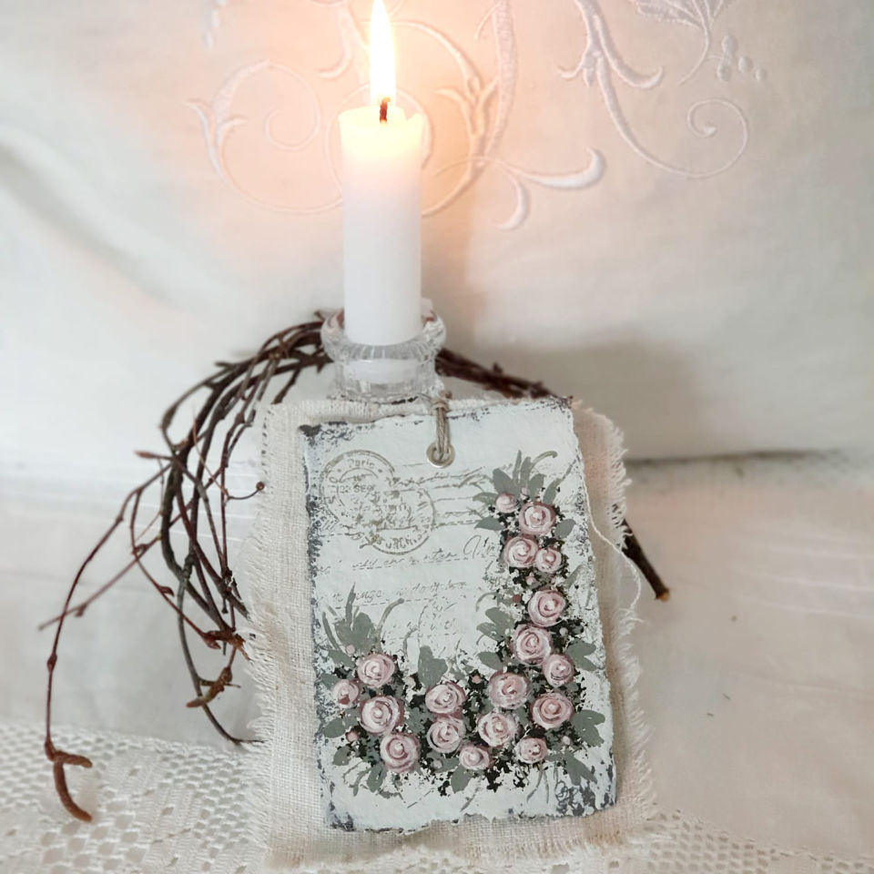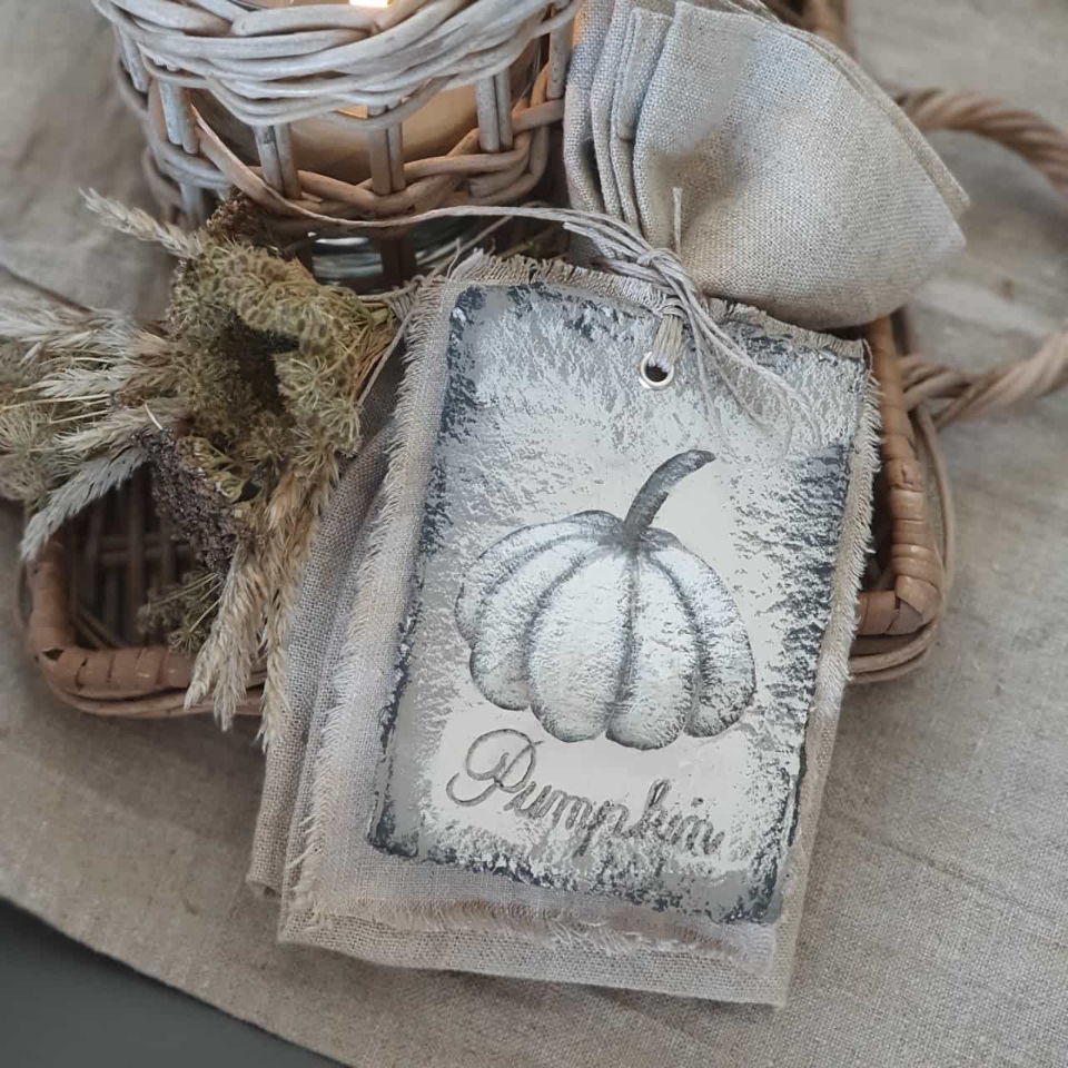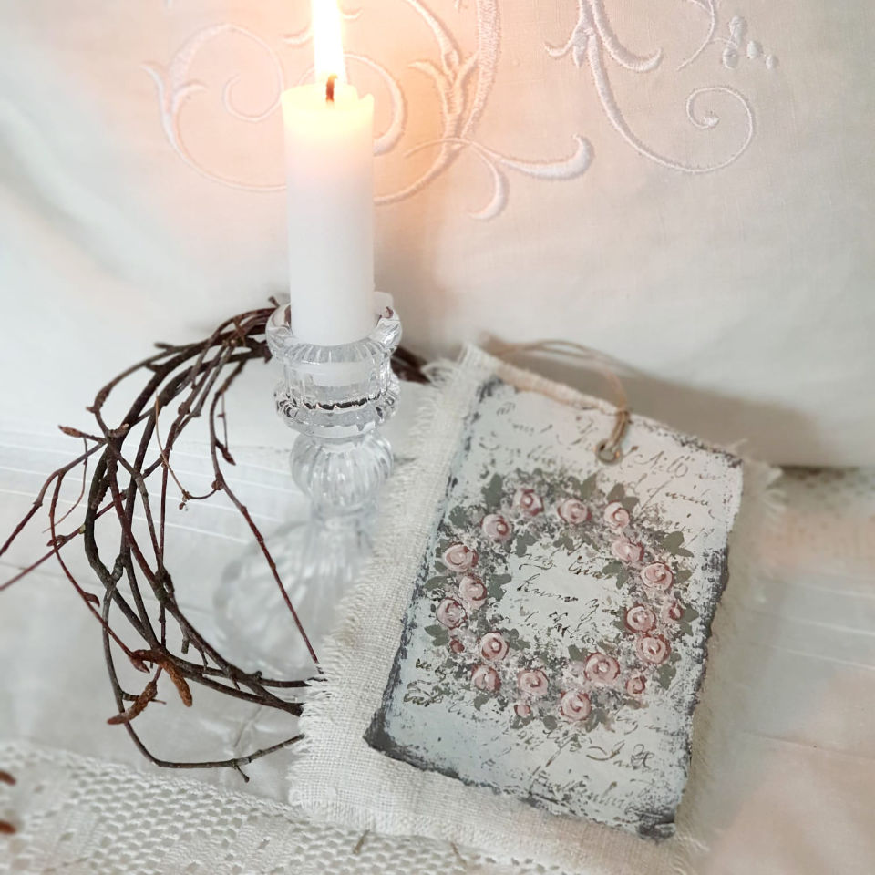 Hand-painted linen tags on handmade paper are inspired by my wooden pictures.