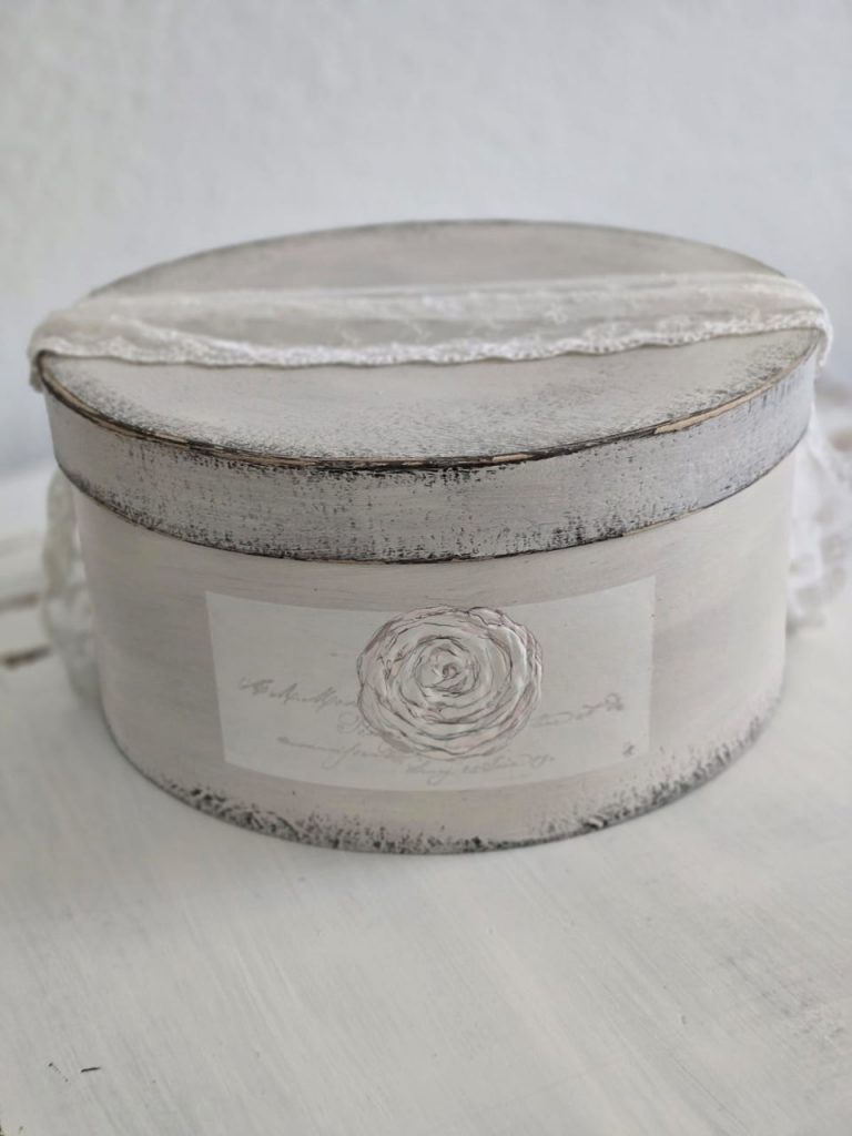 Jede meiner Kartonagen ist ein Unikat, das mit zarter Bemalung, nostalgischer Verzierung und feinen Details wie Spitze, Rosen und alten Fundstücken versehen ist.
