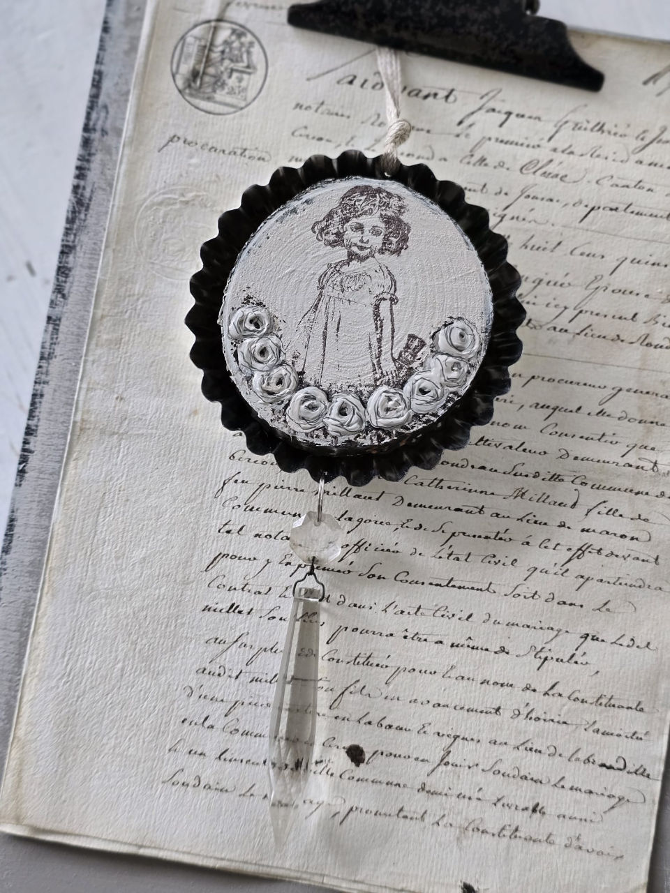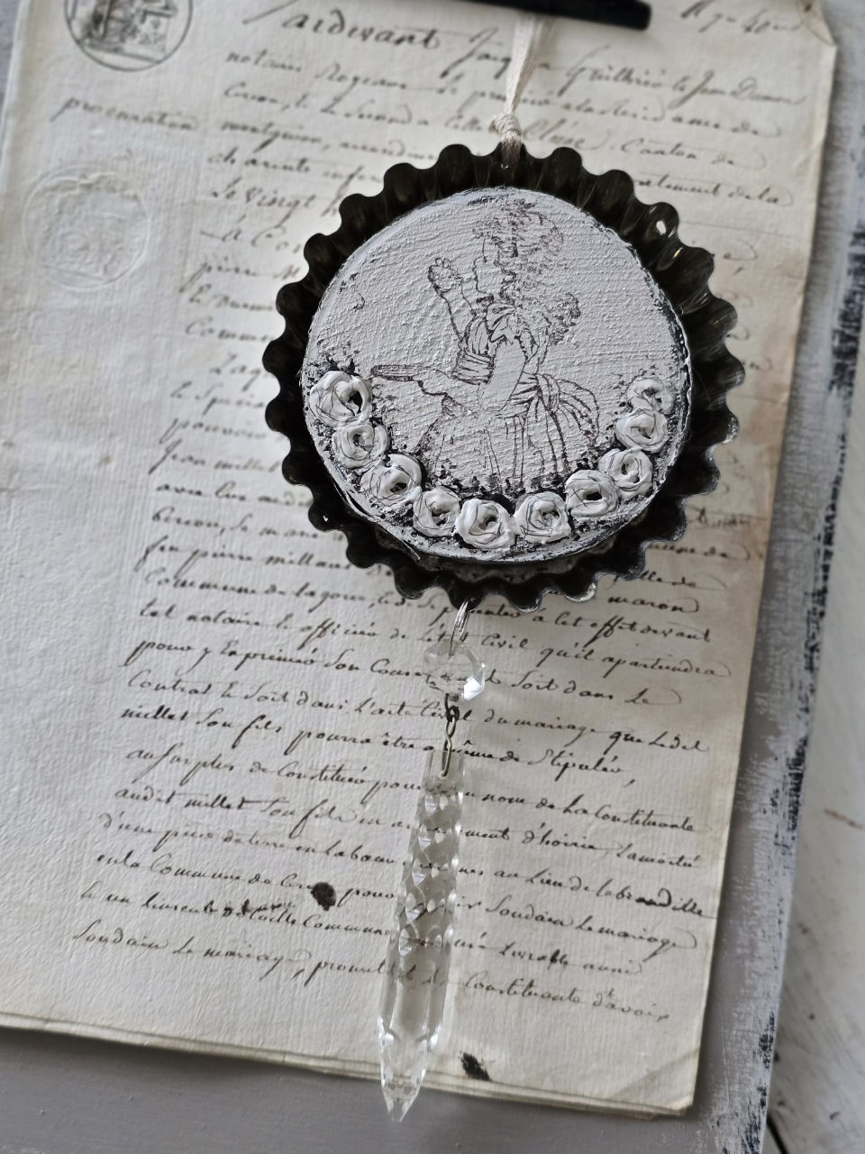 Background stamped, foreground painted. Framed in an antique tartlet mold and an antique glass prism.
