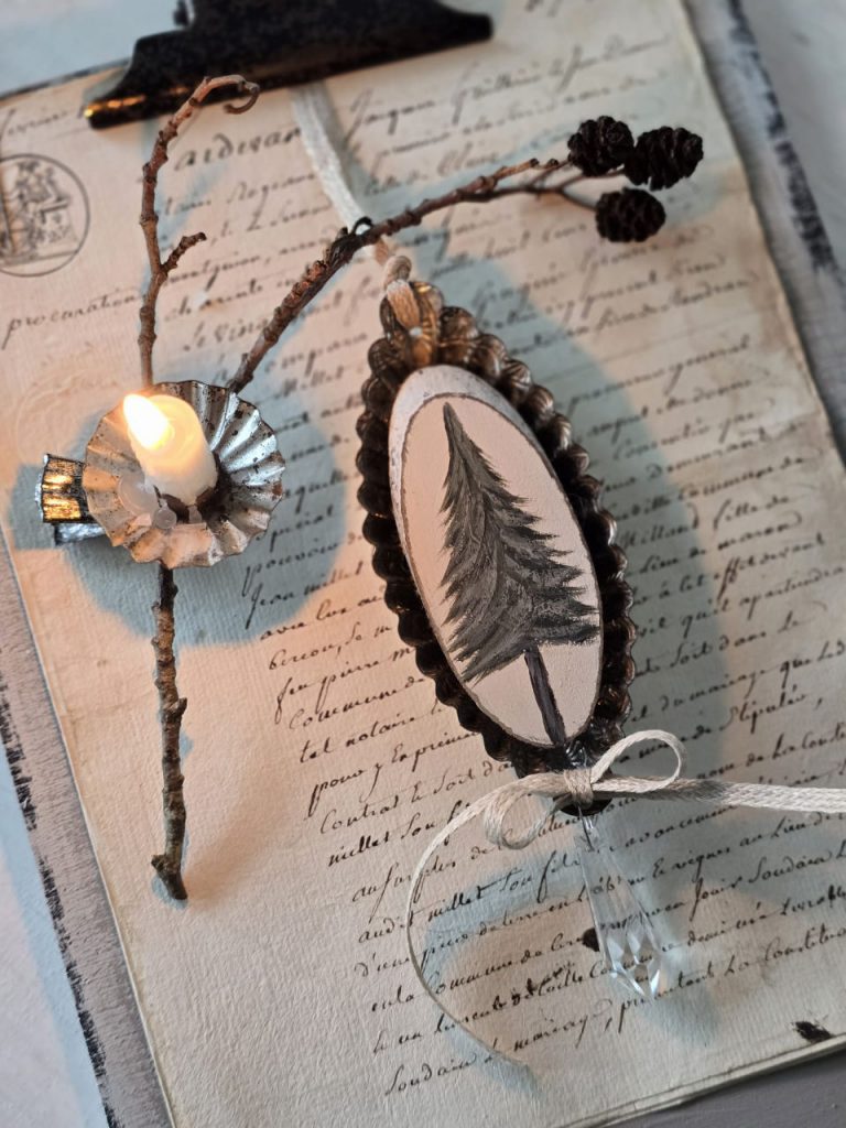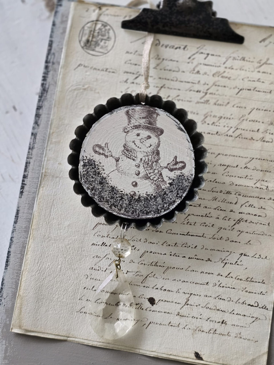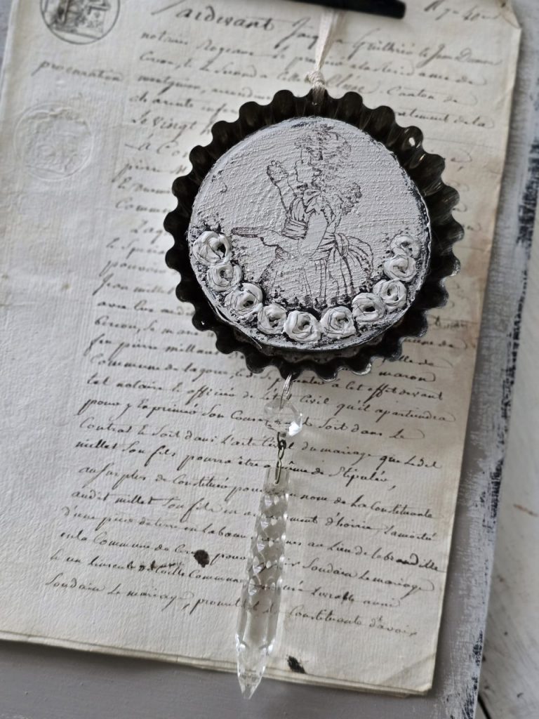 Hintergrund gestempelt, Vordergrund gemalt, eingefasst in einem antiken Tartelette-Förmchen und einer antiken Glasprisme.