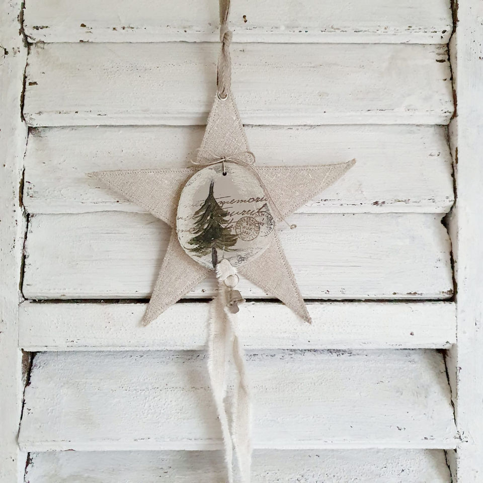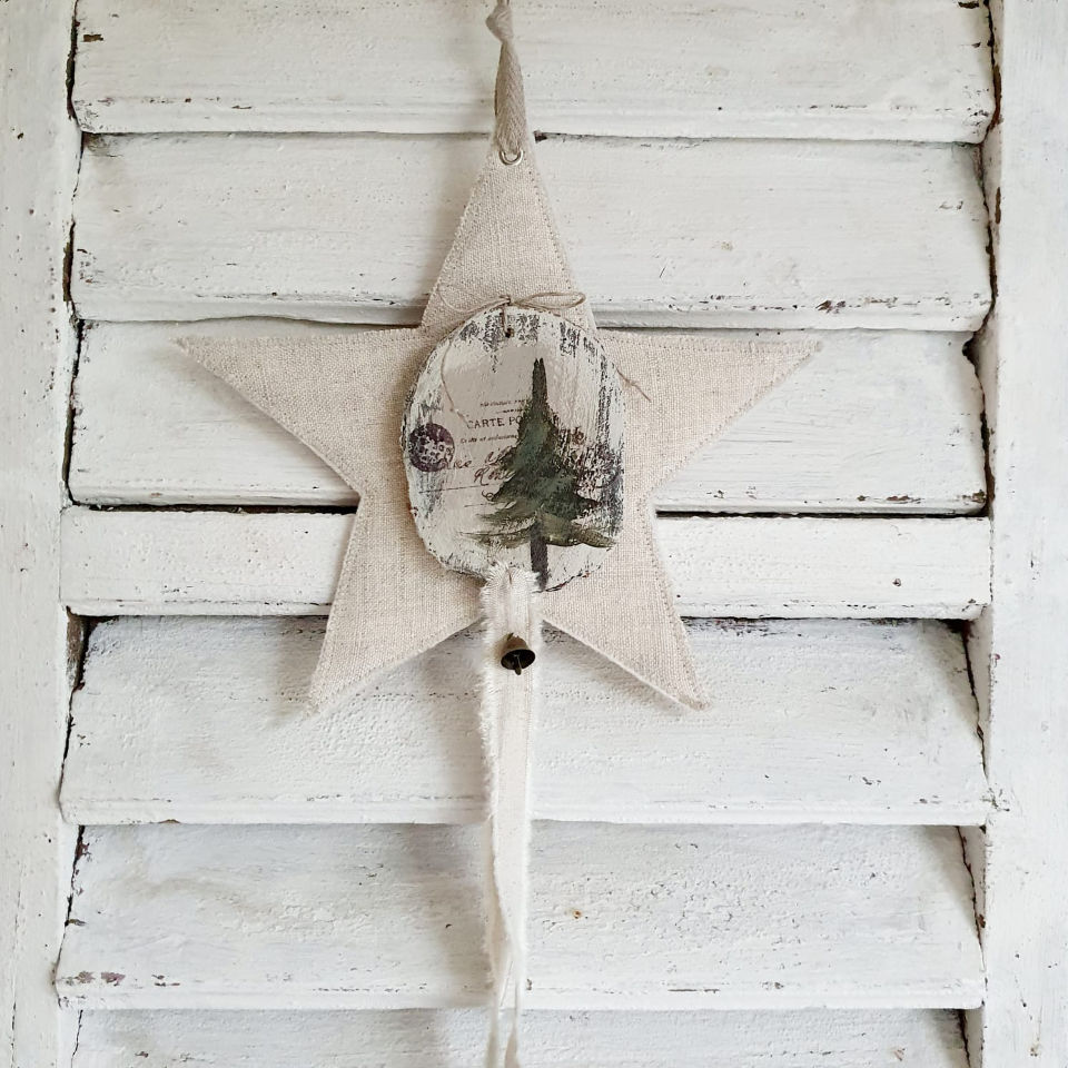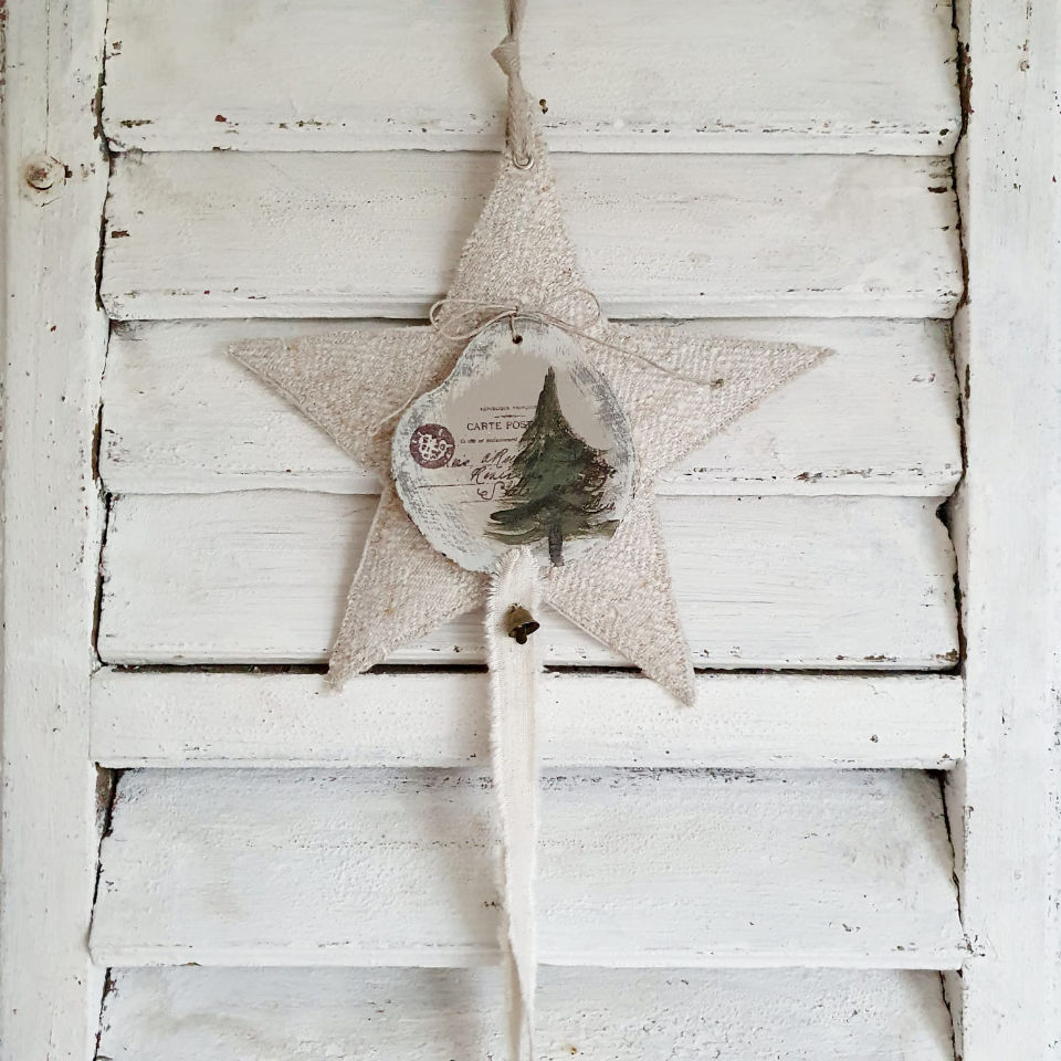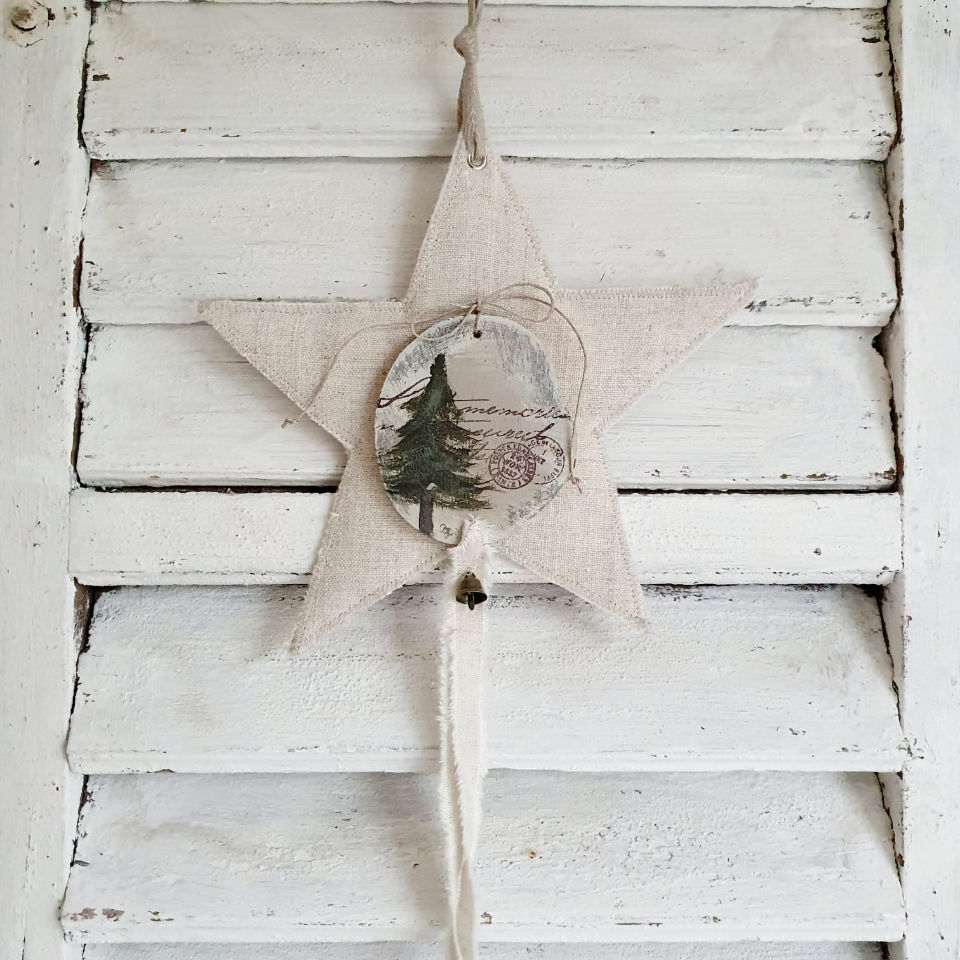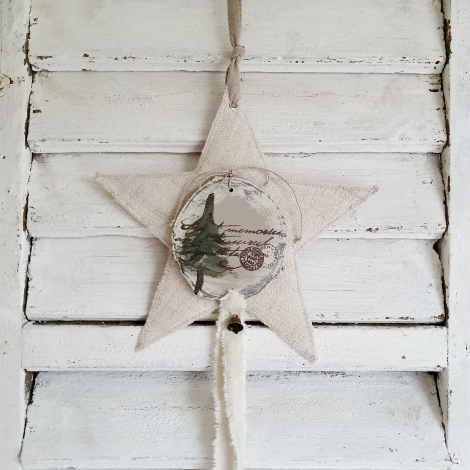 Weihnachtssterne aus antikem Leinenstoff treffen auf meine handbemalten Holzanhänger - eine zauberhafte Kombination.