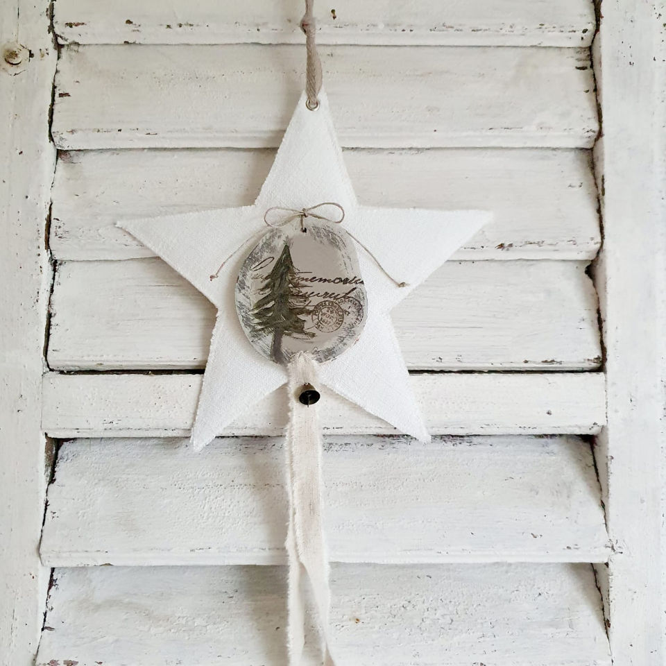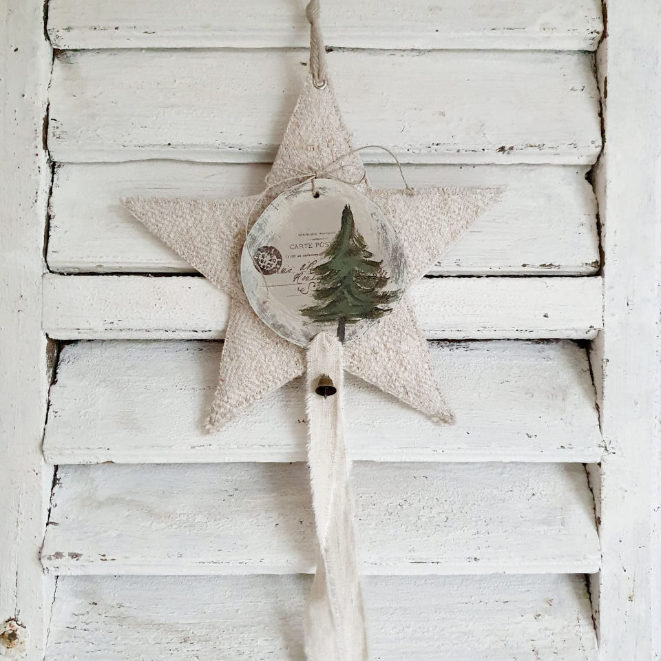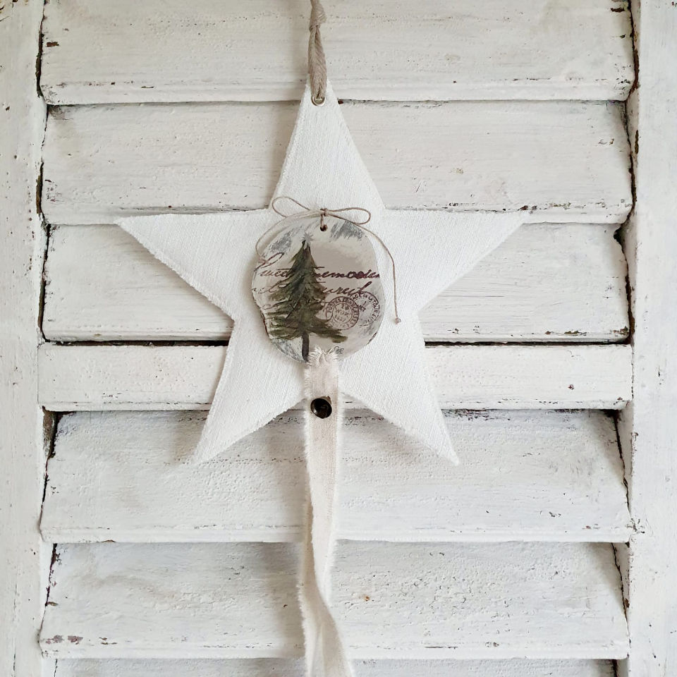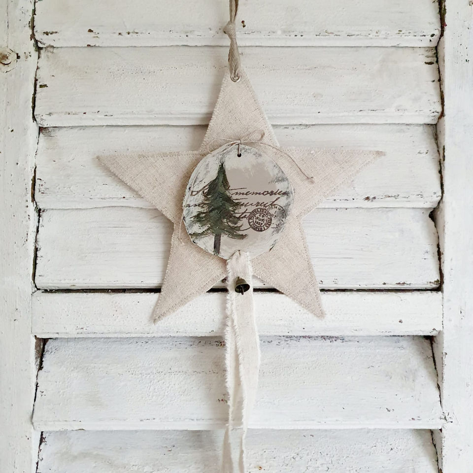 Weihnachtssterne aus antikem Leinenstoff treffen auf meine handbemalten Holzanhänger - eine zauberhafte Kombination.