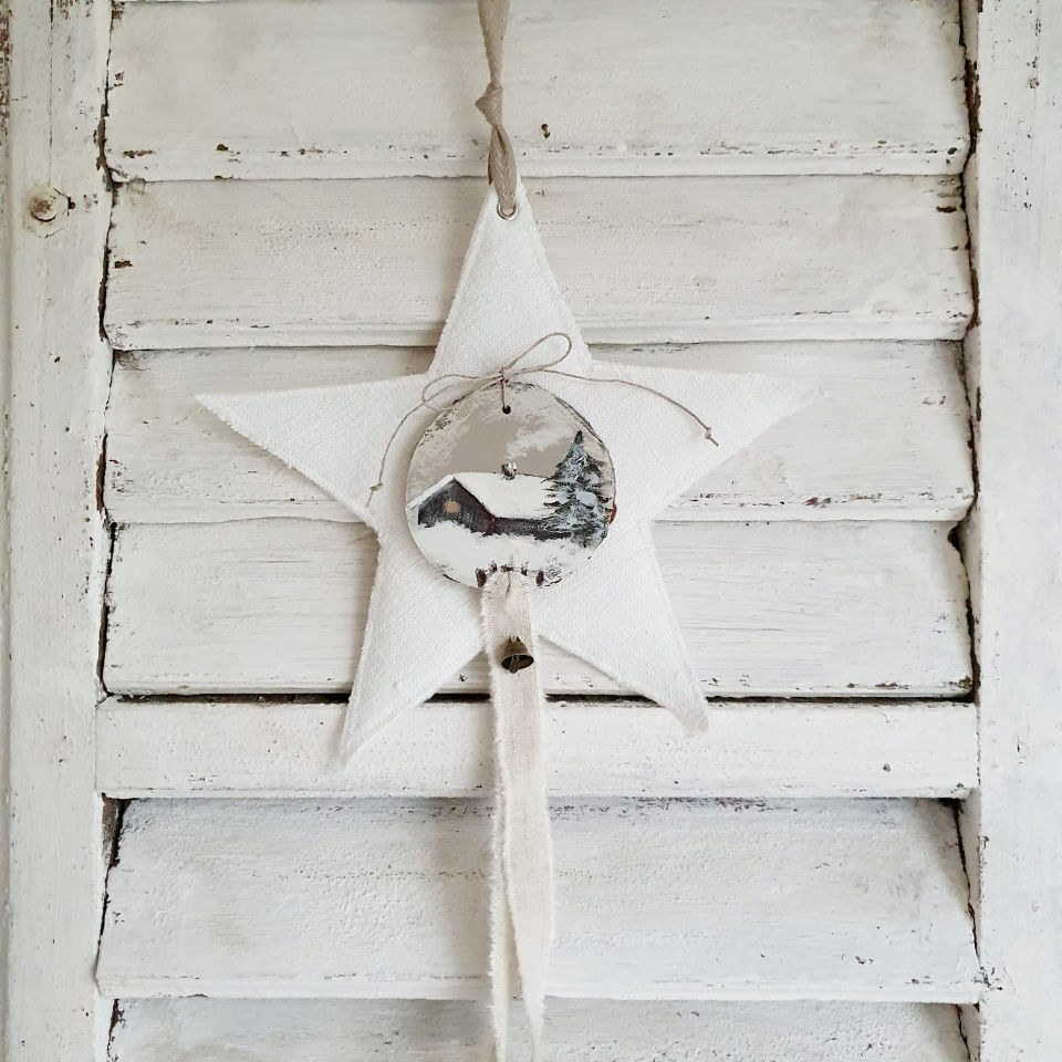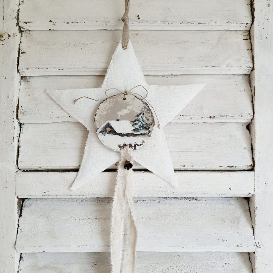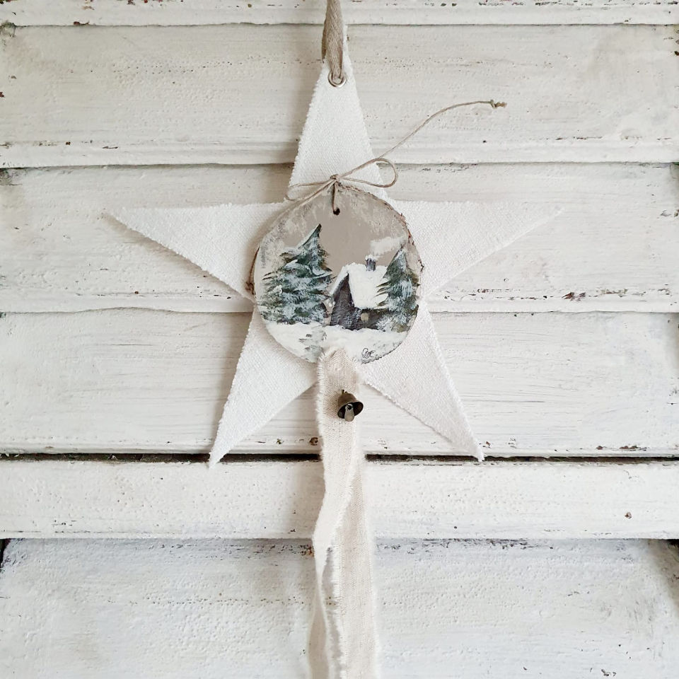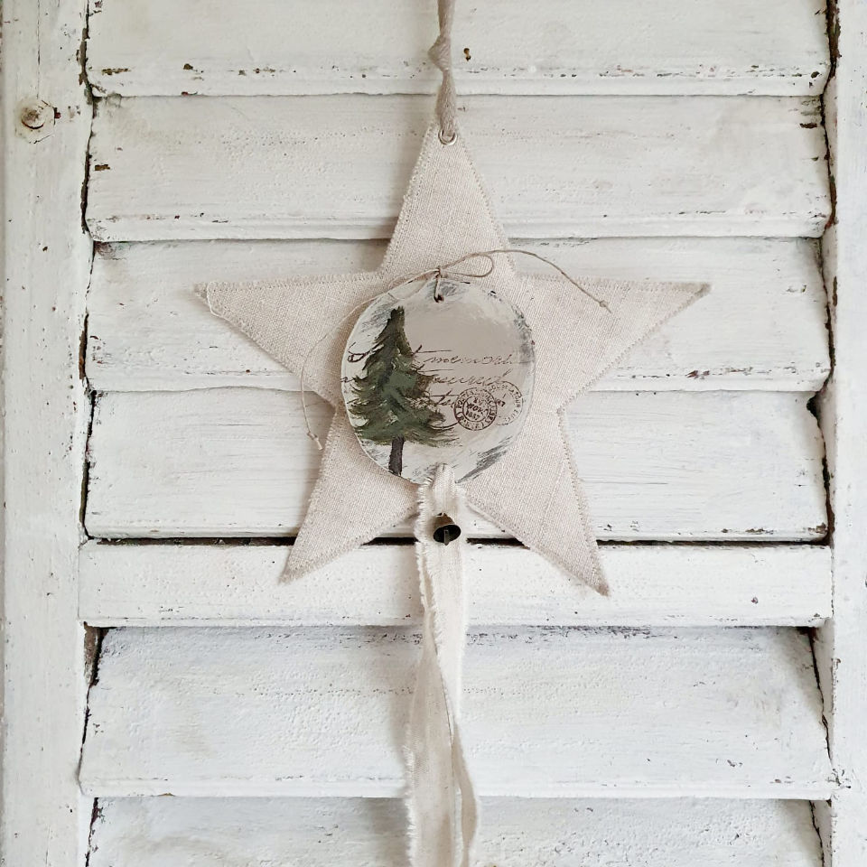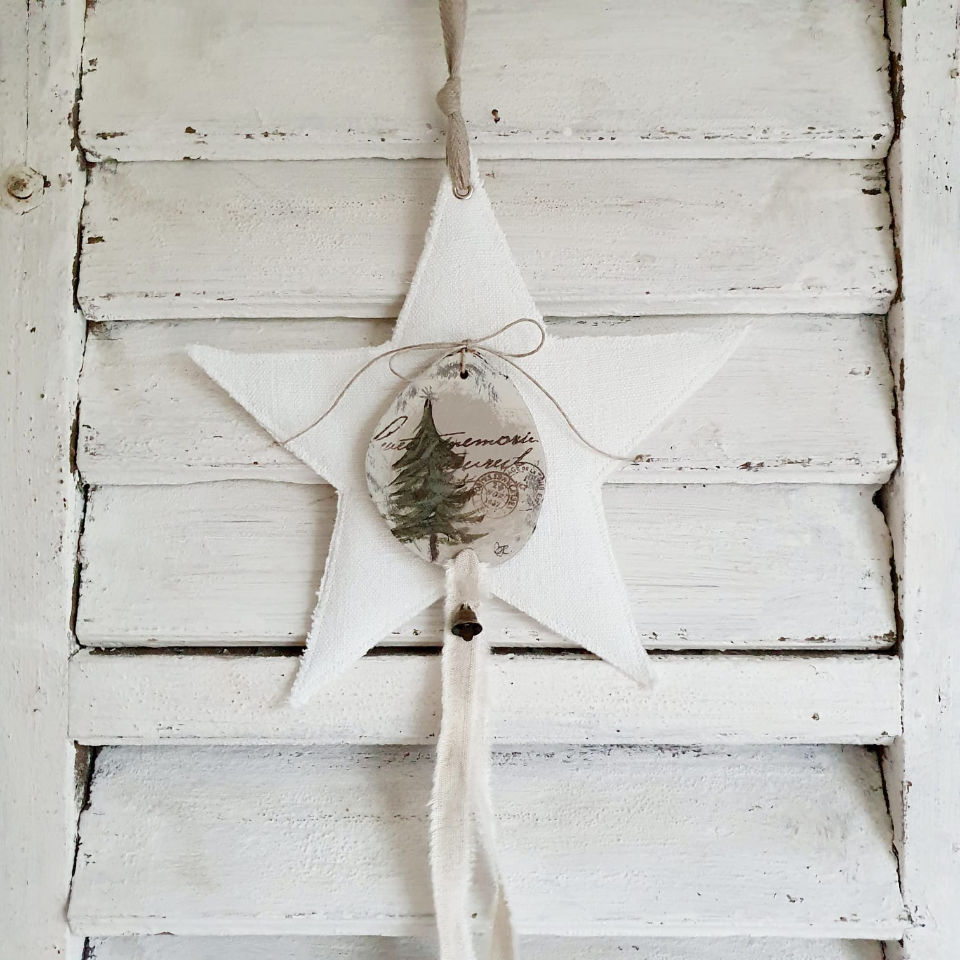 Weihnachtssterne aus antikem Leinenstoff treffen auf meine handbemalten Holzanhänger - eine zauberhafte Kombination.