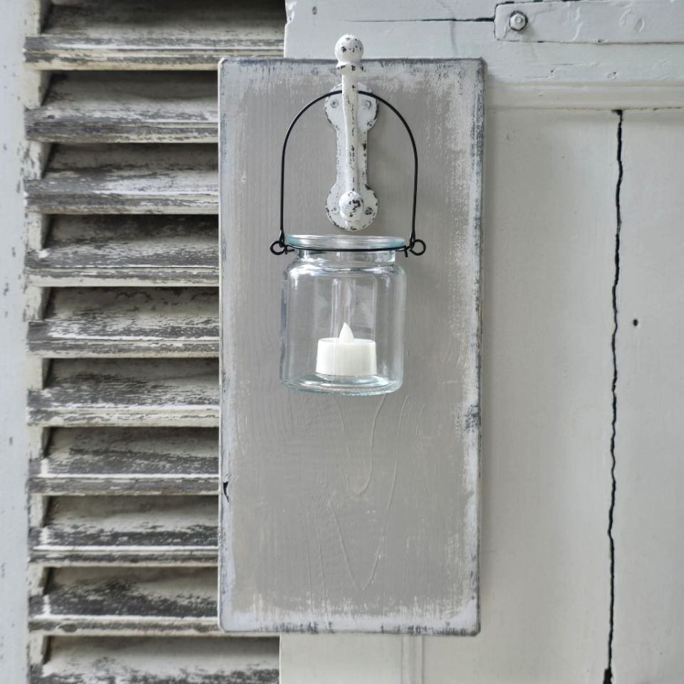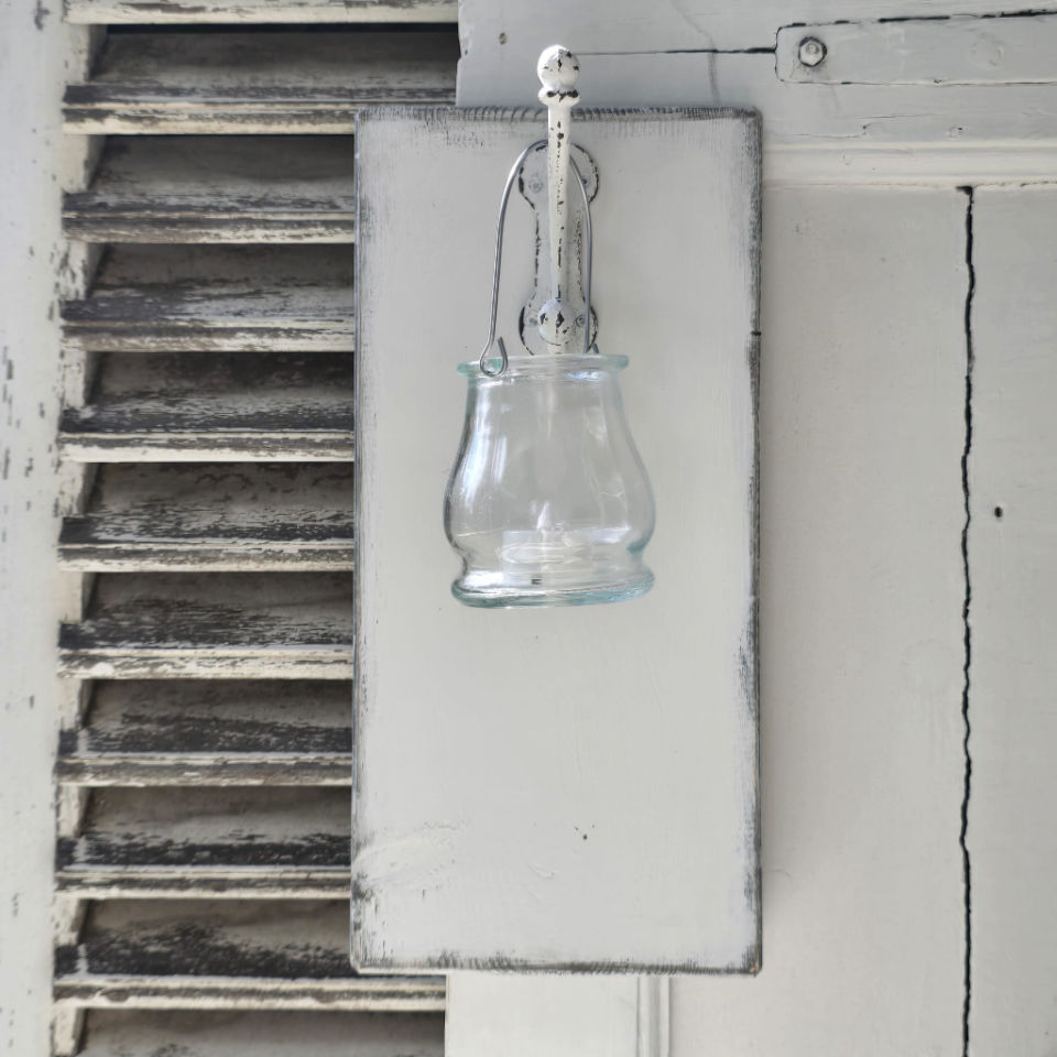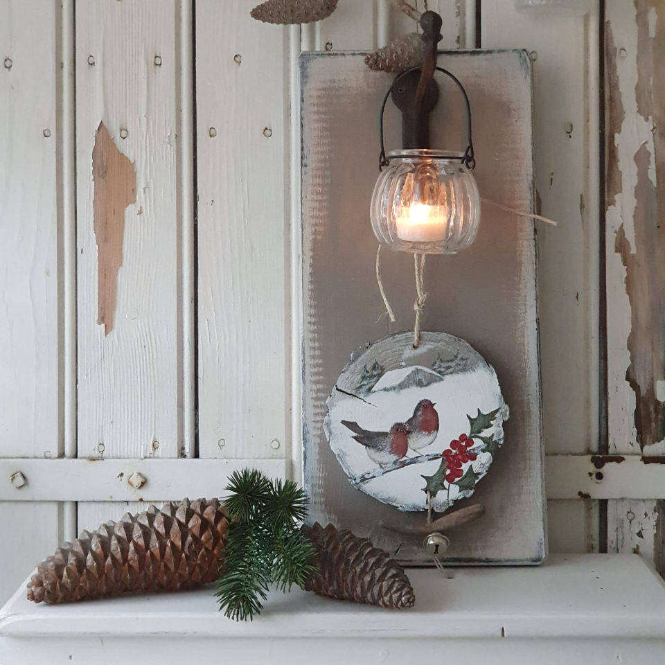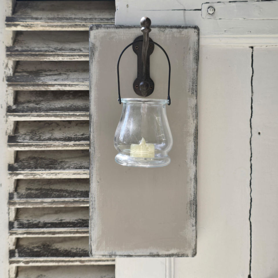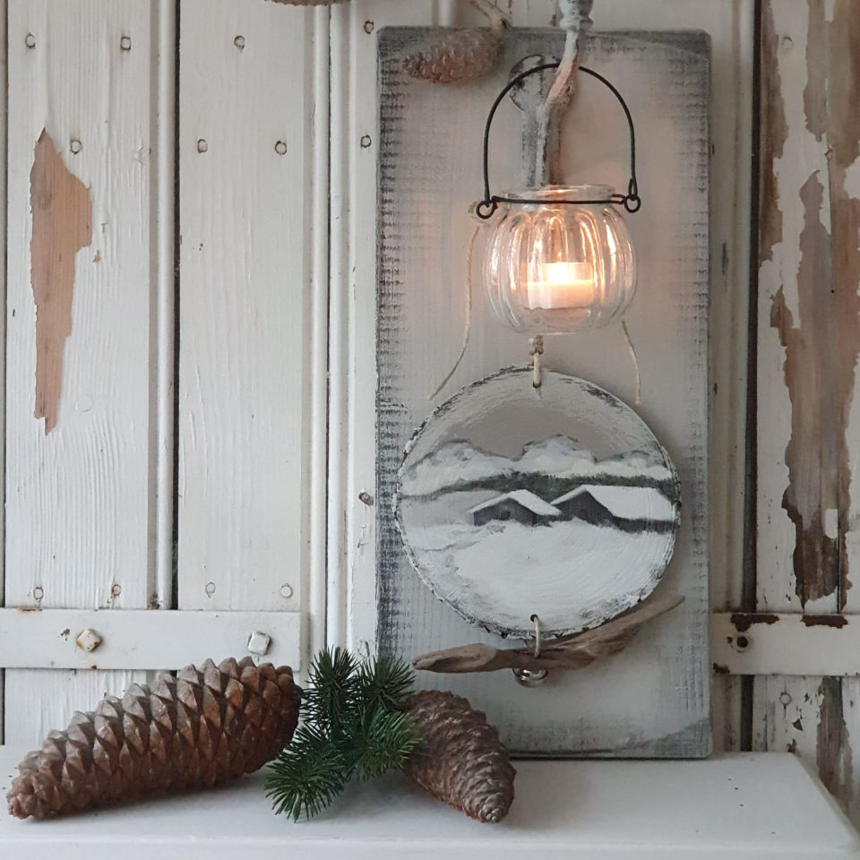Dekorative handbemalte Holzschilder mit Windlicht, jedes für sich ein Unikat.